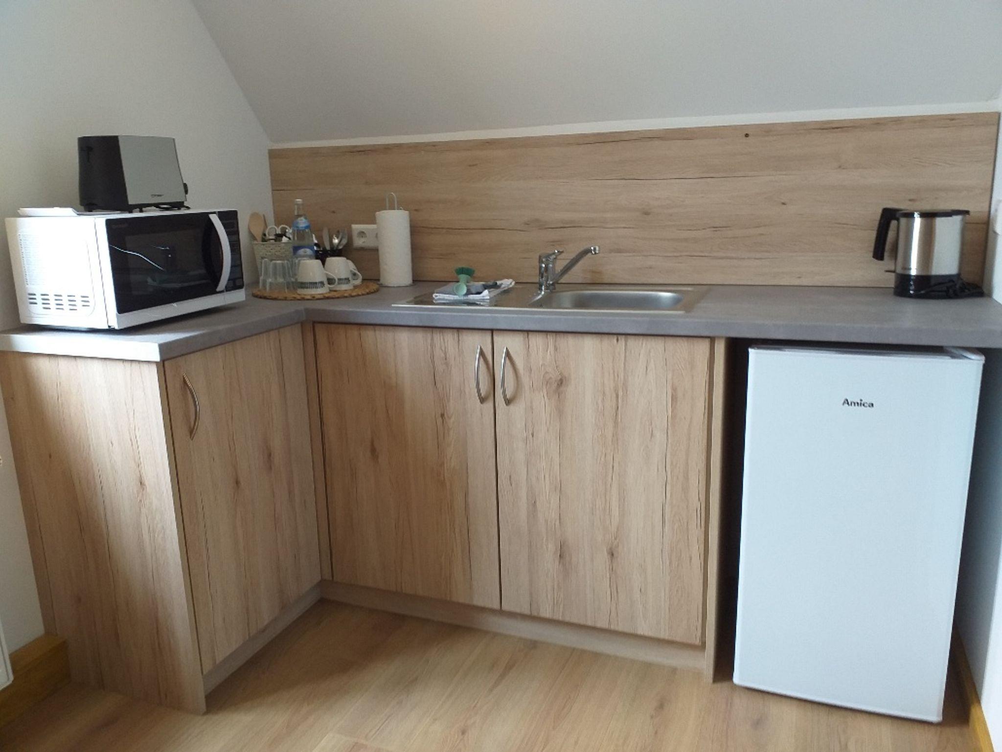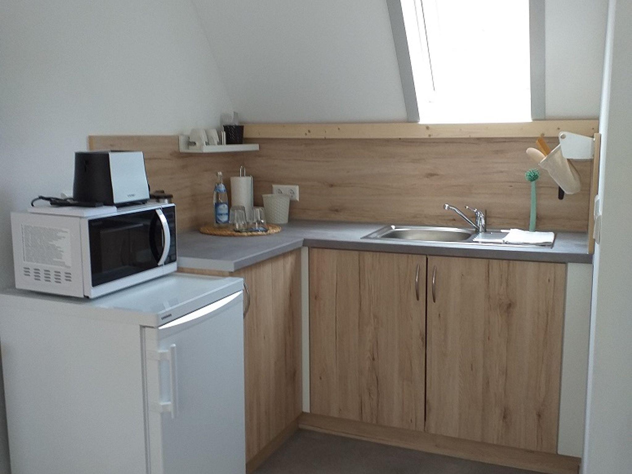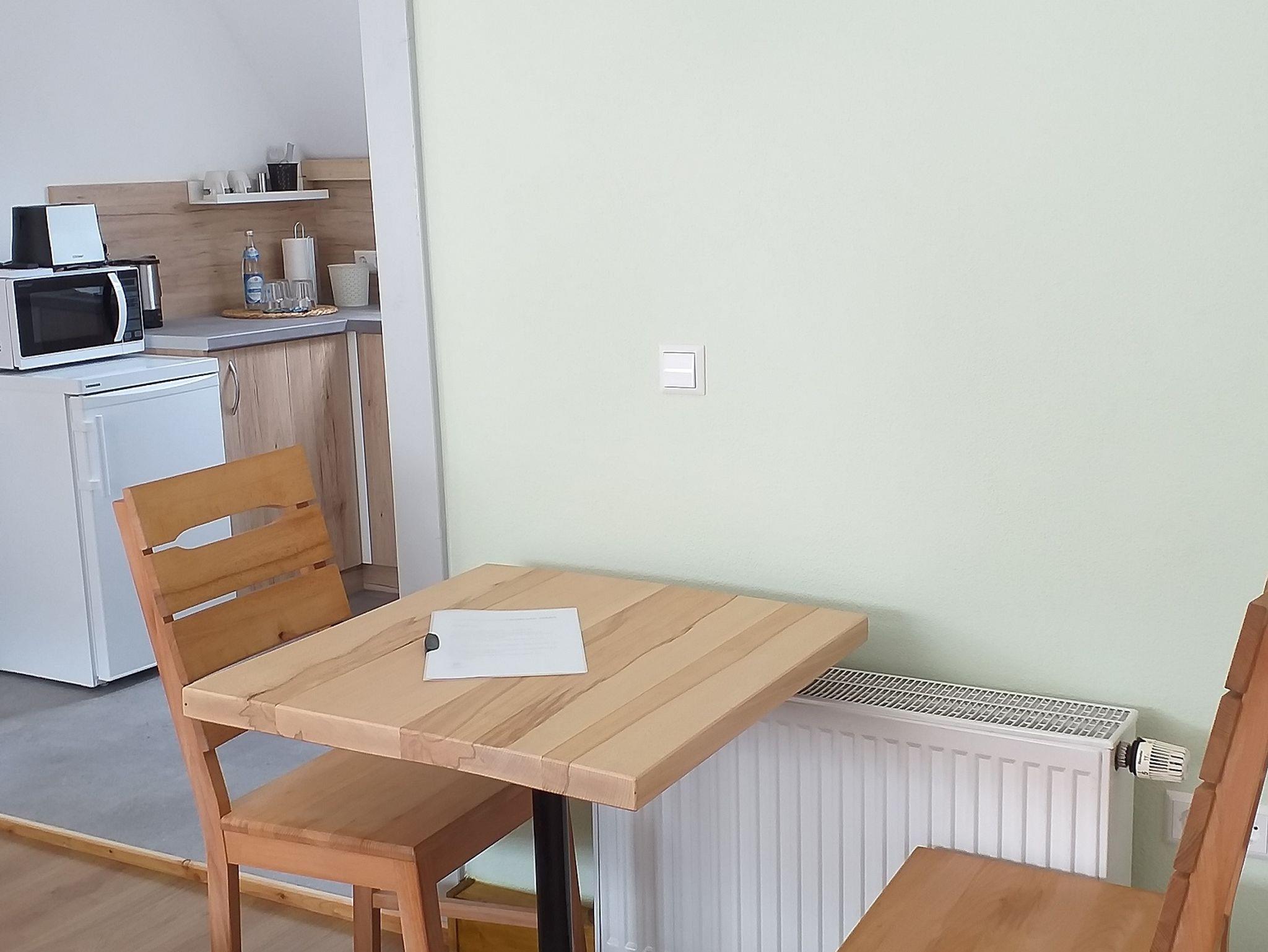 Die Zimmer verfügen über 24qm im ersten Stock mit sanierten Bädern einer Küchenzeile mit Toaster, Mikrowelle, Wasserkocher, Kühlschrank. Die Küche ist mit 2 Induktionsplatten ausgestattet.