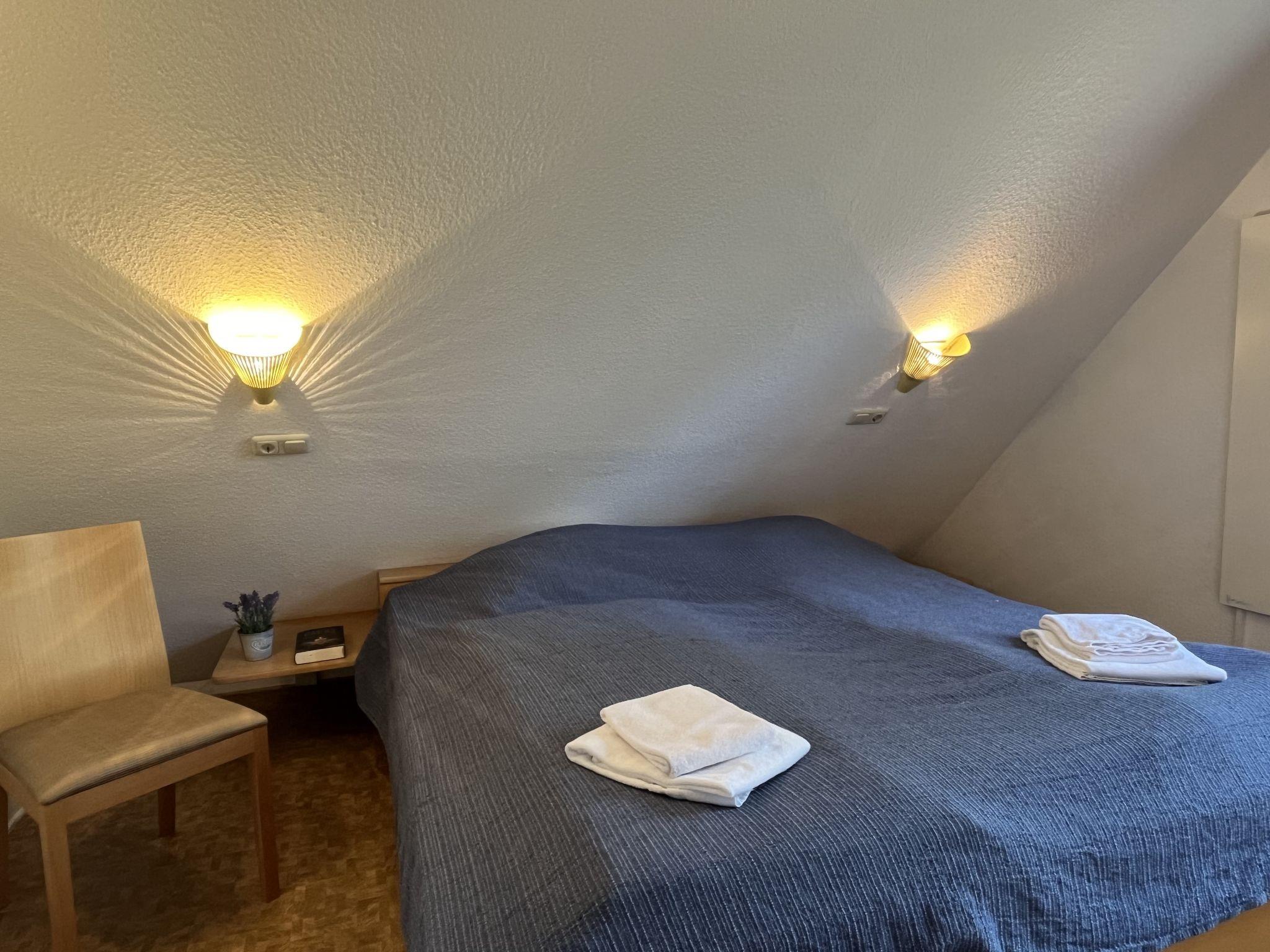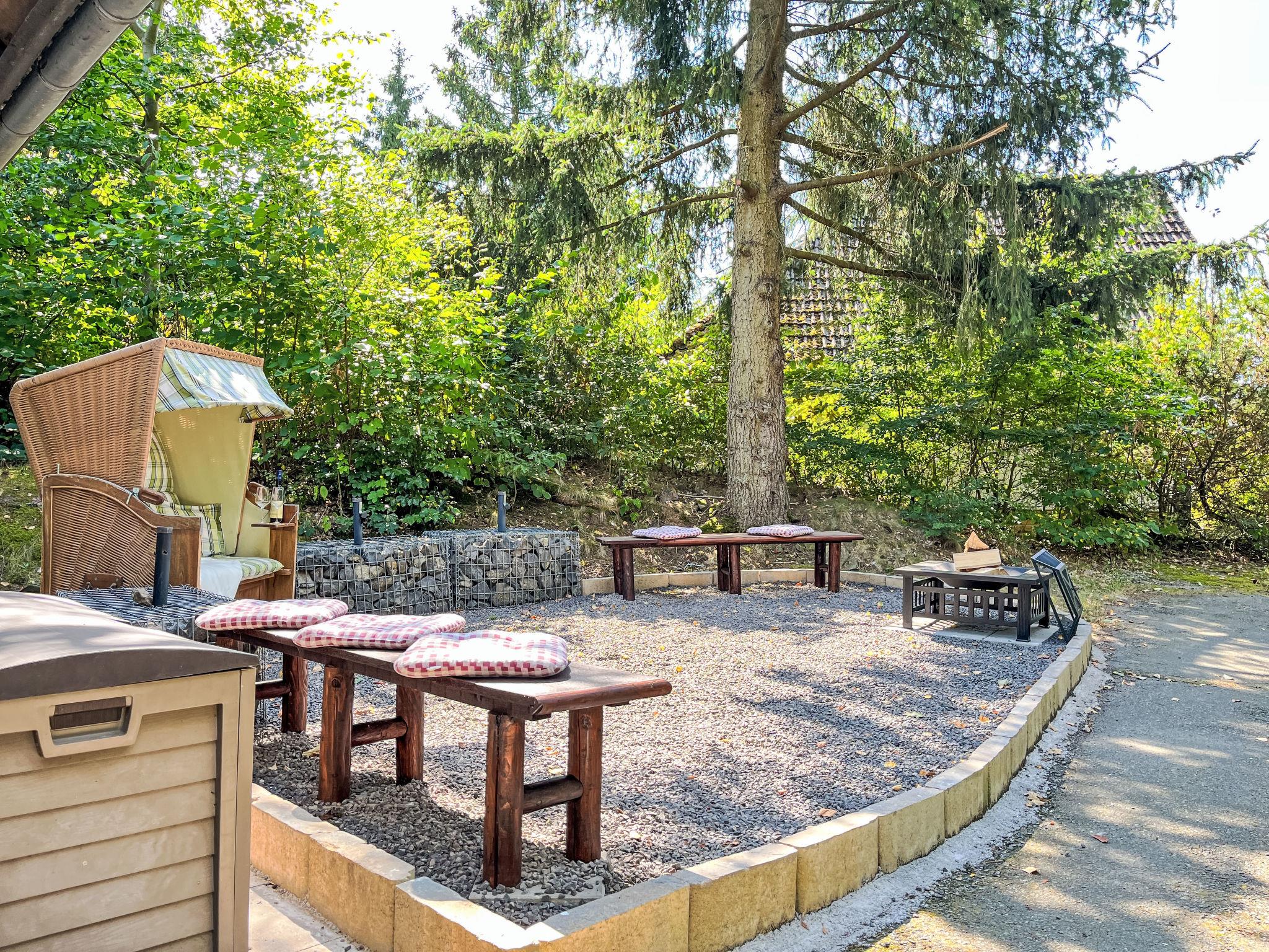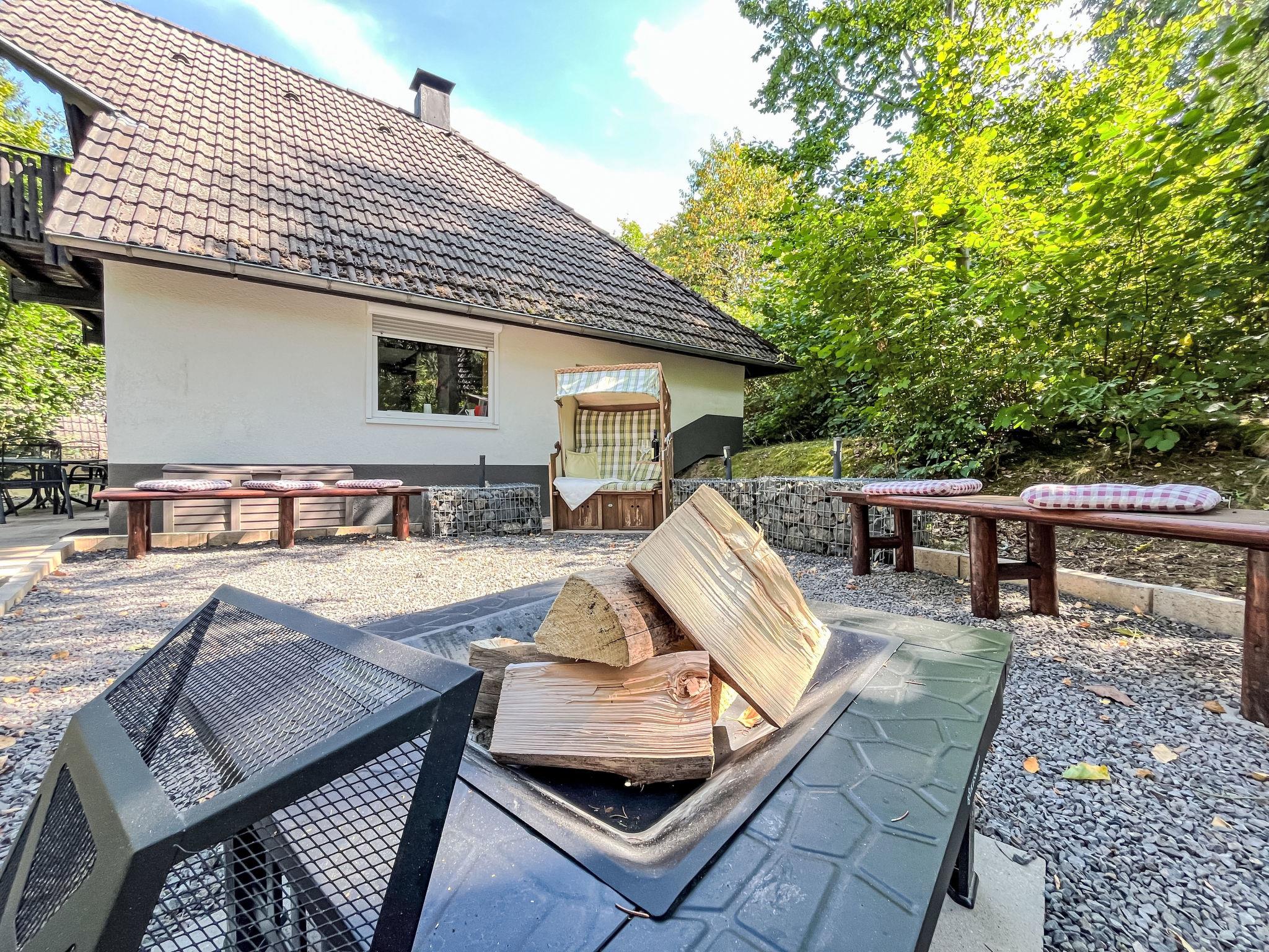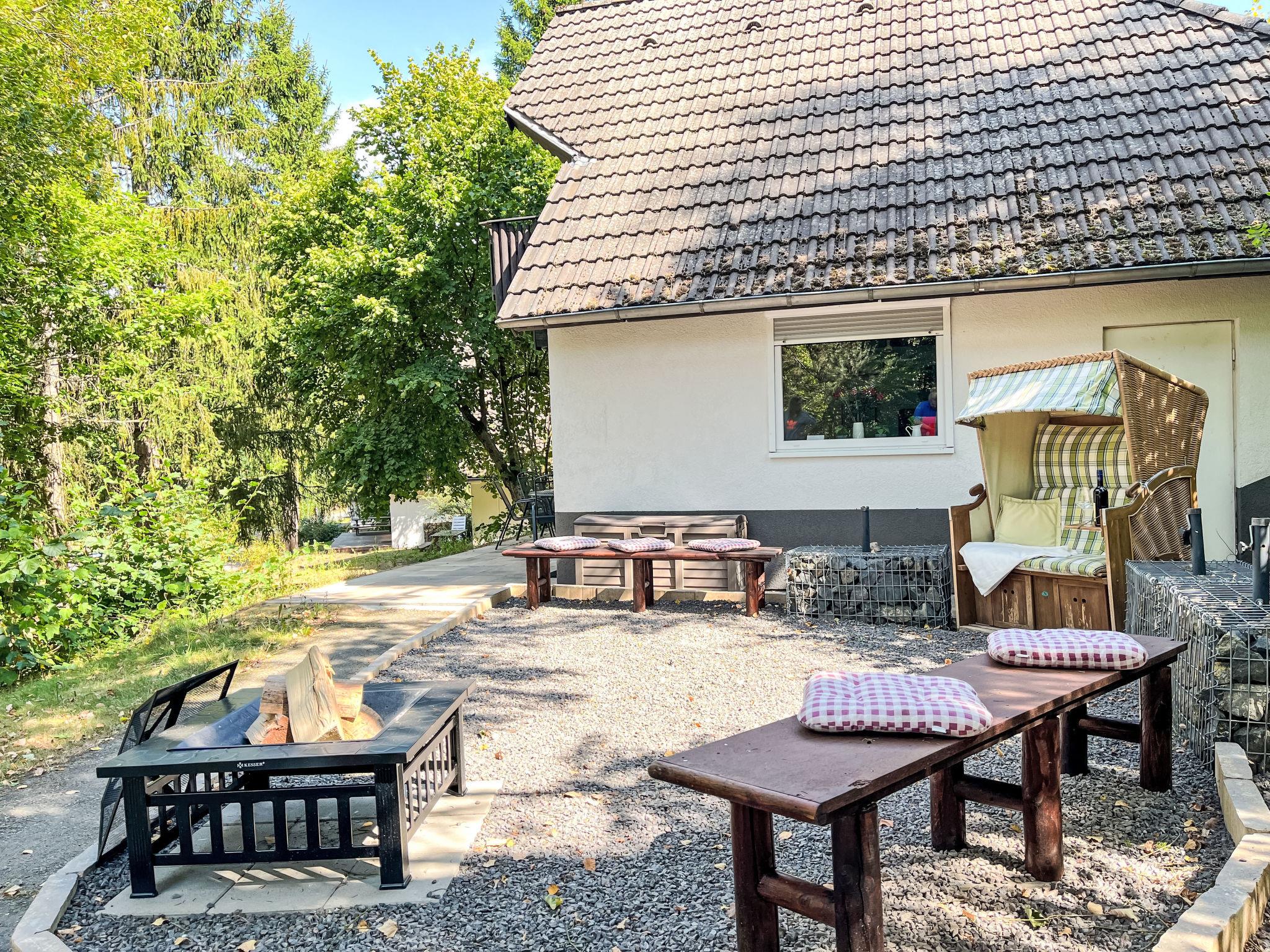 "Sorgenfrei", 4-room house 75 m2 on 2 levels, on the ground floor. Modern and wooden furniture furnishings: living/dining room 25 m2 with cable TV (flat screen), hi-fi system and wood-burning stove. Exit to the terrace, to the patio. 1 room 12 m2 with 1 double bed (180 cm, length 200 cm), hand-basin and separate WC. Open kitchen 8 m2 (oven, dishwasher, 4 ceramic glass hob hotplates, microwave, electric coffee machine, Capsules for coffee machine (Senseo)). Shower/WC. Upper floor: (spiral staircase), 1 room 12 m2, with sloping ceilings with 1 double bed (180 cm, length 200 cm). Exit to the balcony. 1 room 11 m2, with sloping ceilings with 2 beds (90 cm, length 200 cm). Exit to the balcony. Electric heating. Small balcony 5 m2, south facing position, large terrace 30 m2 partly roofed, patio, lawn 100 m2. Terrace furniture, balcony furniture. Facilities: washing machine, children's high chair, hair dryer, logs (extra). Internet (WiFi, free). Please note: non-smoking house. Maximum 2 pets/ dogs allowed. Smoke alarm, fire extinguisher. Heating is provided by a cost-effective air/heat pump. On the ground floor, the rooms are connected by stairs (mezzanine).