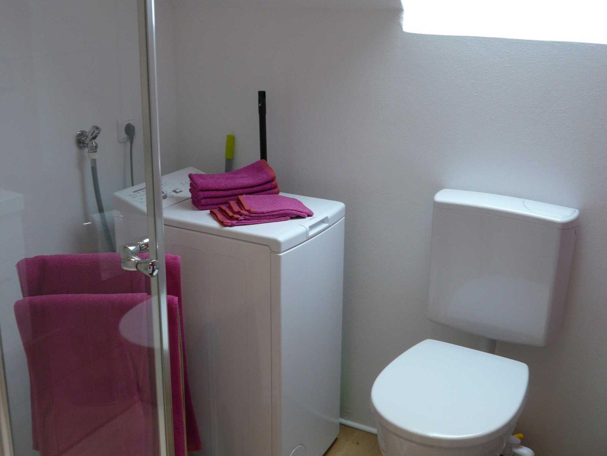 Die modernisierte und helle Ferienwohnung befindet sich im Dachgeschoß eines Ferienhauses und hat eine Grundfläche von ca. 67 qm. Die Wohnung ist ausgestattet für drei Personen. Über zwei Stufen und dem Zugangssteg auf der Nordseite erreichen Sie den separaten Eingang. Nach dem Öffnen der Eingangstür stehen Sie in einem kleinen Flur mit Garderobe, links davon befindet sich das Badezimmer mit Dusche, WC, Spiegel und Waschtisch. Fön, Kosmetikspiegel Handtücher und eine kleine Waschmaschine gehören zur Ausstattung dazu. Die Dusche ist ebenerdig angelegt.