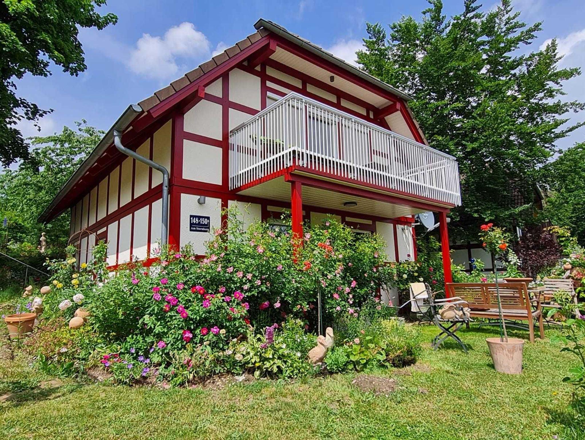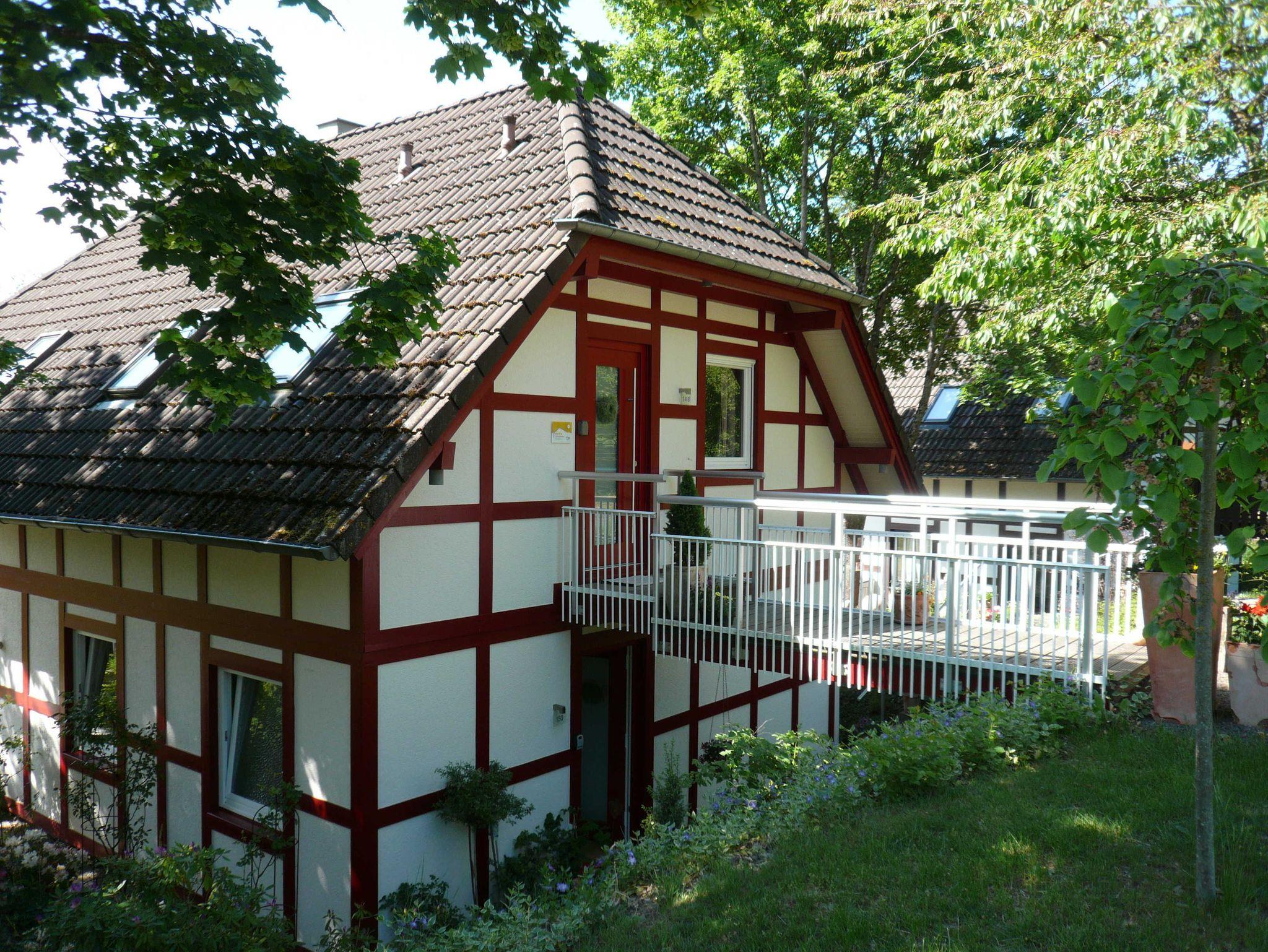 Das Haus ist mit Blumenbeeten und Rasenflächen eingefasst, in dem im Sommer die Rosen ein ländliches nostalgisches Ambiente schaffen. Die Blumen und das in hessisch-rot gestrichene Fachwerk ist einmalig im Feriendorf.