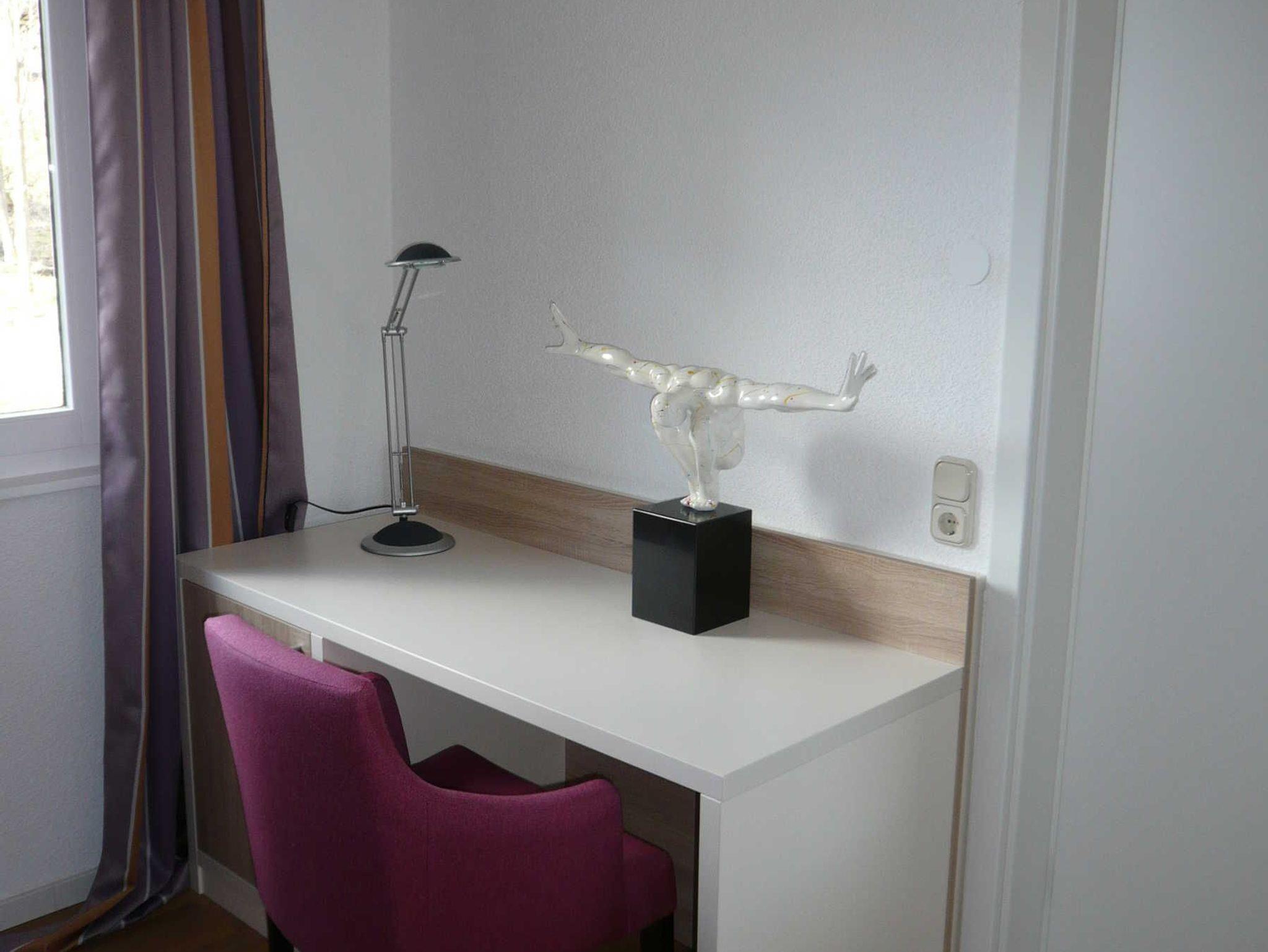 Die Ferienwohnung ist über nur zwei Stufen ebenerdig von der Nordseite zu erreichen. Das Auto parken Sie direkt gegenüber dem Eingang wenige Meter entfernt. Die Schlüsselbereitstellung mit einem Schlüssel-Tresor schafft Unabhängigkeit und ermöglicht eine flexible Anreise. Die Wohnung ist hell, freundlich und farblich abgestimmt gestaltet. Zwei moderne Schlafzimmer mit Hotelbetten, die frisch bezogen Sie zum Ausruhen nach einem erlebnisreichen Tag einladen, sind für Sie vorbereitet. Beide Räume haben Verdunkelungsmöglichkeiten. Das kleine Bad mit ebenerdiger Duschtasse, einer Toilette die eine höhere Sitzfläche auszeichnet, weiße Badmöbel vor einer Fuchsia-roten Wand schaffen Moderne, Kontrast und Wärme. Eine kleine Waschmaschine für die tägliche Kleinwäsche ist im Raum integriert.