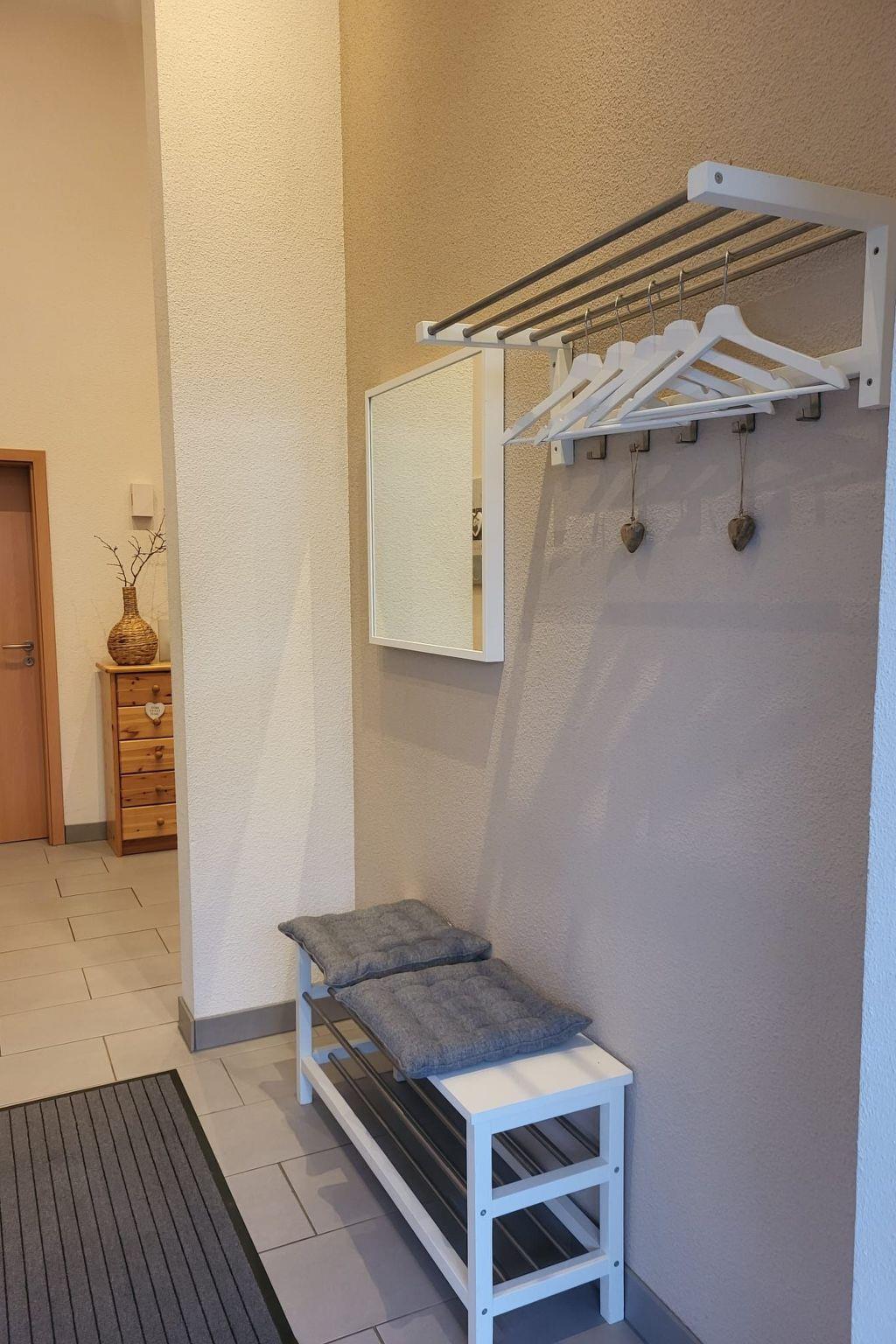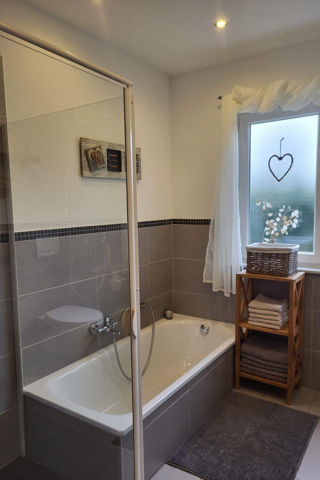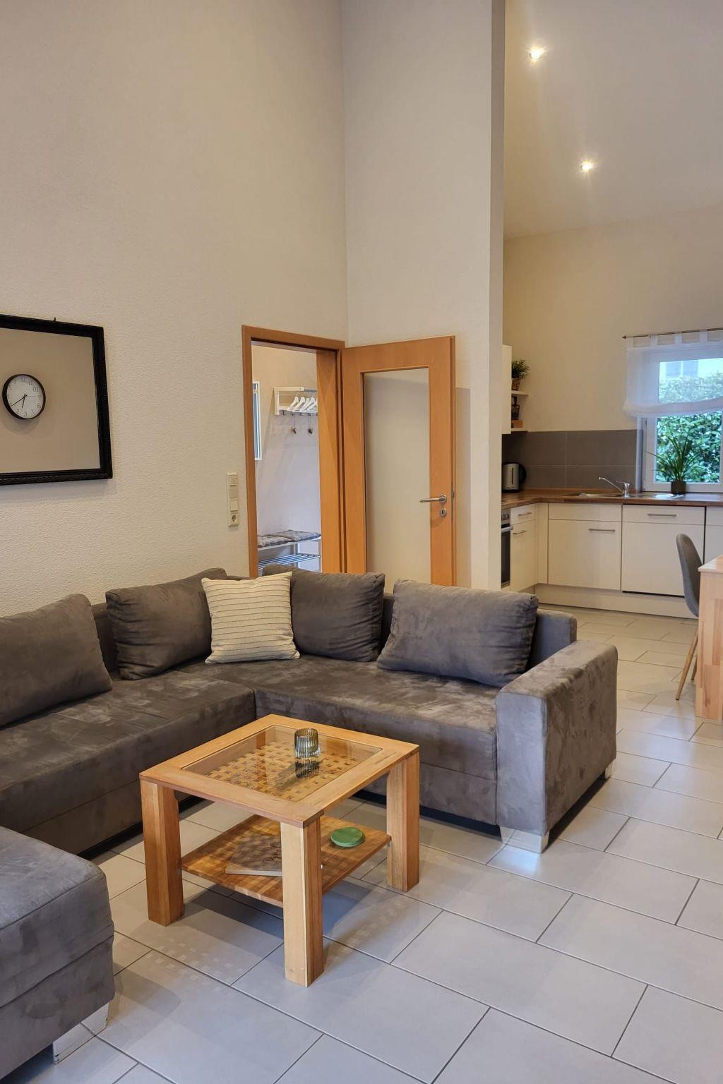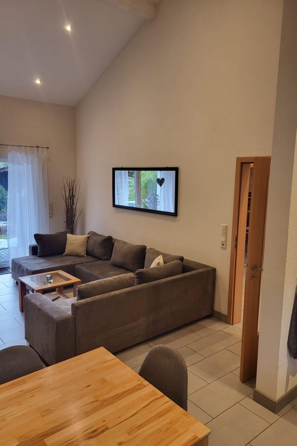 Here you are renting a 79m² holiday house with a living room and a well-equipped kitchen with a dining table. A bathroom with a bathtub, barrier-free shower and WC is also available. A hallway and two bedrooms, one with a double bed and the other with a single bed and a bunk bed, as well as an open gallery with two beds. Wi-Fi Internet, a dishwasher, tea towels, hairdryer, iron, ironing board, three TVs, electric blinds, a washing machine (payable), a cot and underfloor heating are available.