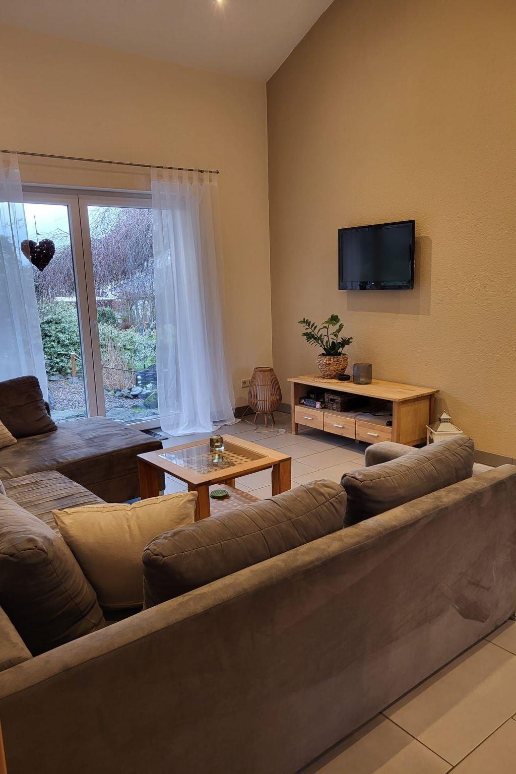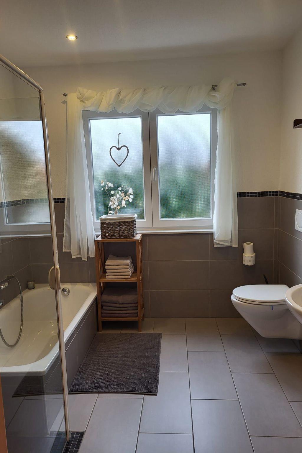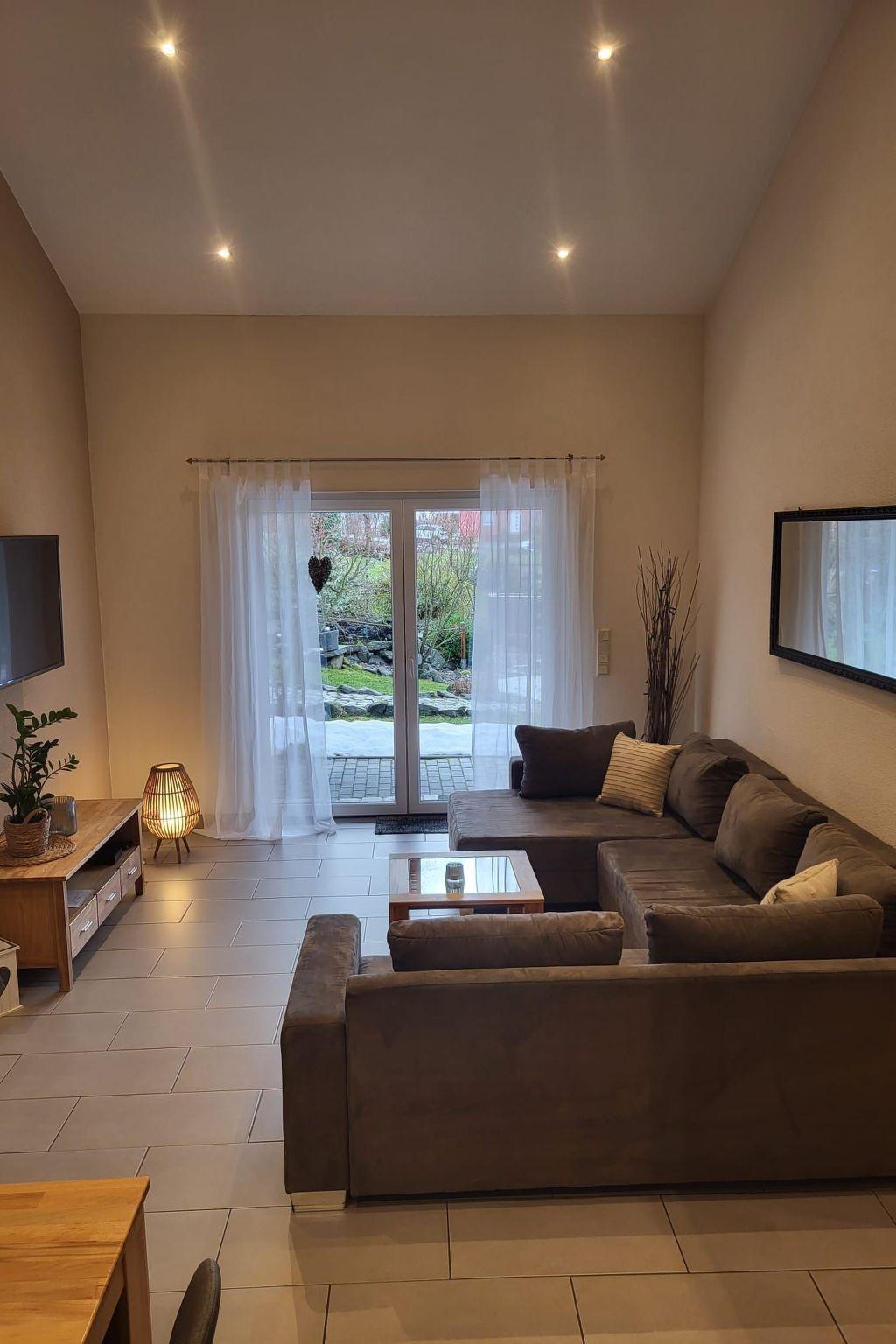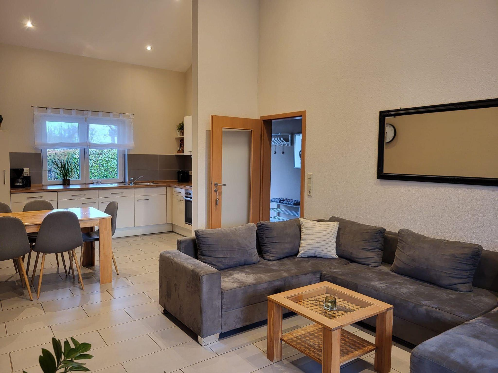 Here you are renting a 79m² holiday house with a living room and a well-equipped kitchen with a dining table. A bathroom with a bathtub, barrier-free shower and WC is also available. A hallway and two bedrooms, one with a double bed and the other with a single bed and a bunk bed, as well as an open gallery with two beds. Wi-Fi Internet, a dishwasher, tea towels, hairdryer, iron, ironing board, three TVs, electric blinds, a washing machine (payable), a cot and underfloor heating are available.