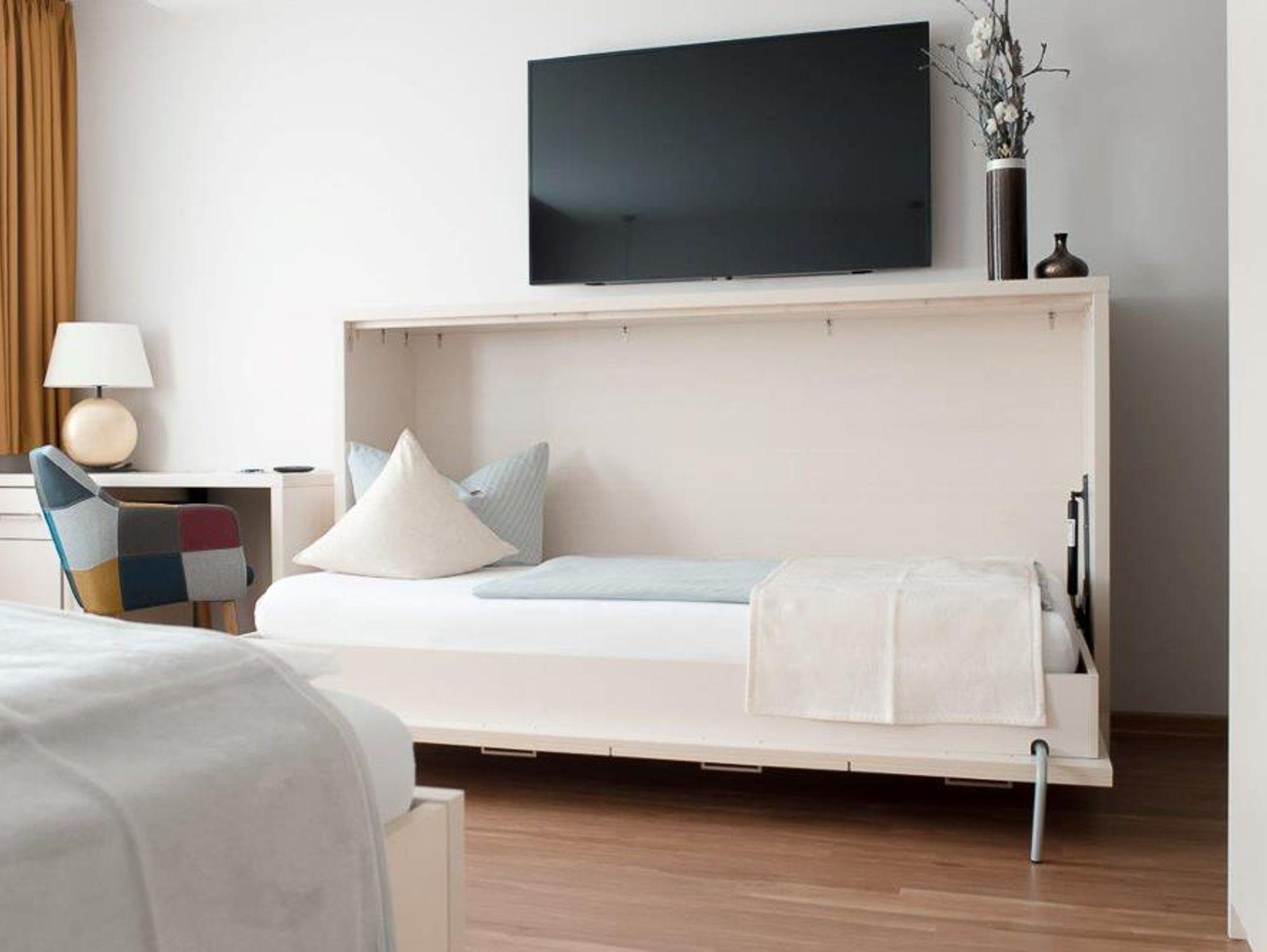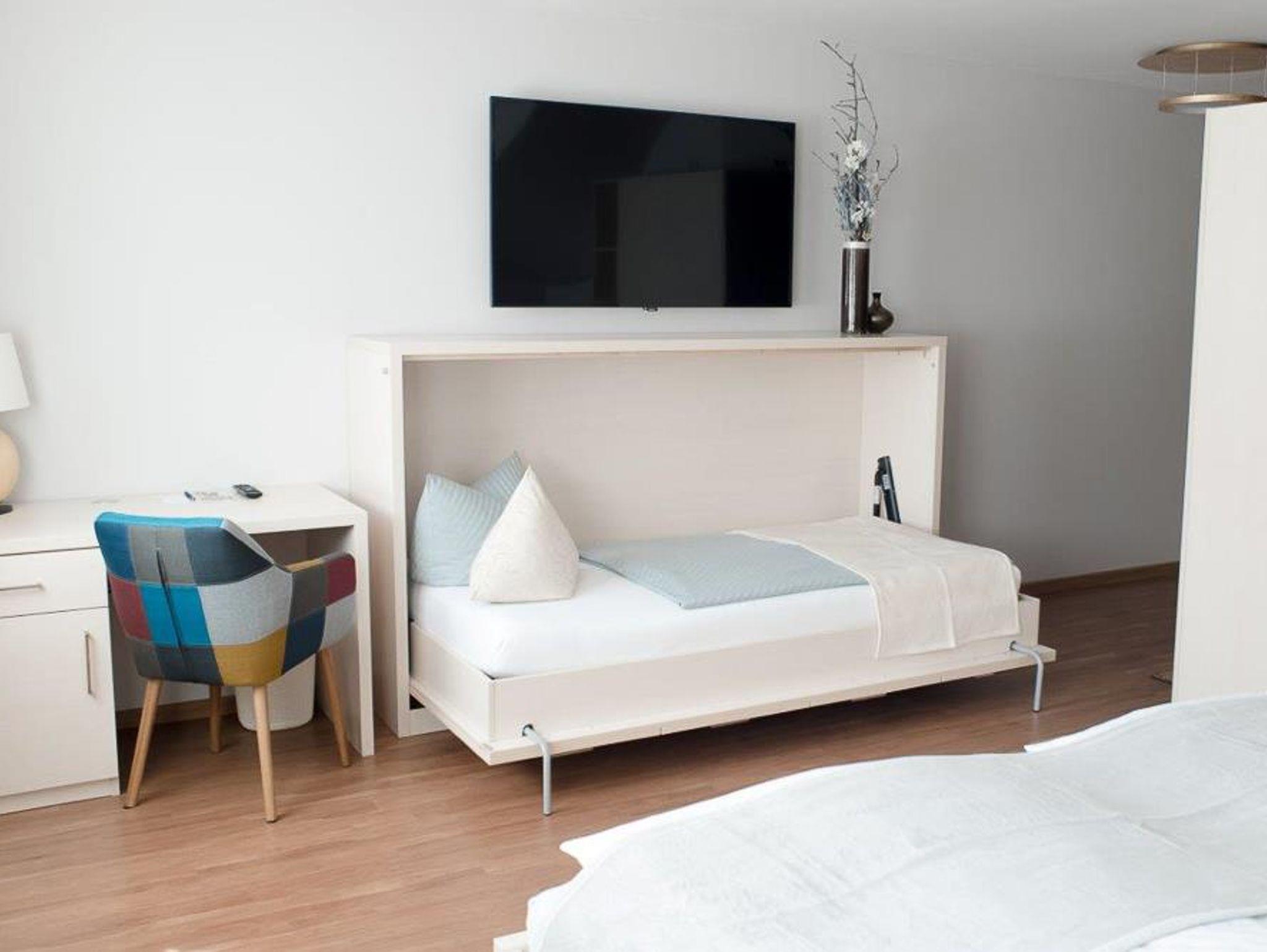 Bestehend aus einem Schlaf- und Wohnraum mit Doppelbett und Schrankbett für bis zu 3 Personen, einer kleinen Küchenzeile und einem Badezimmer mit ebenerdiger Dusche.