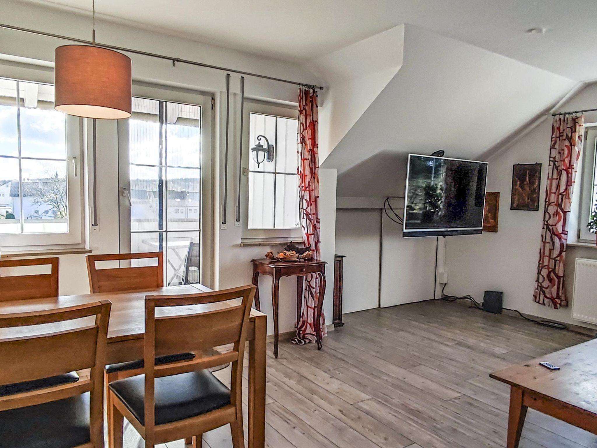 Sehr schöne 54 m2 große, helle und zentrumsnah gelegene 2-Zimmer-Dachgeschosswohnung in Freudenstadt für eine Auszeit als Paar oder Allein. Ihr Auto stellen Sie in der Tiefgarage ab (Zugang von außen mit dem Wohnungsschlüssel für das Rolltor) und gelangen trocken über das Treppenhaus in die Wohnung. Fühlen Sie sich wohl inmitten des Schwarzwaldes und blicken Sie vom überdachten Balkon aus rechts auf den Finkenberg.