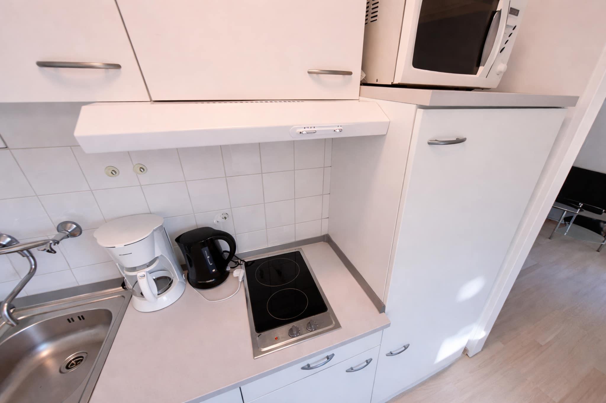 I 4. etasje: (Kjøkken(komfyr med kokeplater(elektrisk), vannkoker, brødrister, kaffetrakter, mikrobølgeovn, kjøleskap(+ fryser)), Stue/soverom(1 persons sovesofa, 2 personers sammenleggbar seng, TV), bad(dusj, håndvask, toalett, Hårtørker), balkon) garasje, tørketrommel(betalt), sprinkelseng, badstue(deles med andre gjester), vaskemaskin(betalt), hage, hagemøbler, parkering, svømmebasseng(deles med andre gjester, innendørs), lekeområde, sklie, heis, leketøy, Huskestativ, Ladestolpe for el-biler, Håndklær/sengetøy (inkl.)
