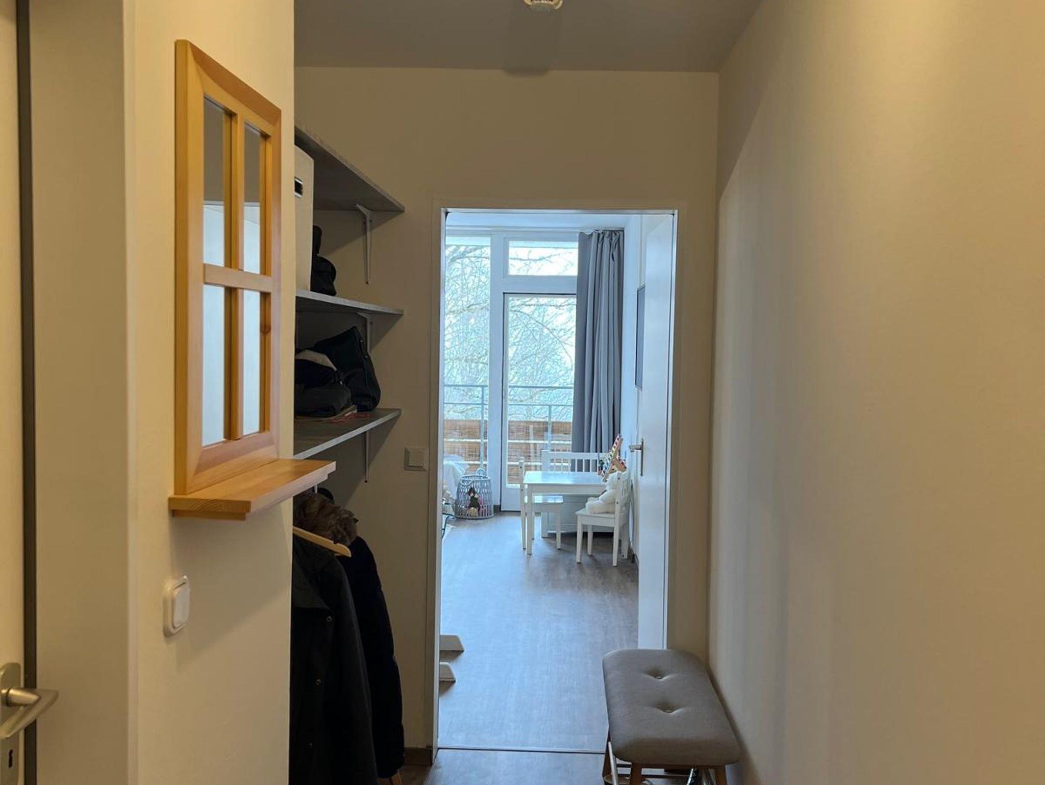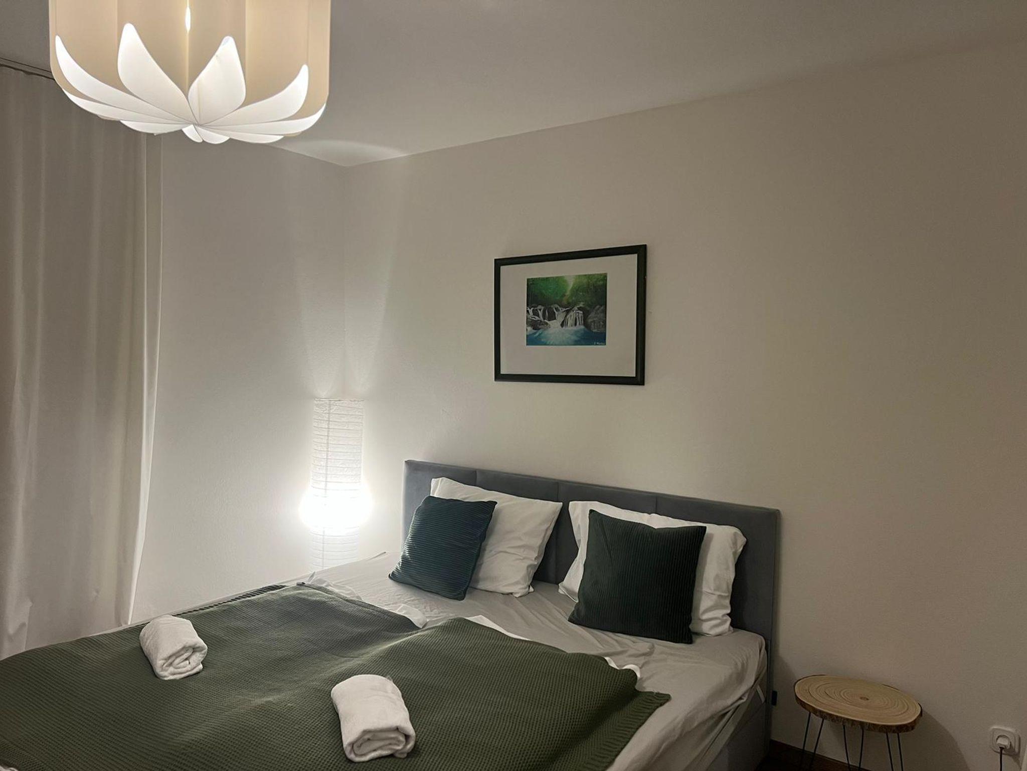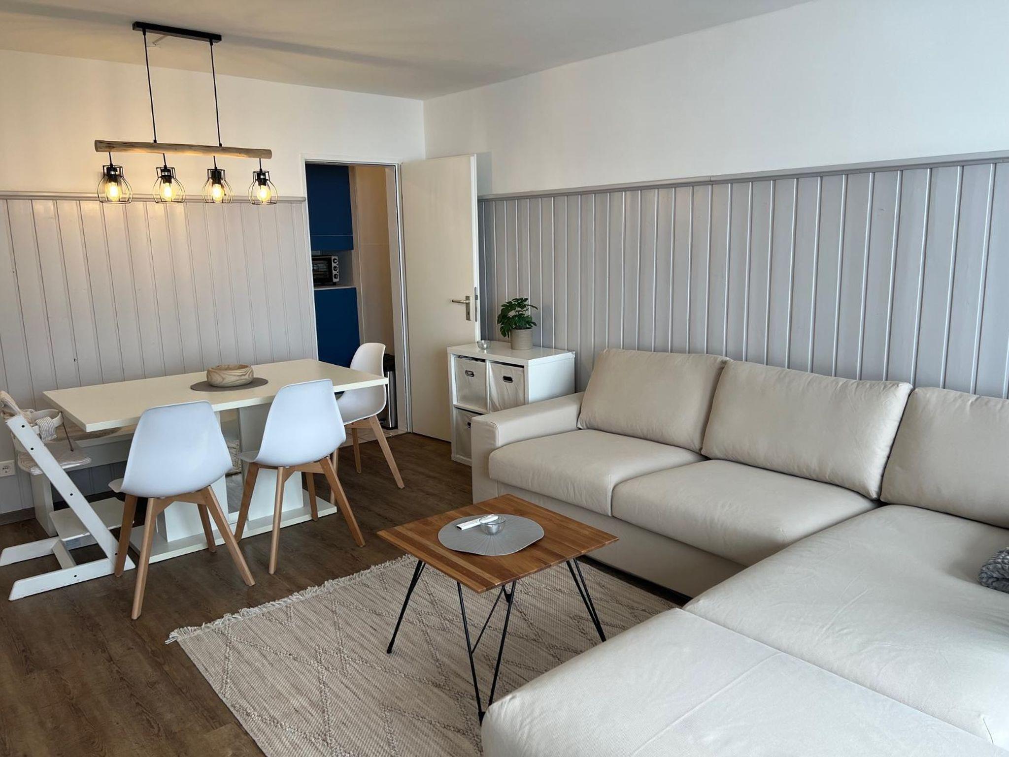 Wir haben eine frisch renovierte Wohnung H180 mit 53qm, Schlafzimmer mit Doppelbett und Stockbett, sowie im Wohnzimmer ein Ausklapp-Sofabett.