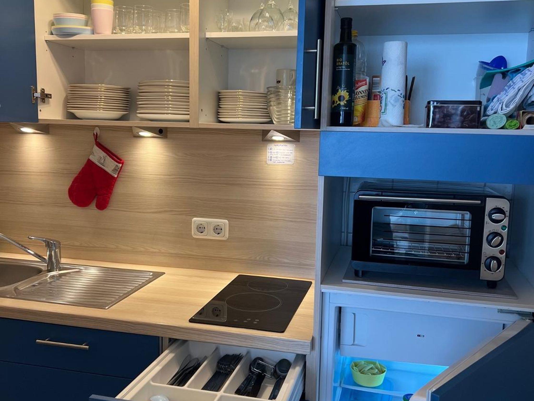 Außerdem bieten wir eine vollausgestattete Küche mit Kaffefiltermaschine, Heißwasserkocher, Toaster, Mikrowelle, kleinem Backofen, Spülmaschine und Herd. Optional haben sie aber auch die Möglichkeit im Restaurant Geyerei (direkt im Haus) zu frühstücken (Buffet) oder Essen zu gehen (Reservierung notwendig). Waschservice ist buchbar (6 €).