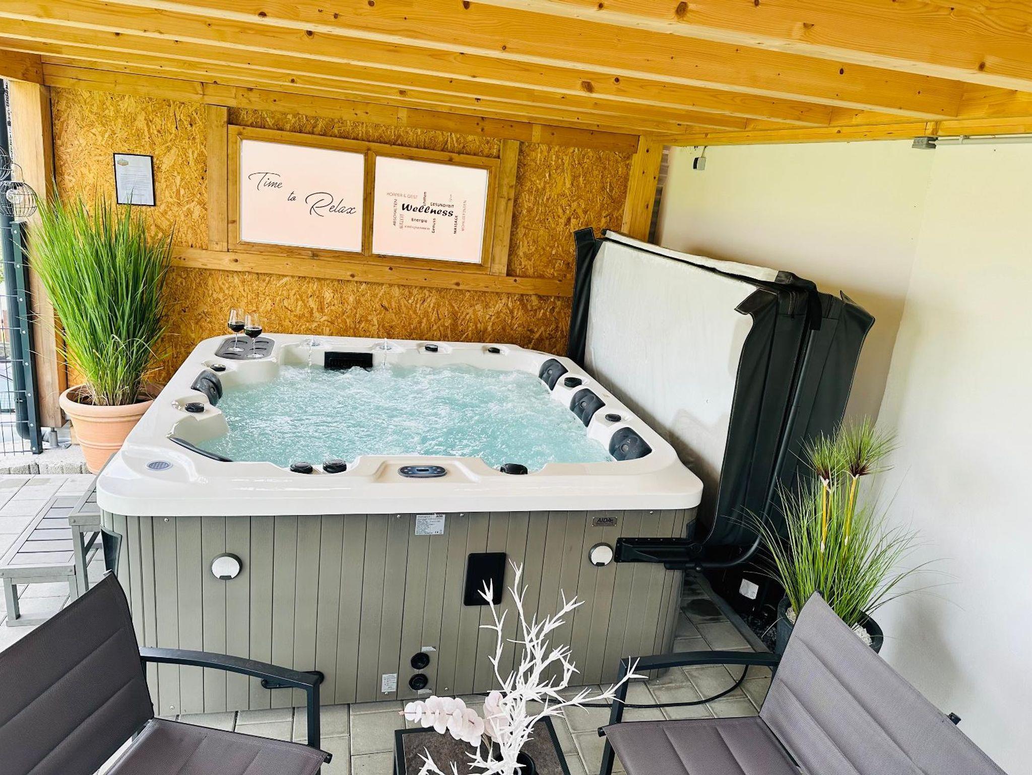 • überdachte Terrasse mit beheiztem Whirlpool für 5 Personen und Loungegarnitur