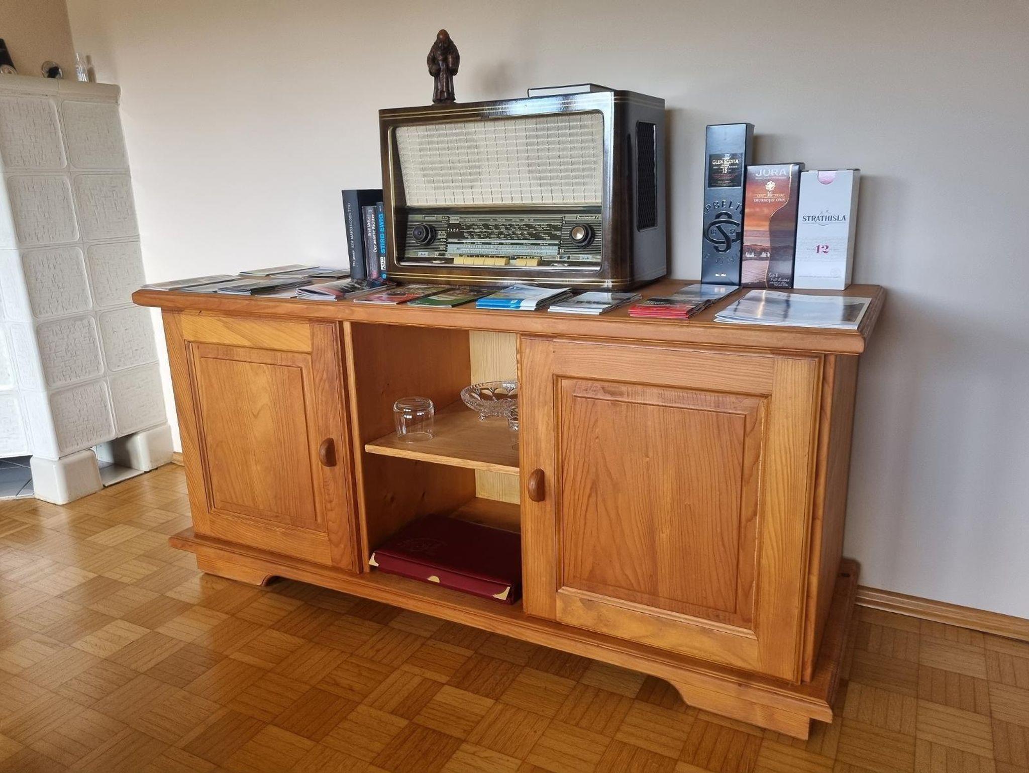 Das im Stil der 60er eingerichtete Wohnzimmer lädt zum Verweilen ein. Ausgestattet mit TV, Couch und Polsterstühlen. An sonnigen Tagen steht den Gästen die Terrasse mit Gartenmöbeln und Markise zur Verfügung, die vom Wohnzimmer aus zu erreichen ist.