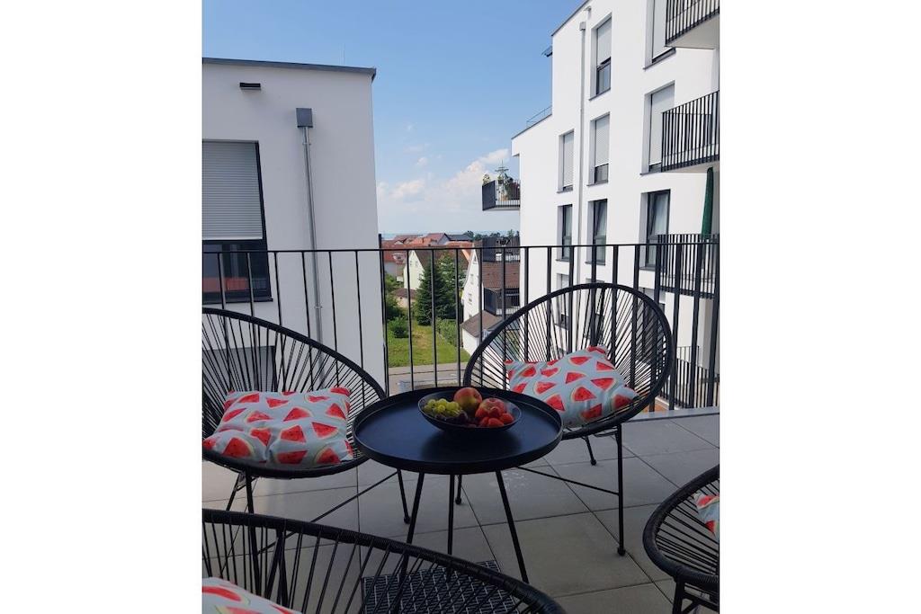 Die Ferienwohnung verfügt über eine gehobene Ausstattung, bietet zwei Schlafzimmer und eine separate Schlafcouch und somit Platz für bis zu 6 Erwachsene. Weitere Features: - 1 Schlafzimmer mit 200 er Boxspringbett mit Komfortmatratze - 1 Schlafzimmer mit 160 er Boxspringbett mit Komfortmatratze - komfortable Schlafcoach bietet zusätzlich für 2 Personen eine Schlafmöglichkeit. - Kinderreisebett auf Anfrage verfügbar, ebenso Kinderstuhl und Babybadewanne - sehr großes Badezimmer mit Badewanne und separater Duschkabine, Doppel-Waschtisch und Toilette - separates Gäste WC - großzügige Garderobe im Flurbereich - offenes Wohn- und Esszimmer mit umfangreichem Küchenequipment, und einem Esstisch für 6 Personen - Nespresso Kaffeemaschine - 3 moderne Smart- TVs mit High-Speed W-LAN - großzügiger Balkon mit Platz für bis zu 6 Personen - eigener Tiefgaragenstellplatz und Fahrradkeller direkt im Haus. - Waschmöglichkeiten auf Anfrage, Bügelbrett etc. sind vorhanden. Alle Räume (bis auf das Bad) sind mit Eichenholzparkett und einer Fußbodenheizung ausgestattet Bis zum See sind es nur 600 m, die Region lässt sich von hier aus perfekt erkunden.