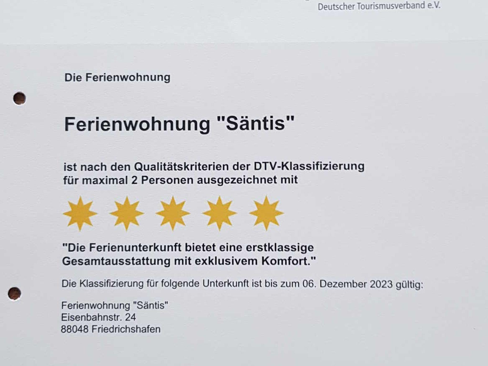 Die Ferienwohnung Säntis ist vom Deutschen Tourismus Verband mit 5 Sternen ausgezeichnet worden.