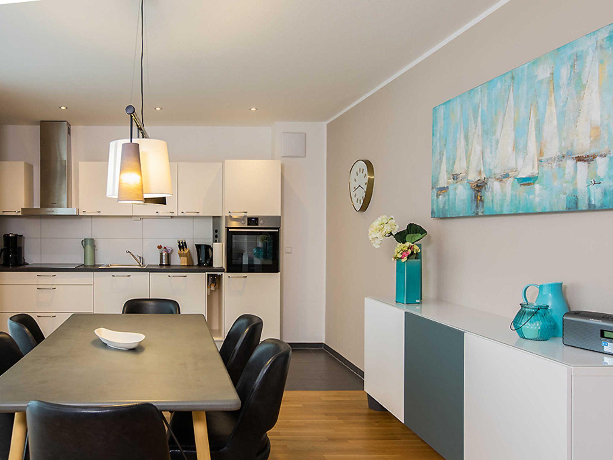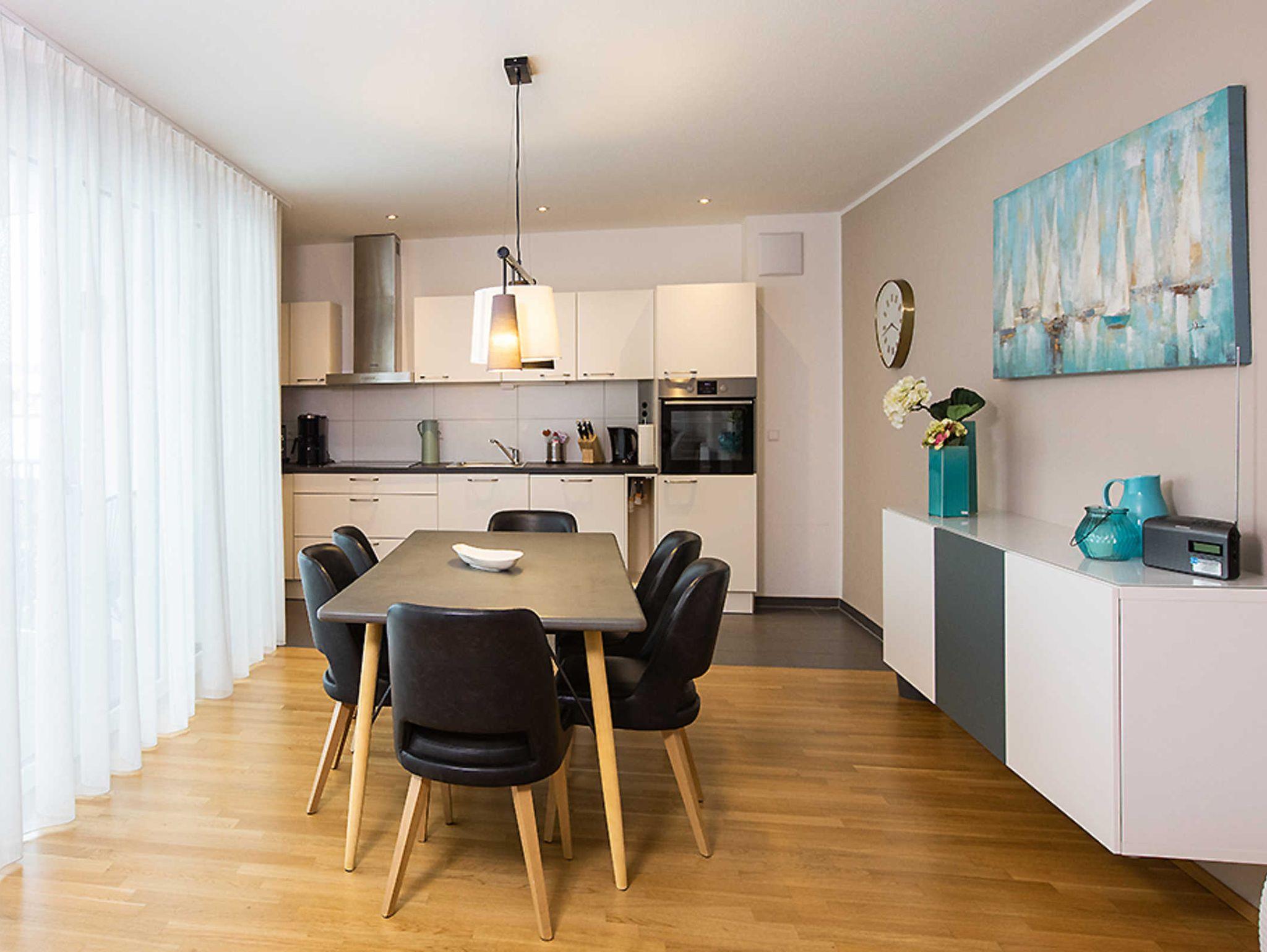 Die Wohnung verfügt über eine gehobene Austattung für bis zu 4 Personen: - 1 Doppelbett mit 180 x 200 er Boxspringbett mit Komfortmatratze - Schlafcoach für 2 weitere Personen im Wohnraum mit 160 x 200 Liegefläche, großes Badezimmer mit Dusche und Toilette - separater Raum für Kleidung - offenes Wohn- und Esszimmer mit umfangreichem Küchenequipment, und einem Esstisch für bis zu 6 Personen - Nespresso Kaffeemaschine - 2 moderne Smart- TV's, High-Speed W-LAN - großzügiger Balkon mit Platz für bis zu 4 Personen - Waschmöglichkeiten auf Anfrage, Bügelbrett etc. sind vorhanden. Alle Räume (bis auf das Bad) sind mit Eichenholzparkett und einer Fußbodenheizung ausgestattet.