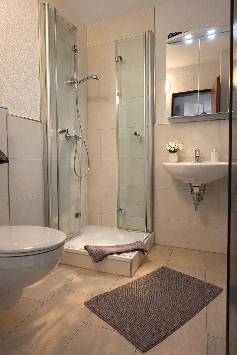 Das moderne Badezimmer verfügt über eine Dusche, WC, Waschbecken, Spiegel mit Beleuchtung, Handtücher und Föhn. Alles ist gepflegt, hell und funktional gestaltet.