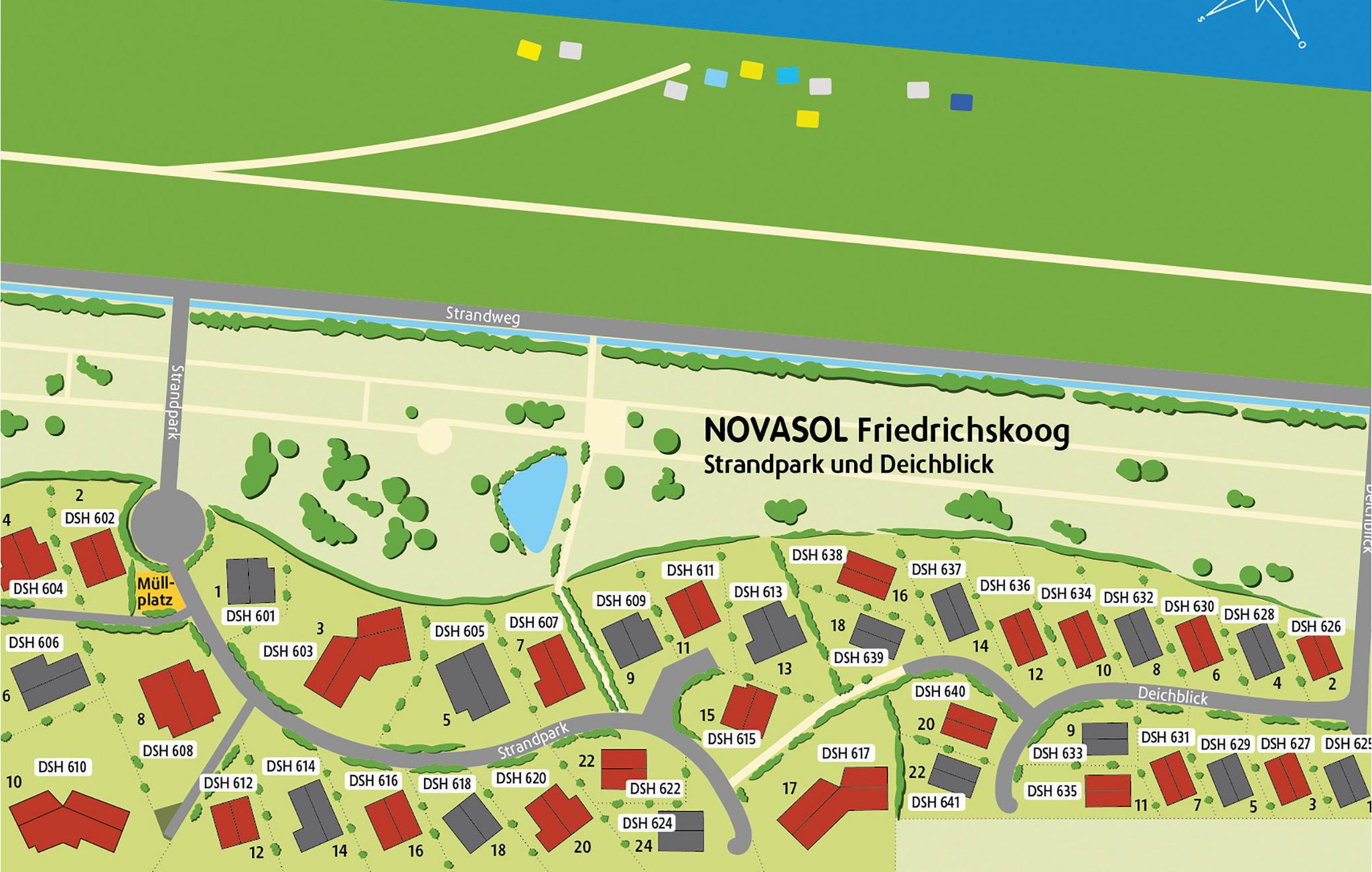 Feriehusene ligger ved siden av det lille sentrum av Friedrichskoog-Spitze rett bak diget, bare noen få meter fra nasjonalparken Vadehavet. Fra feriehuslandsbyen kommer du også raskt til Friedrichskoog med den berømte selstasjonen, den store sjørøverlekeplassen og den innendørs lekeparken i hvalbygningen.