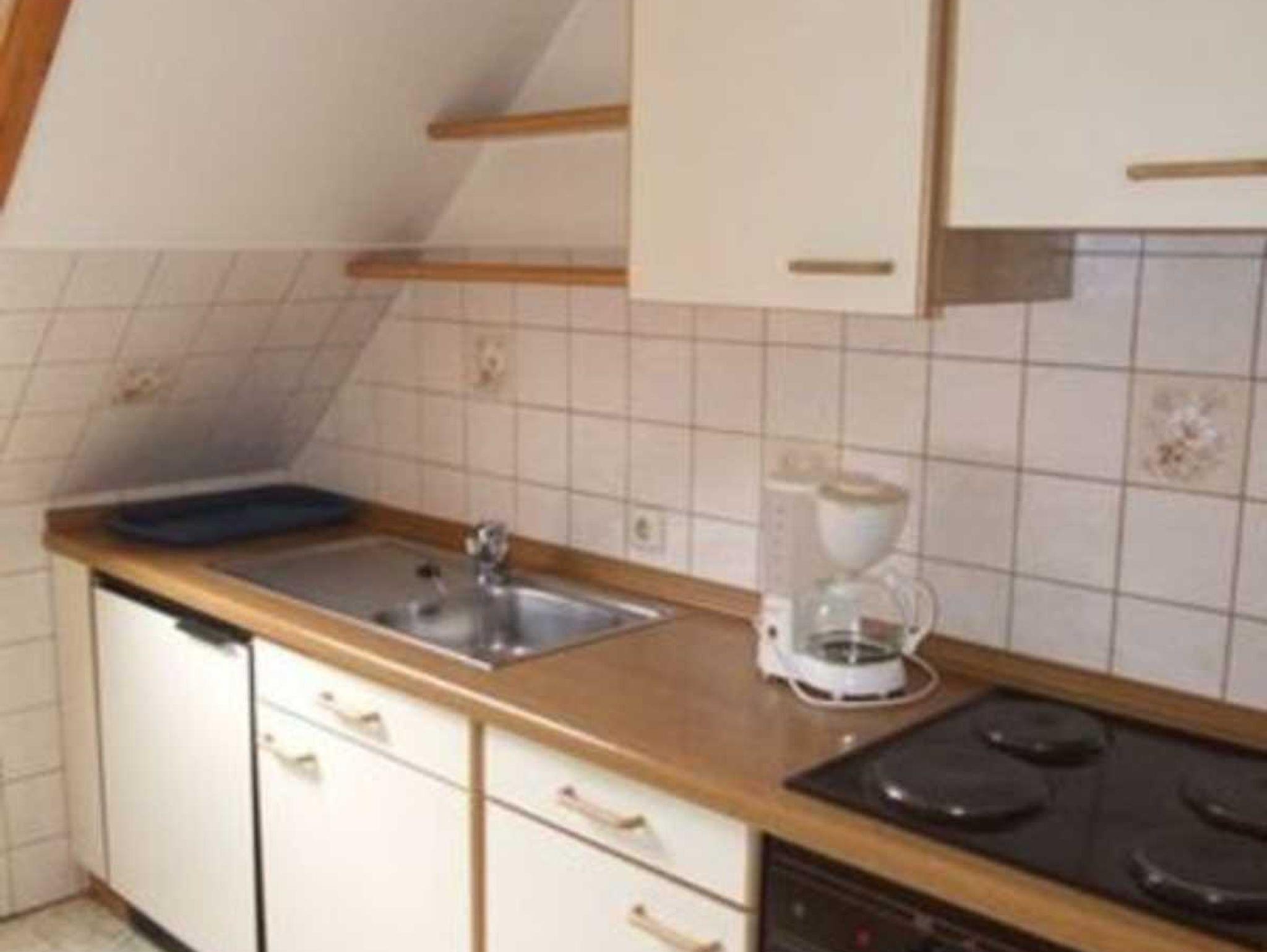 Küche komplett ausgestattet mit Herd, Backofen, Wasserkocher und Geschirr für 6 Personen
