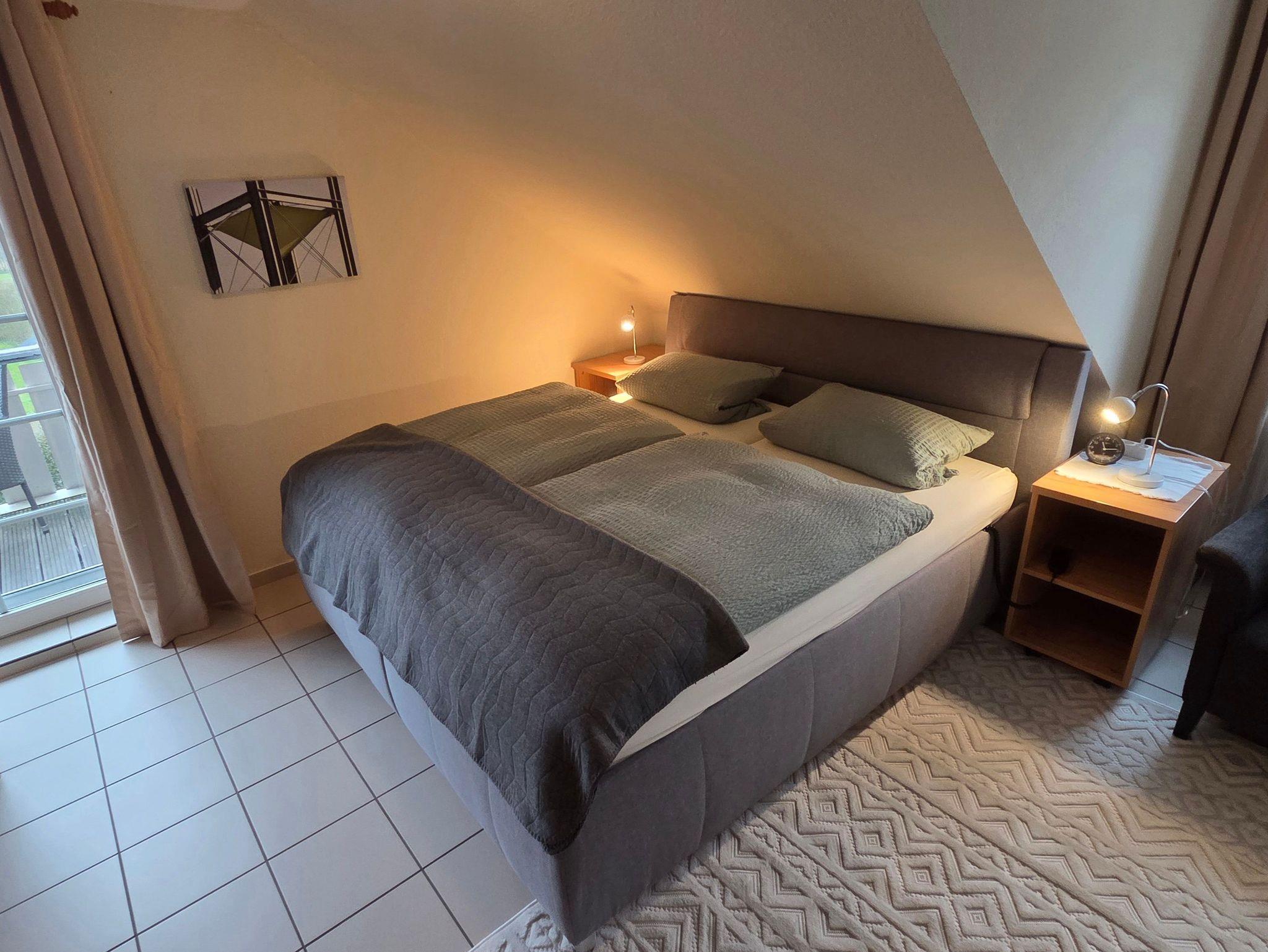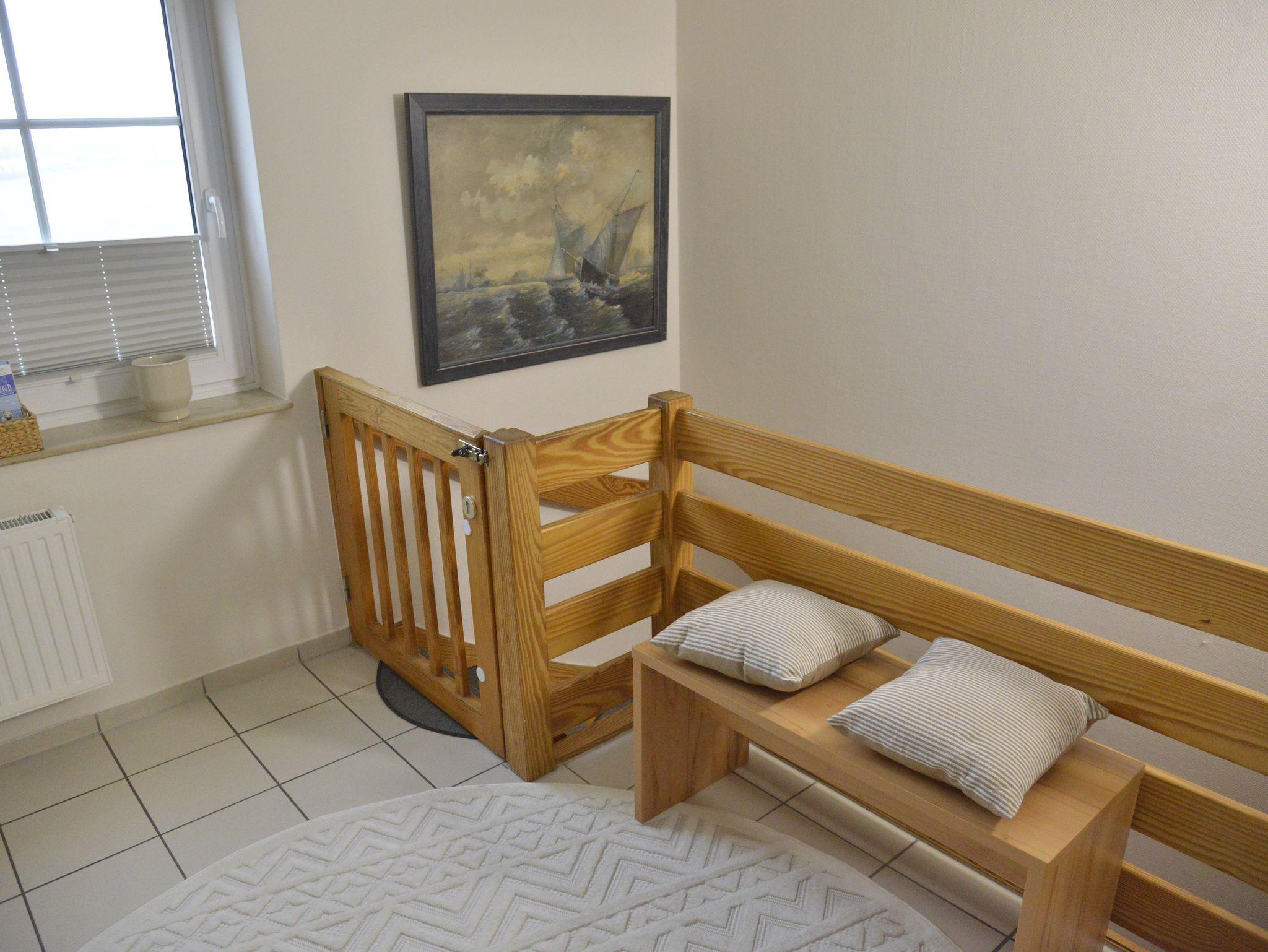 Obergeschoss mit Balkon für 2-5 Personen inkl. Gartenmöbel, Liegewiese, Strandkorb und Sandkiste. Wohn-/Schlafraum, Schlafraum, Küchenzeile, Dusche/WC. Sat-TV, Telefon, Kinderbett und Kinderhochstuhl.