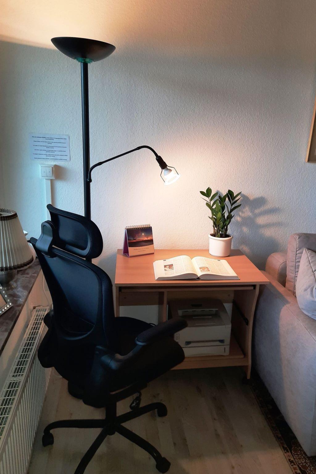 Inside, the flat impresses with meticulous furnishings that leave nothing to be desired. It offers two bedrooms - one with two box-spring beds and a sofa bed, the second with two further box-spring beds, so that up to six people can be accommodated comfortably. For your comfort, we offer plenty of wardrobes and storage space. In the living room, a cosy upholstered suite invites you to relax, which also serves as a sleeping area for two people. If required, you can use the existing desk with office chair and b/w laser printer for home office days. A fully equipped fitted kitchen with dishwasher and a small counter including three bar stools is also available, as is free WiFi.