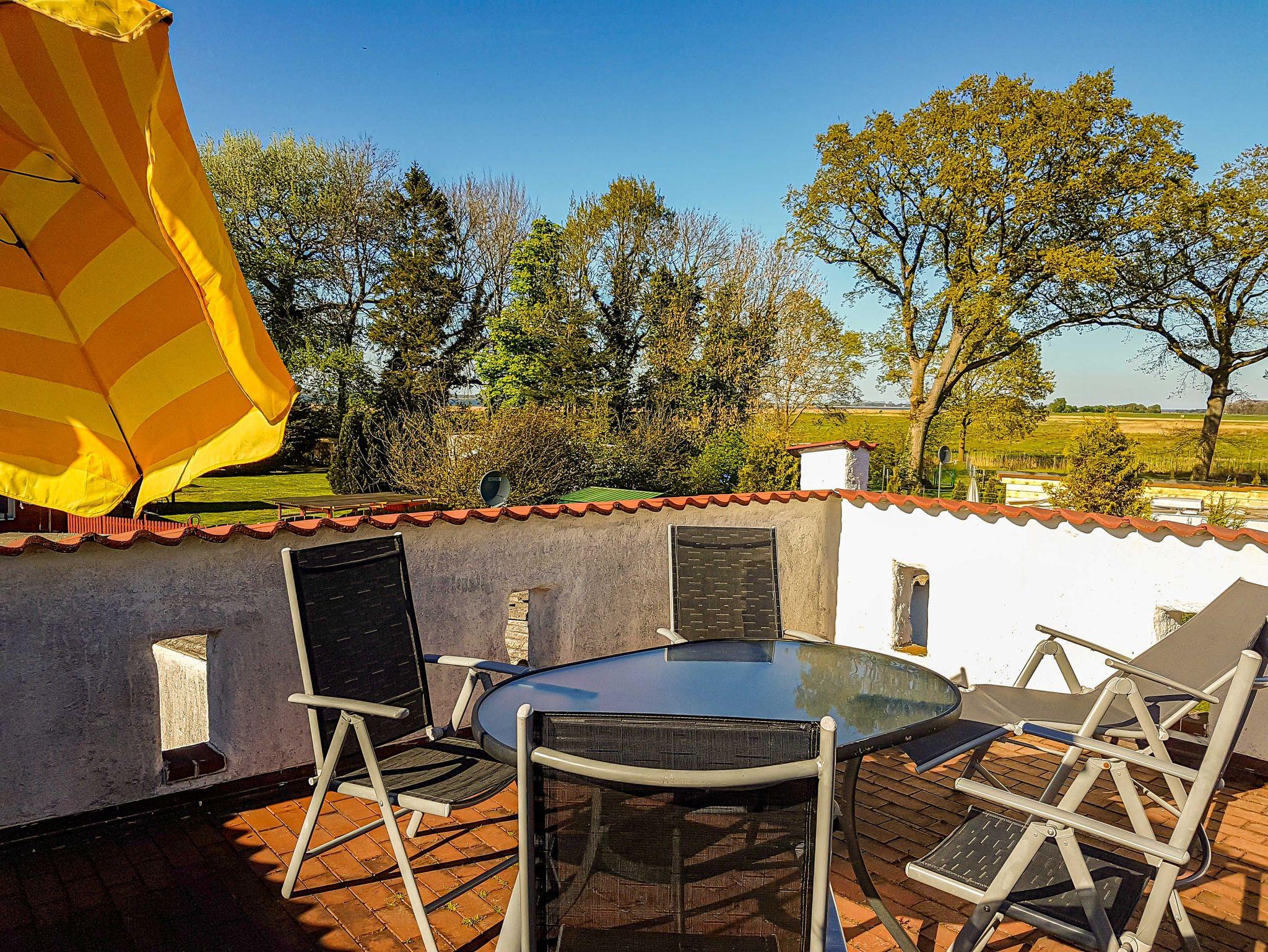 Die 35 m² große Dachterrasse ist mit Ziegelsteinen gelegt, die nicht nur ein mediterranes Ambiente vermitteln, sondern auch in den Abendstunden als Wärmespeicher dienen. Sie wird von früh Morgens bis spät Abends von der Sonne verwöhnt. Hier kann man entspannen und die Ruhe sowie die Aussicht auf den Bodden genießen.