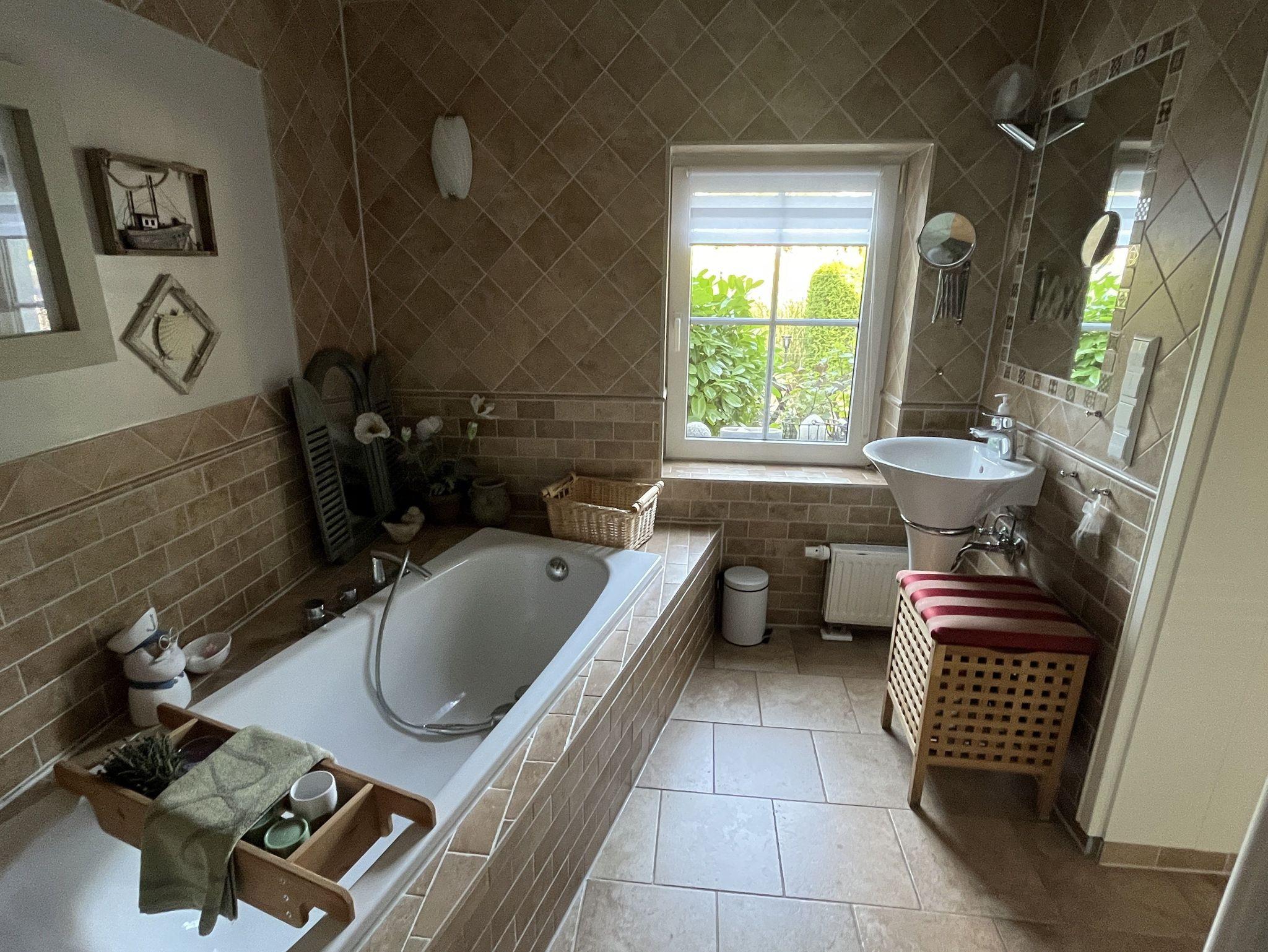 In der oberen Etage befinden sich neben der Sauna 10,00€ (inkl. separate Duschmöglichkeit) auch die 2 Schlafräume (jeweils mit Doppelbett). Und wenn das einmal nicht ausreicht, kann in einem Raum eine Aufbettung erfolgen. Von hier gelangen Sie in den Bereich des Bades und auf die Terrasse sowie in den Aufgang ins Obergeschoss des Ferienhauses. Das großzügige Bad, mit Wanne und Duschbereich, lädt auch gern zum „Wohlfühlen“ ein.