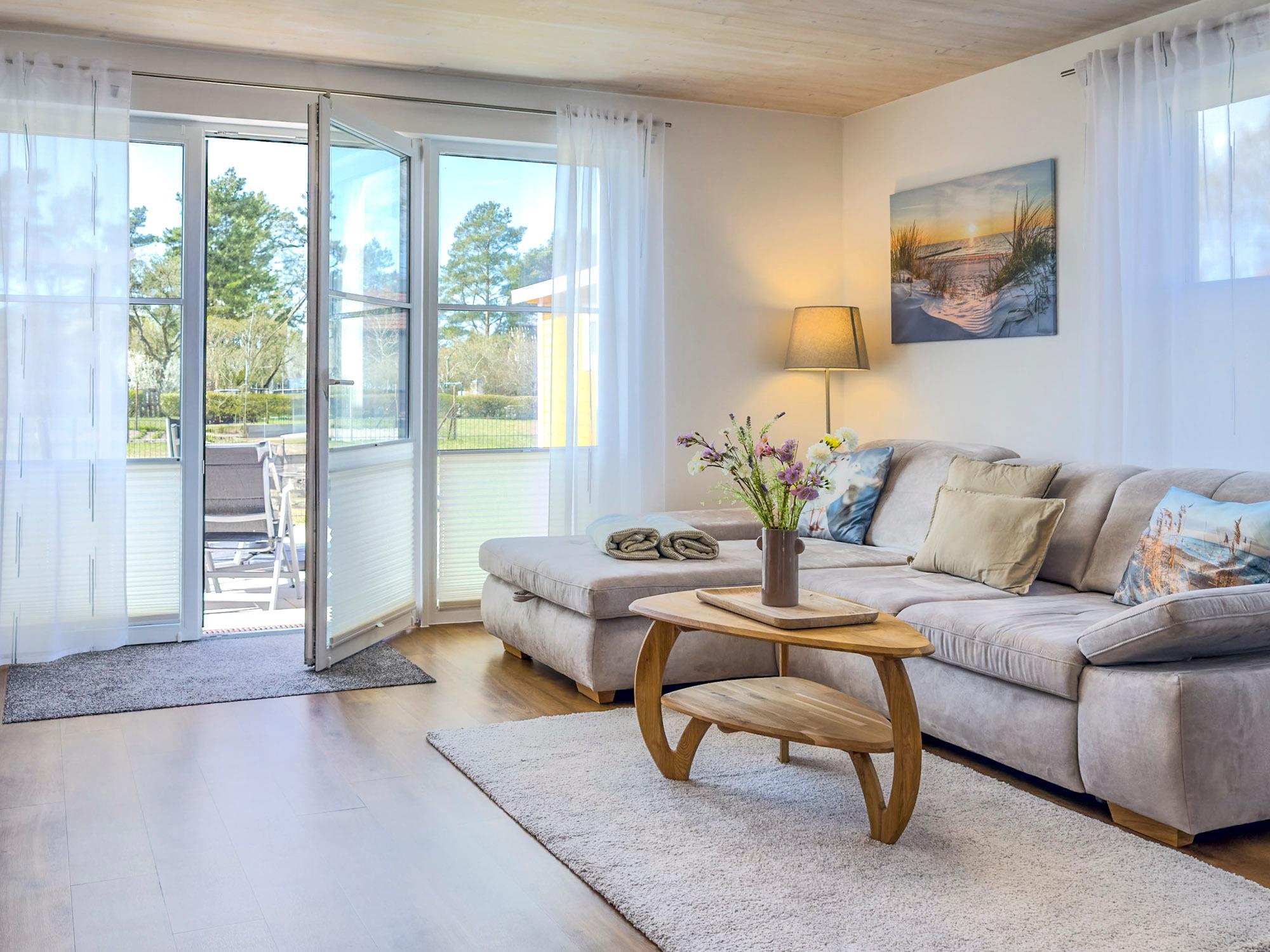 Das Ferienhaus Sonnenzauber empfängt Sie mit einem hellen, freundlichen Ambiente und viel Raum für Erholung. Der offene Wohnbereich mit gemütlicher Sitzgruppe lädt zu entspannten Abenden ein – ob beim Spielen mit der Familie, bei einem Film oder einfach beim Blick in den Garten.