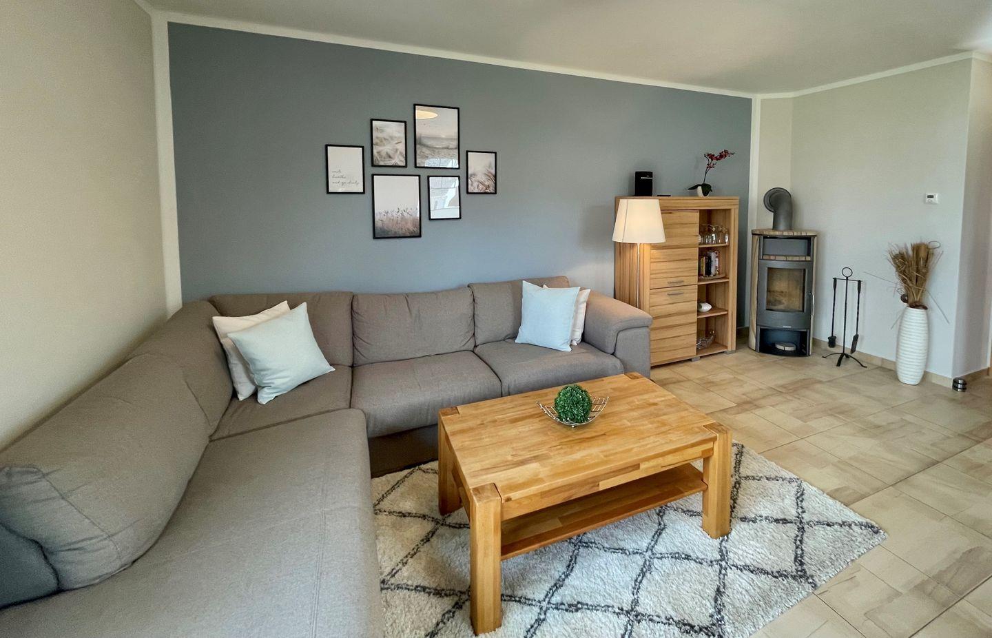 Im offenen Wohnbereich mit Blick auf den Garten erwartet Sie ein gemütliches Wohnzimmer mit Sofaecke, Kaminofen und Fliesenboden mit angenehmer Fußbodenheizung. Diese sorgt für behagliche Temperaturen auch in der kühleren Jahreszeit. Für Unterhaltung sorgen zwei Fernseher, ein DVD-Spieler, ein Radio sowie Bücher und Spiele. WLAN ist selbstverständlich vorhanden und ermöglicht das Arbeiten wie auch entspannte Streaming-Abende.