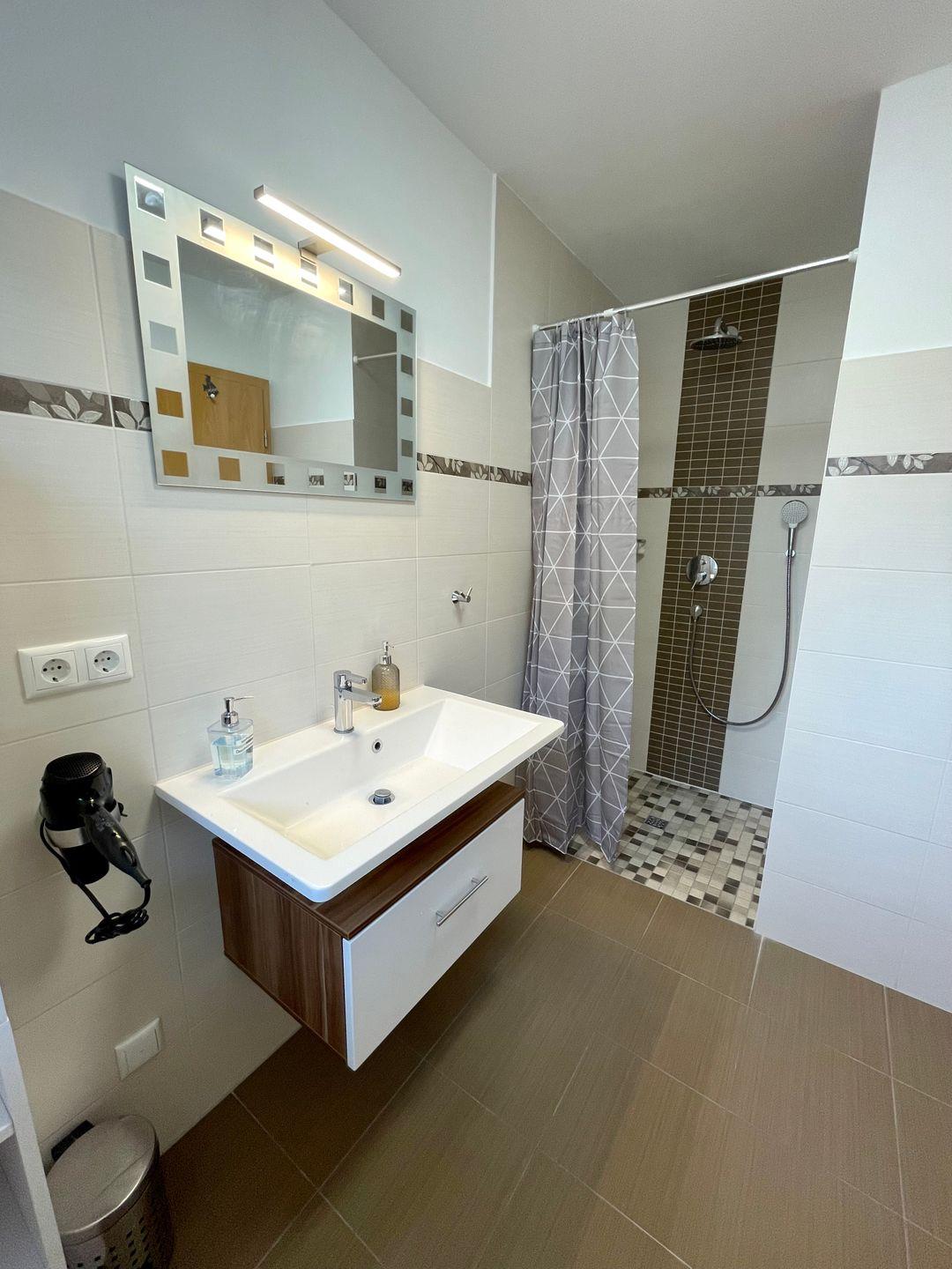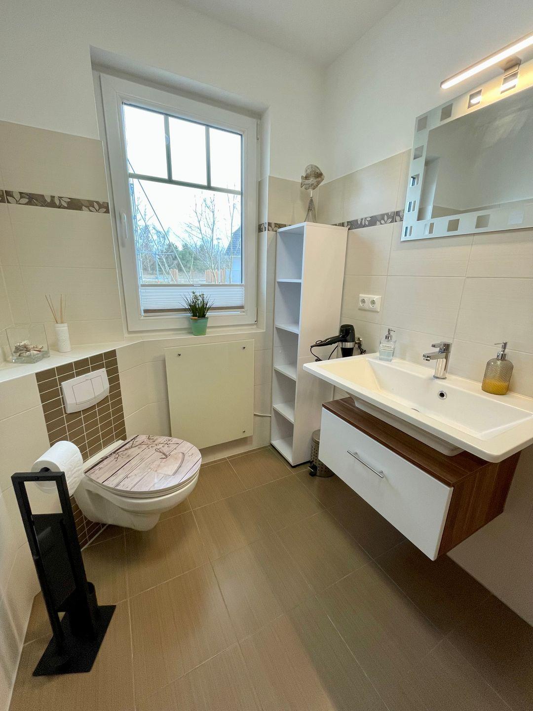 Das Haus verfügt über ein modernes Badezimmer mit bodengleicher Dusche sowie ein weiteres Bad mit Badewanne und Tageslicht. Haartrockner, Spiegel und Fenster gehören selbstverständlich zur Ausstattung. Sichtschutz an allen Fenstern sowie Fliegengitter sorgen für zusätzlichen Komfort und Privatsphäre.