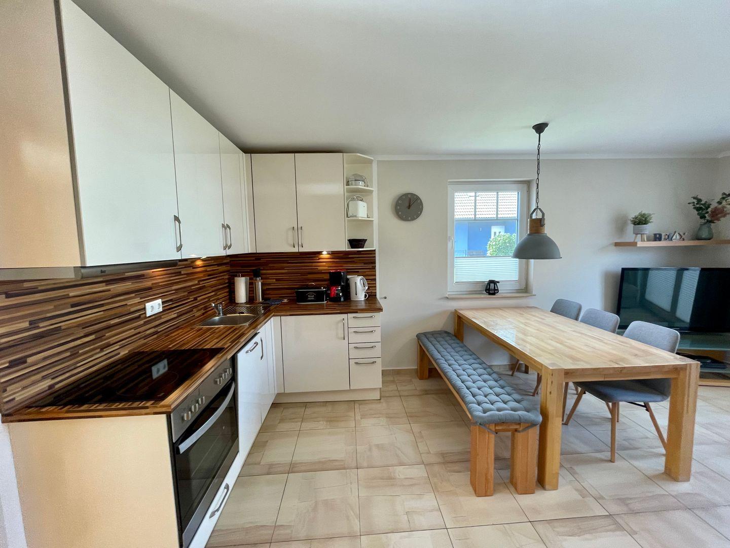 Die moderne, offene Küche ist hochwertig ausgestattet: Ein 4-Platten-Herd, Elektro-Backofen, Kühlschrank mit Gefrierfach, Spülmaschine und zahlreiche Küchenutensilien einschließlich Kaffeemaschine, Wasserkocher, Mixer, Toaster und Eierkocher stehen bereit. Der angrenzende Esstisch bietet ausreichend Platz für gemeinsame Mahlzeiten. Praktische Details wie Bügelbrett, Bügeleisen, Wäscheständer, Waschmaschine zur Eigennutzung und Staubsauger fördern eine komfortable Selbstversorgung.