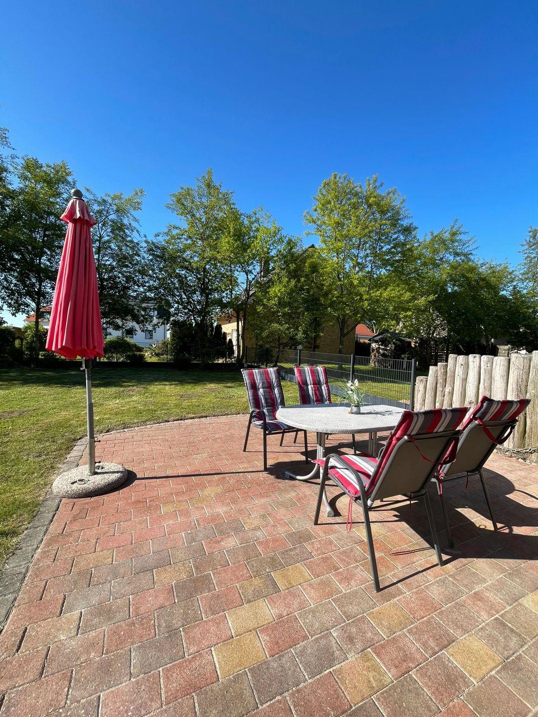 Der Außenbereich lädt zum Verweilen ein: Auf der möblierten und sonnengeschützten Terrasse mit Sonnenschirm genießen Sie entspannte Stunden. Ein klassischer Kohlegrill steht für gesellige Barbecue-Abende bereit. Gartenmöbel sind ebenso vorhanden, sodass auch der Garten mit Kindern oder Hunden genutzt werden kann.