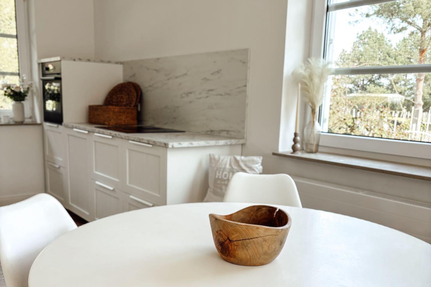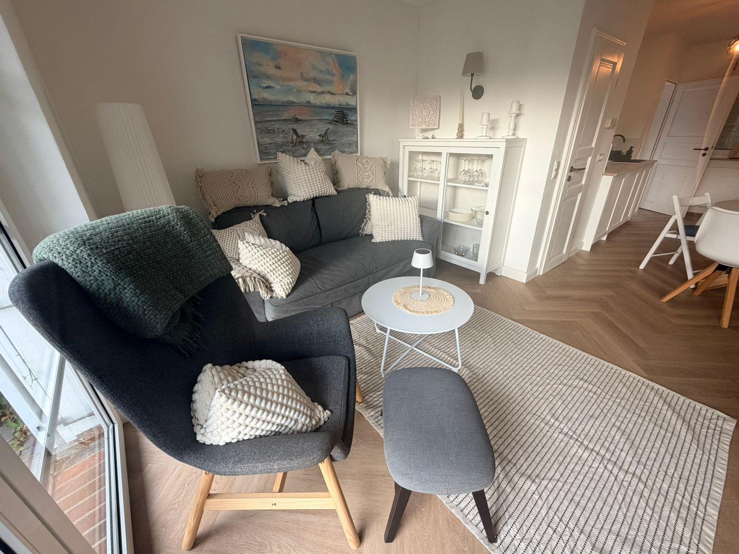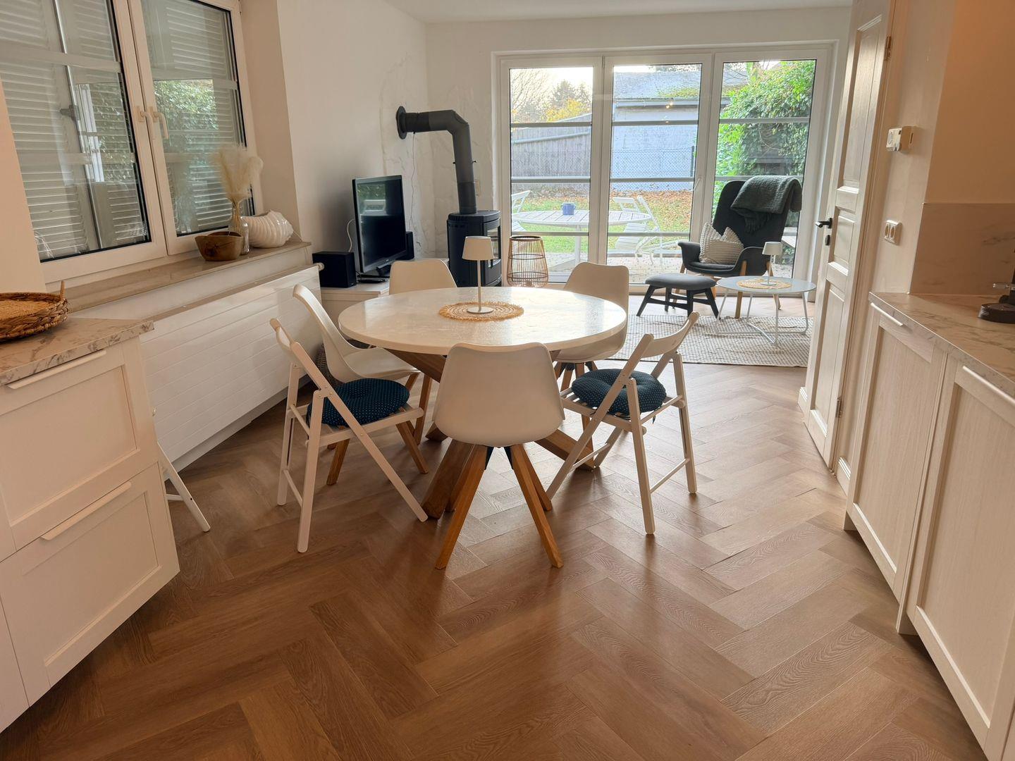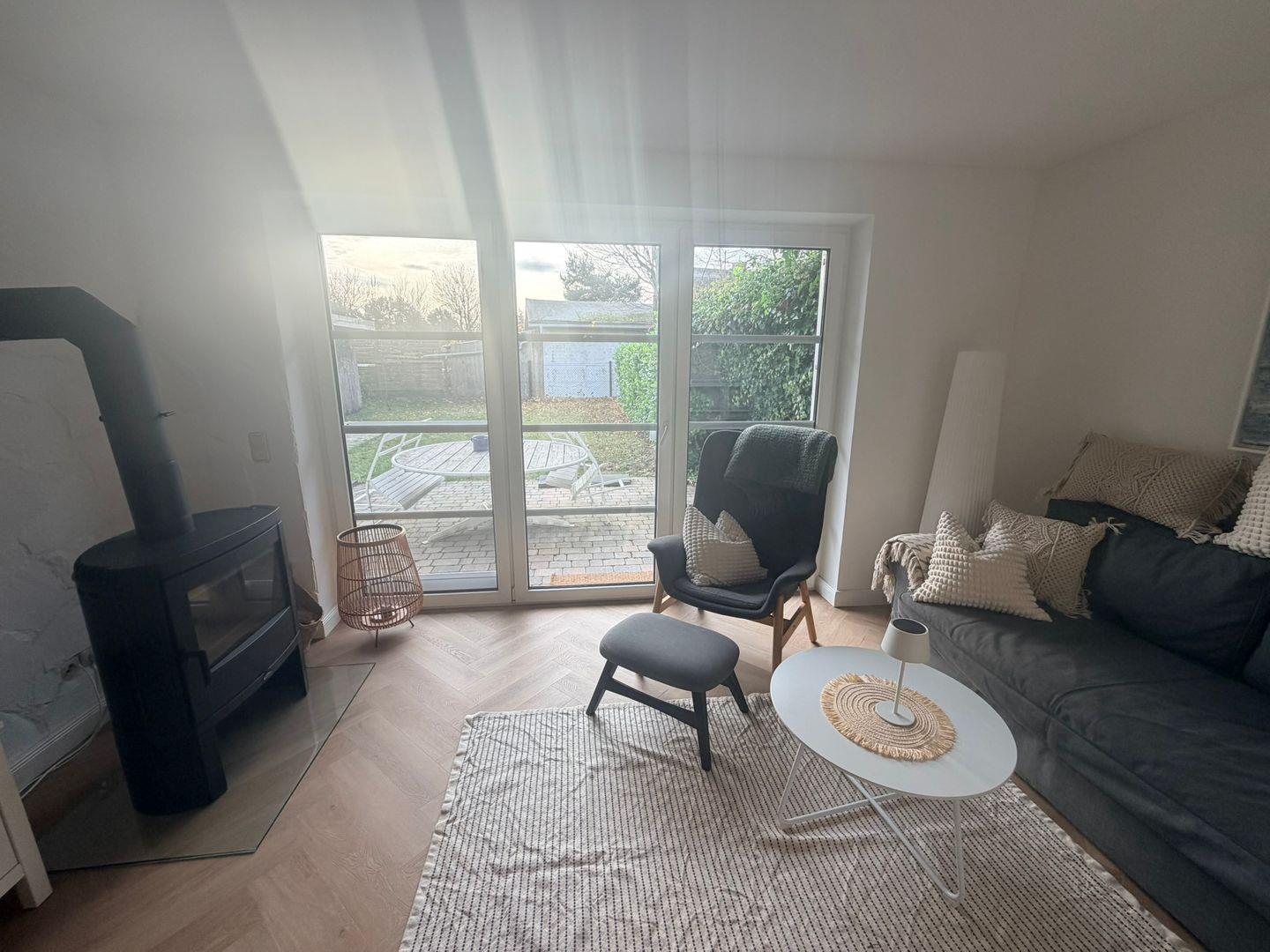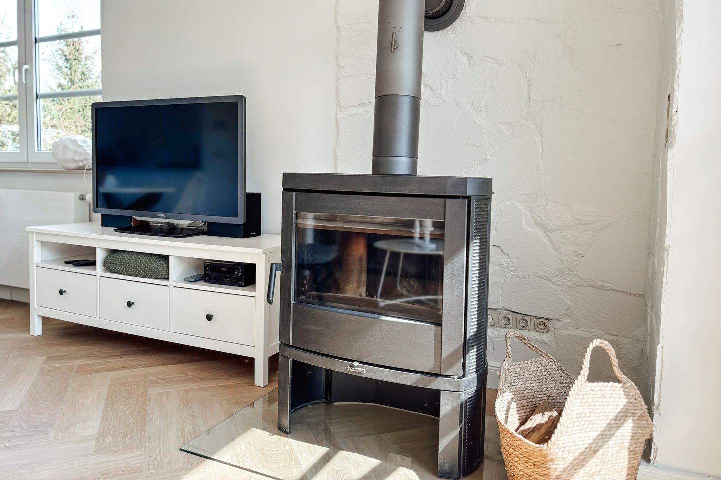 Das großzügige Wohnzimmer ist mit Parkettboden, einer Sofaecke (Schlafsofa), Sessel sowie einem modernen Ofen ausgestattet und bietet zu jeder Jahreszeit eine behagliche Atmosphäre. Ein 44–55 Zoll Satelliten-TV, HiFi-Anlage, Bücher sowie verschiedene Spiele sorgen für abwechslungsreiche Unterhaltung. Die offene Küche ist auf dem neuesten Stand und verfügt über einen 4-Platten-Herd, Elektro-Backofen, Kühlschrank mit Gefrierfach, Spülmaschine, Kaffeemaschine, Toaster, Wasserkocher, Kaffee- und Teemaschine sowie umfangreiche Küchenutensilien und Geschirr. So sind Sie für Selbstverpflegung bestens gerüstet. Ein Esstisch im Essbereich lädt zum gemeinsamen Speisen ein.