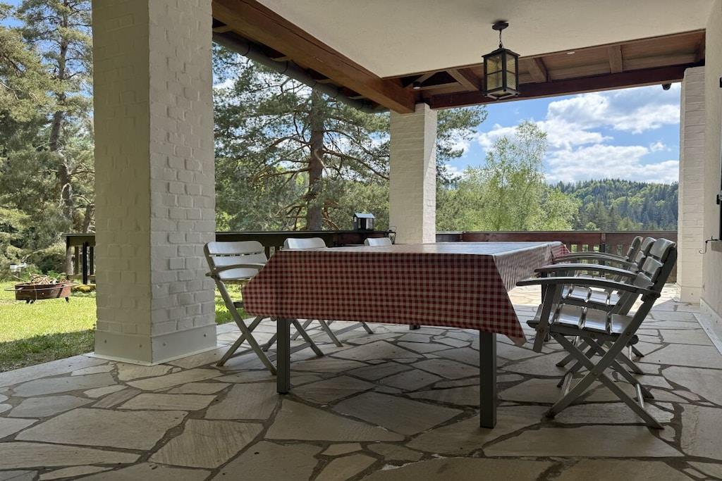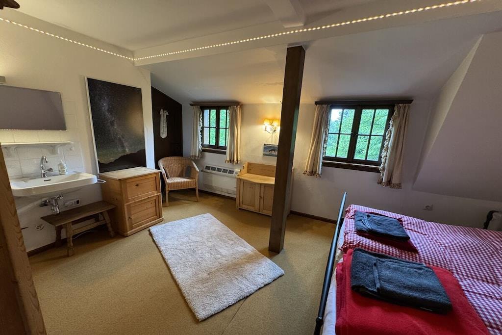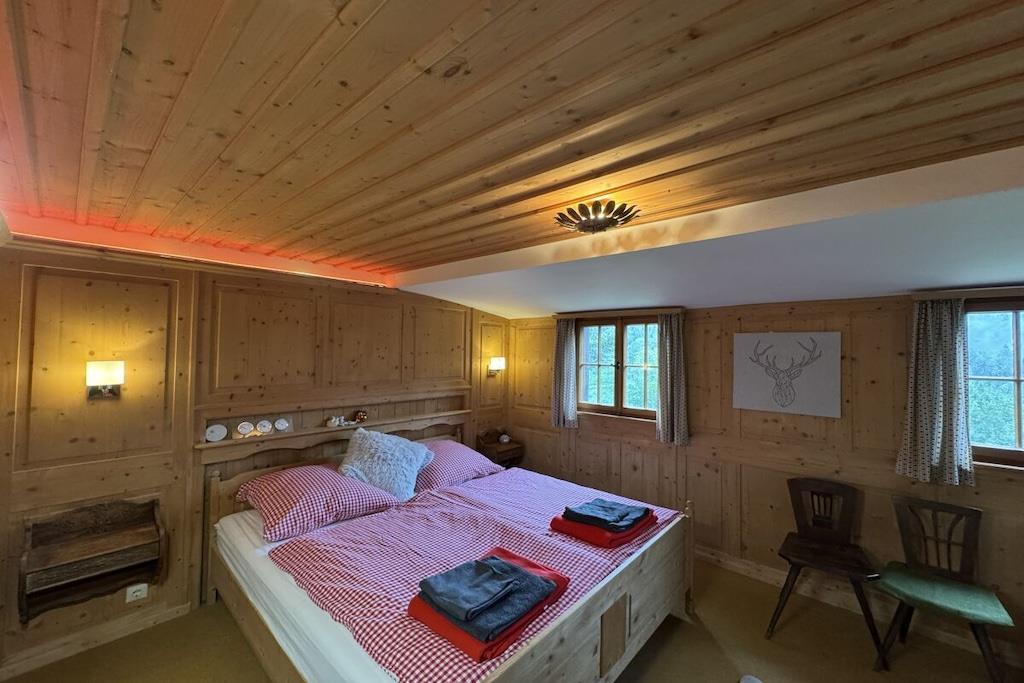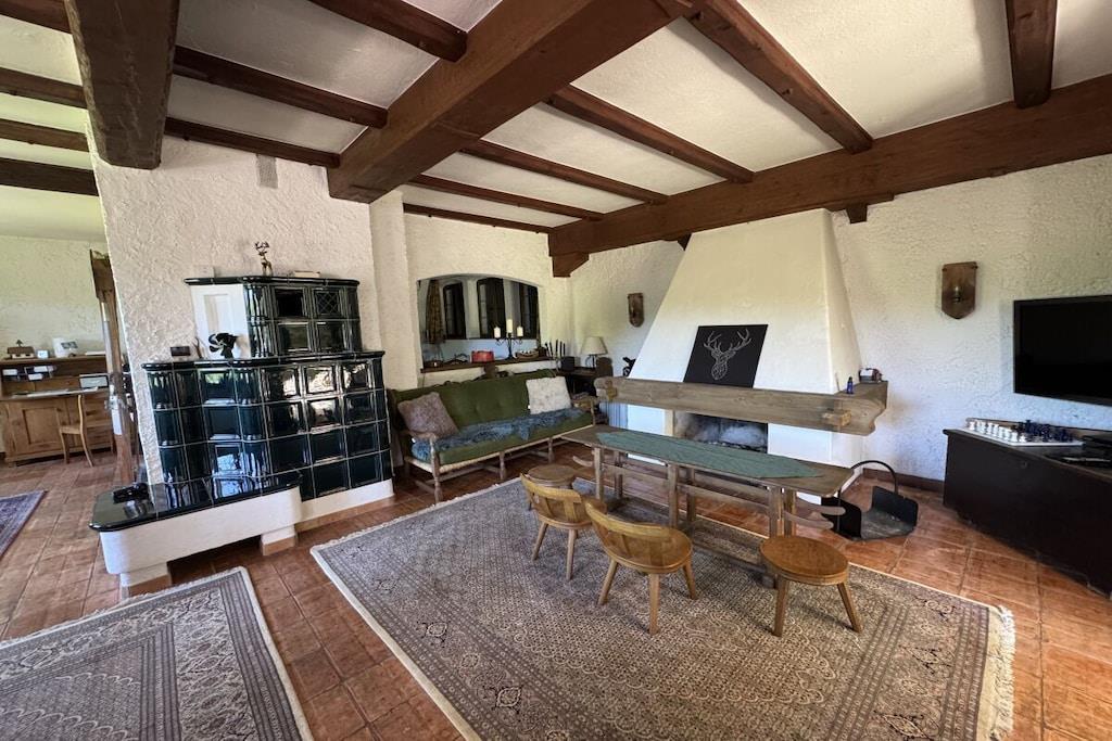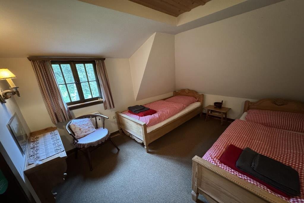 Helt avsidesliggende beliggenhet i hjertet av skogen med plass til opptil 10 personer, inngjerdet hage med friskt kildevann, åpen peis og kakkelovn, Wi-Fi og ladestasjon for elbil. Stor, delvis overbygd sørvendt terrasse med utsikt over den legendariske Wagnerstal-dalen og Kajetan-kapellet. Fullt utstyrt kjøkken med komfyr, stekeovn, oppvaskmaskin, Thermomix, airfryer og brødrister. Fem soverom med komfortable senger, hver med servant. Sengetøy, badehåndklær og håndklær er inkludert. Badfasiliteter: Ett bad med dusj Ett bad med dusj og separat toalett ved siden av «Patrone»-rommet - NYTT 2026 Ett gjestetoalett oppe Ett gjestetoalett nede