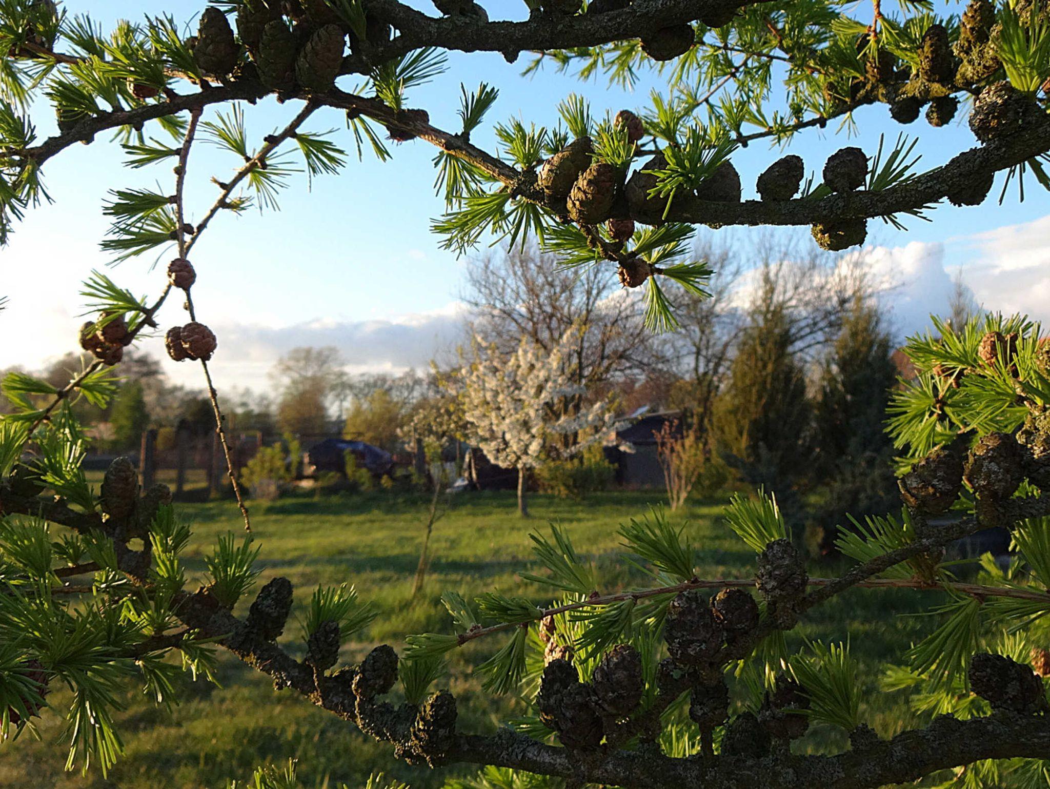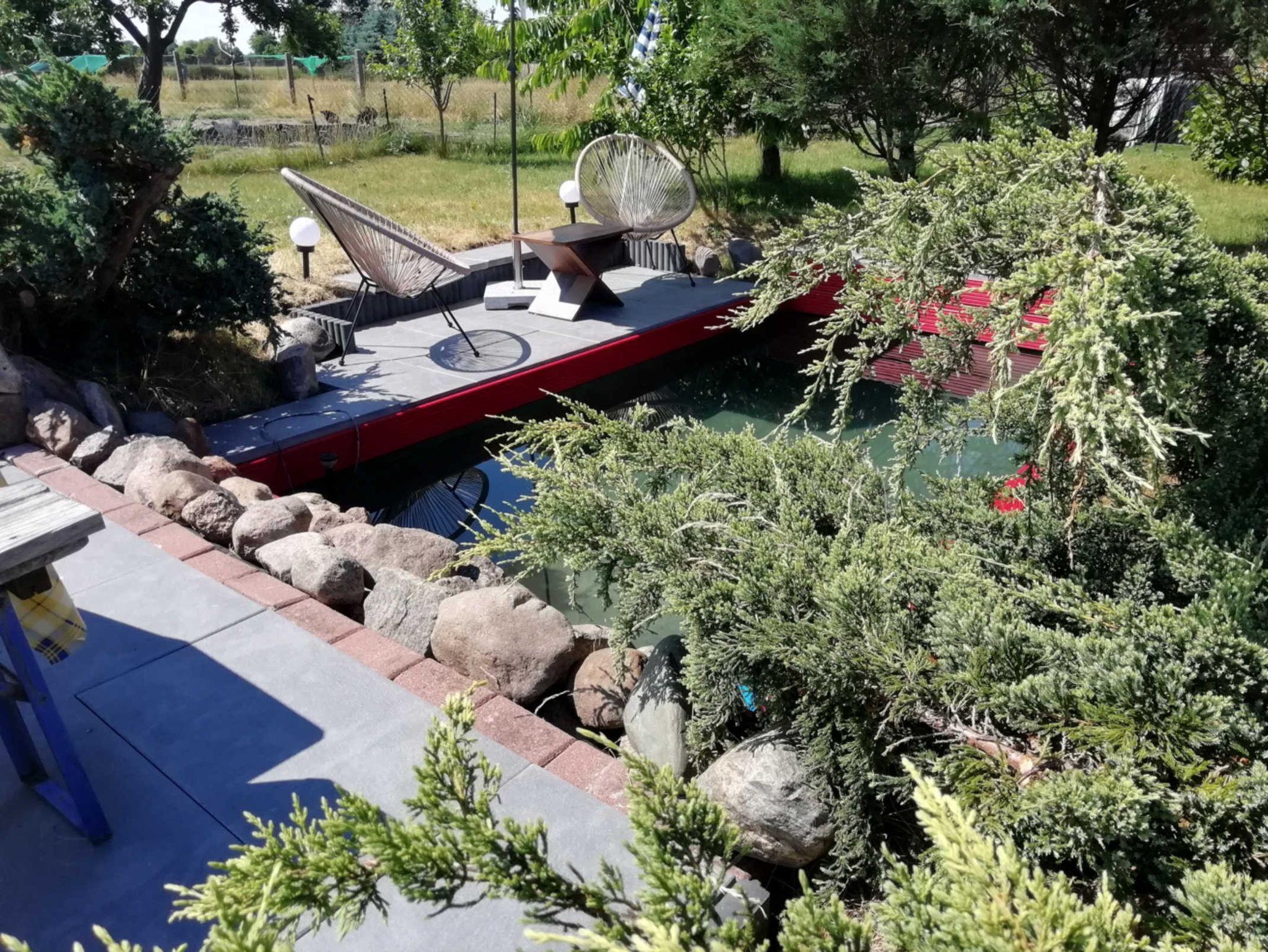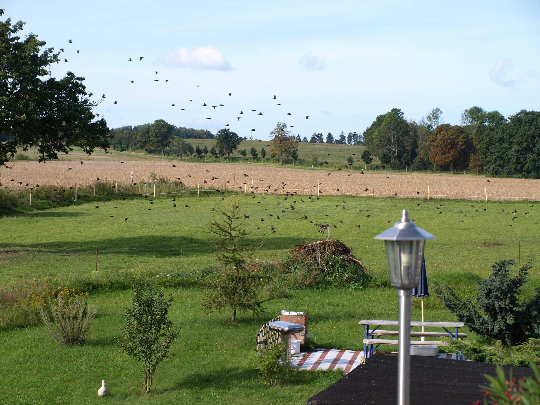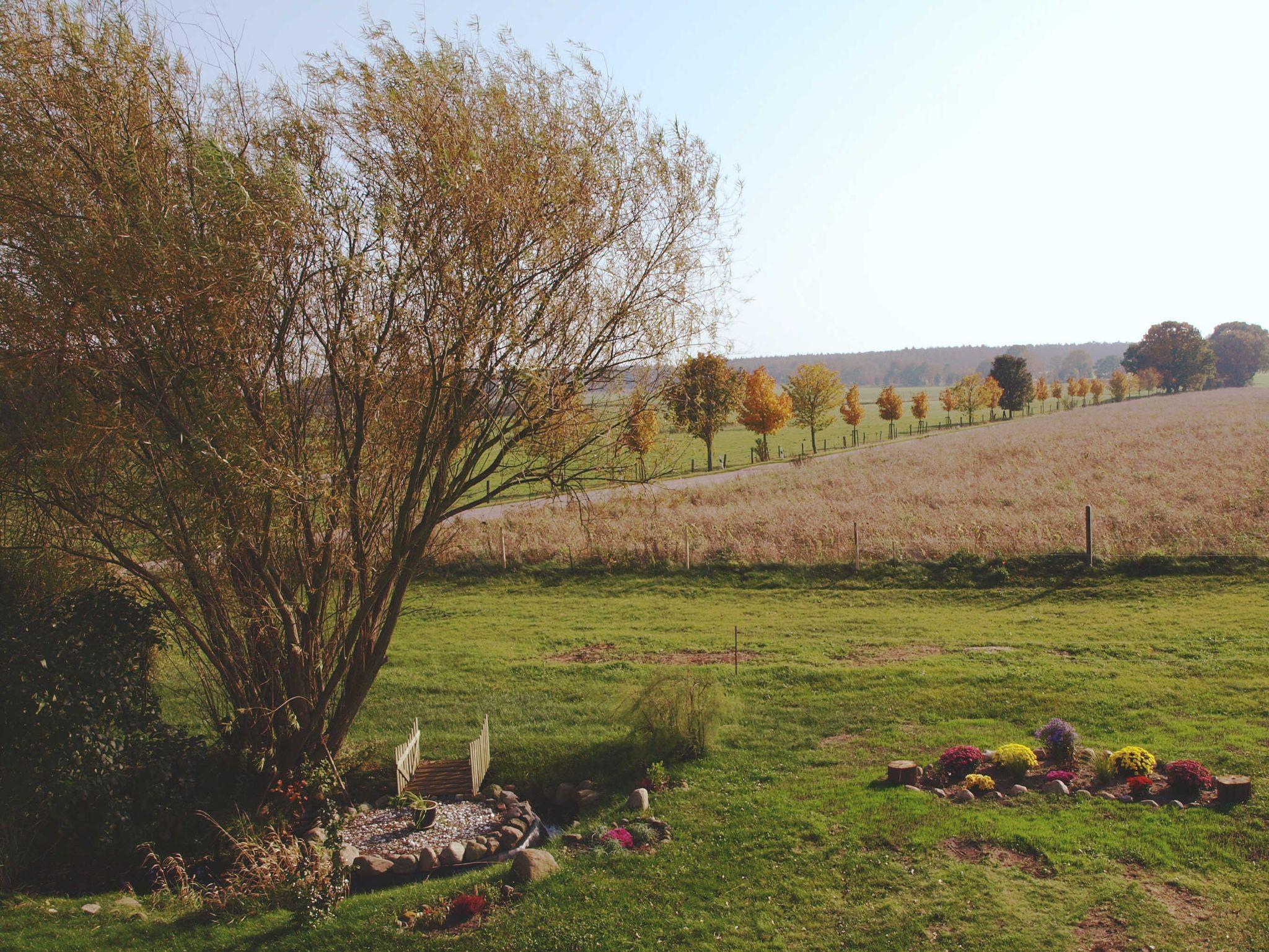 Zur kaum befahrenen Straße hin ist das Haus geschützt durch einen parkähnlichen Vorgarten mit Weiden und Nadelgehölzen und zwei Goldfischteichen. Hinter dem Haus öffnet sich von der Grillterrasse auf der 1000 qm großen Gartenwiese ein unverbauter Panoramablick auf die Naturlandschaft der Mecklenburgischen Seenplatte und märchenhafte Sonnenuntergänge.