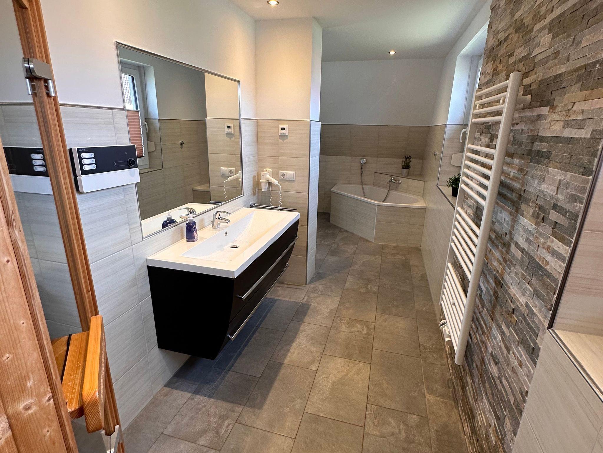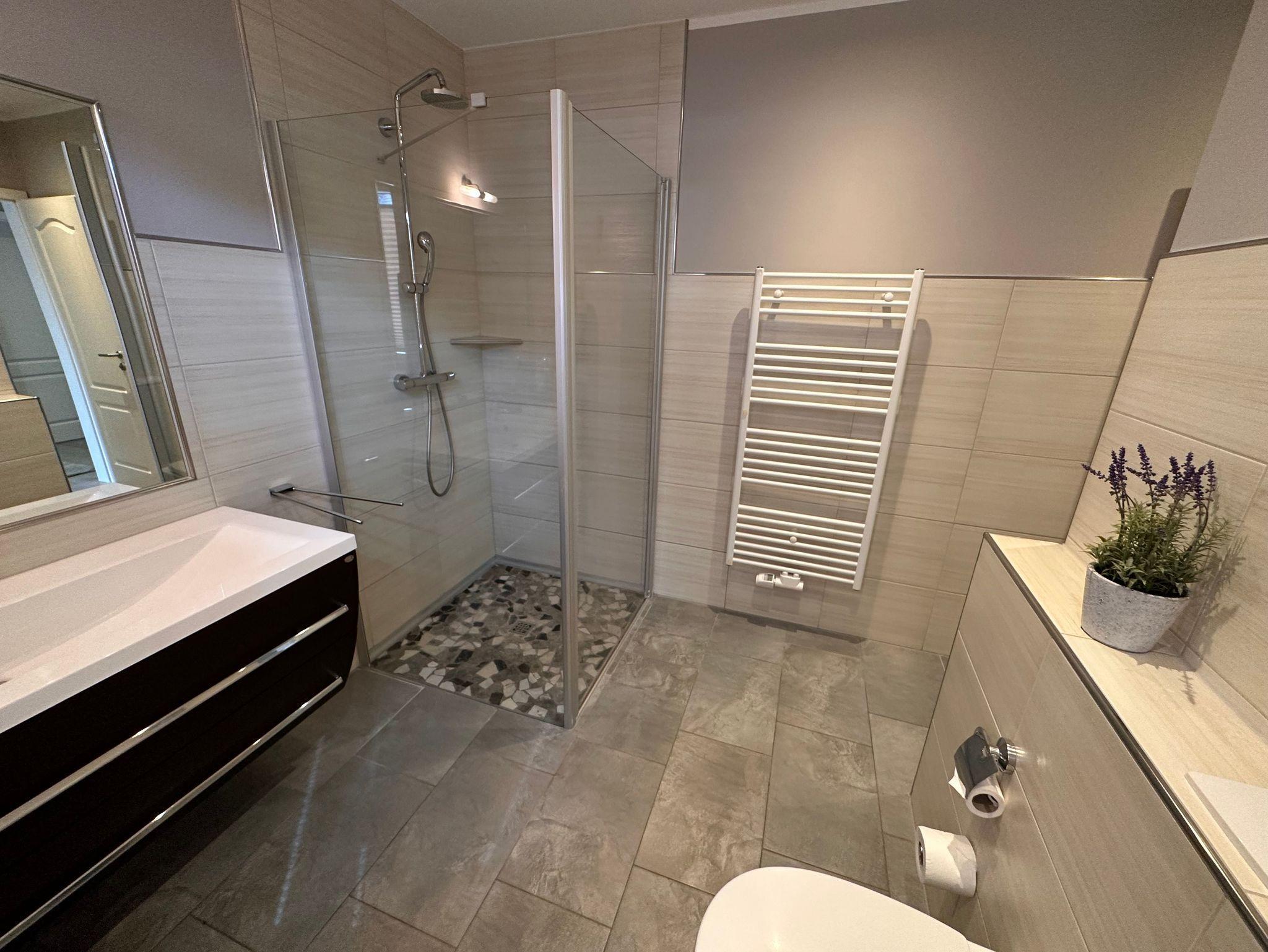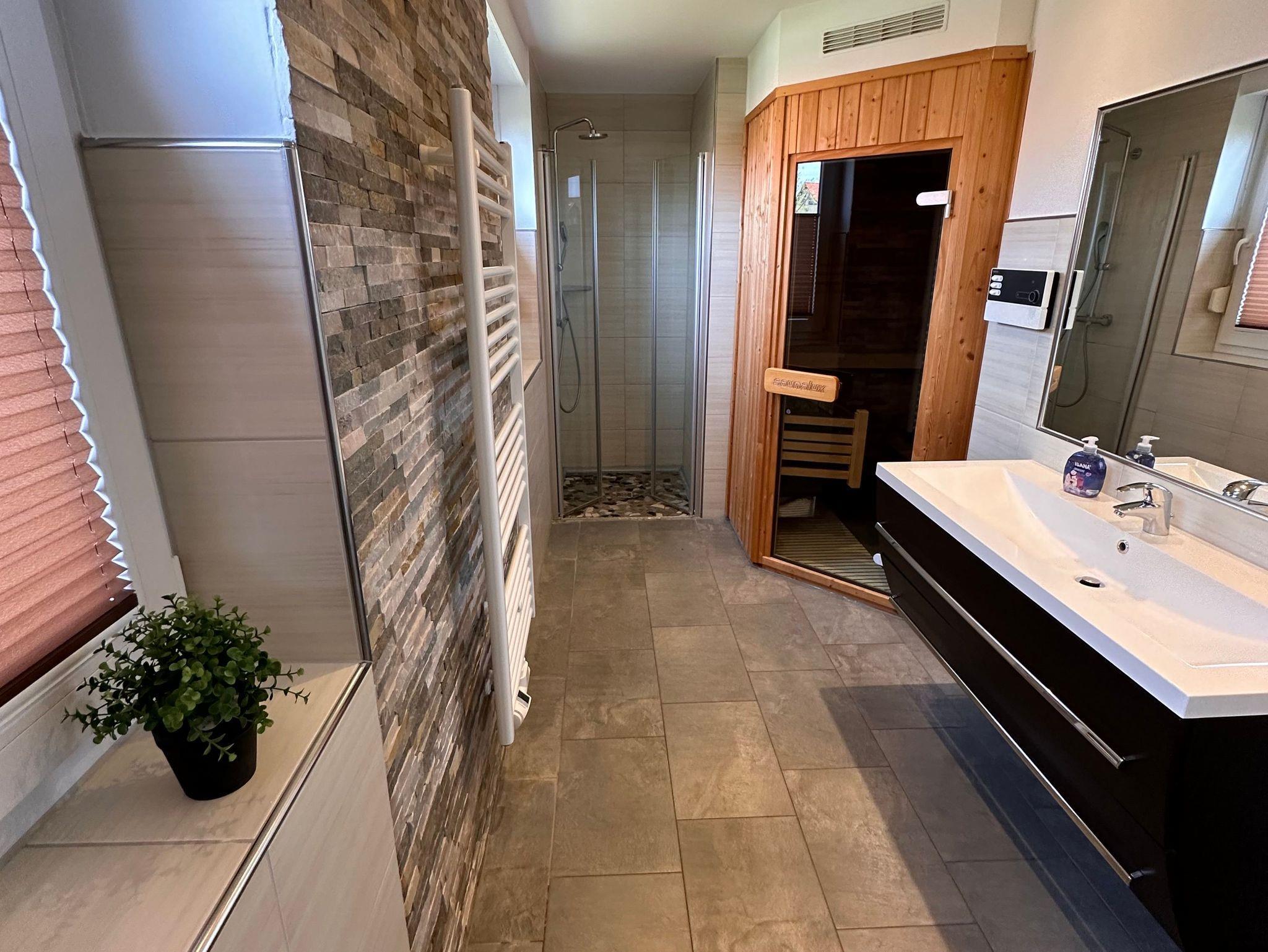 Die Bäder bieten moderne Waschtische und Raindanceduschen. Das große Bad verfügt zusätzlich über eine Badewanne und einer Sauna. Alle Räume werden über eine Fussbodenheizung beheizt..