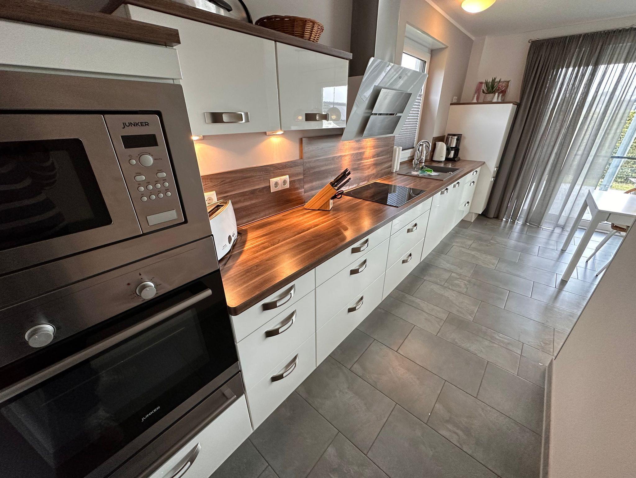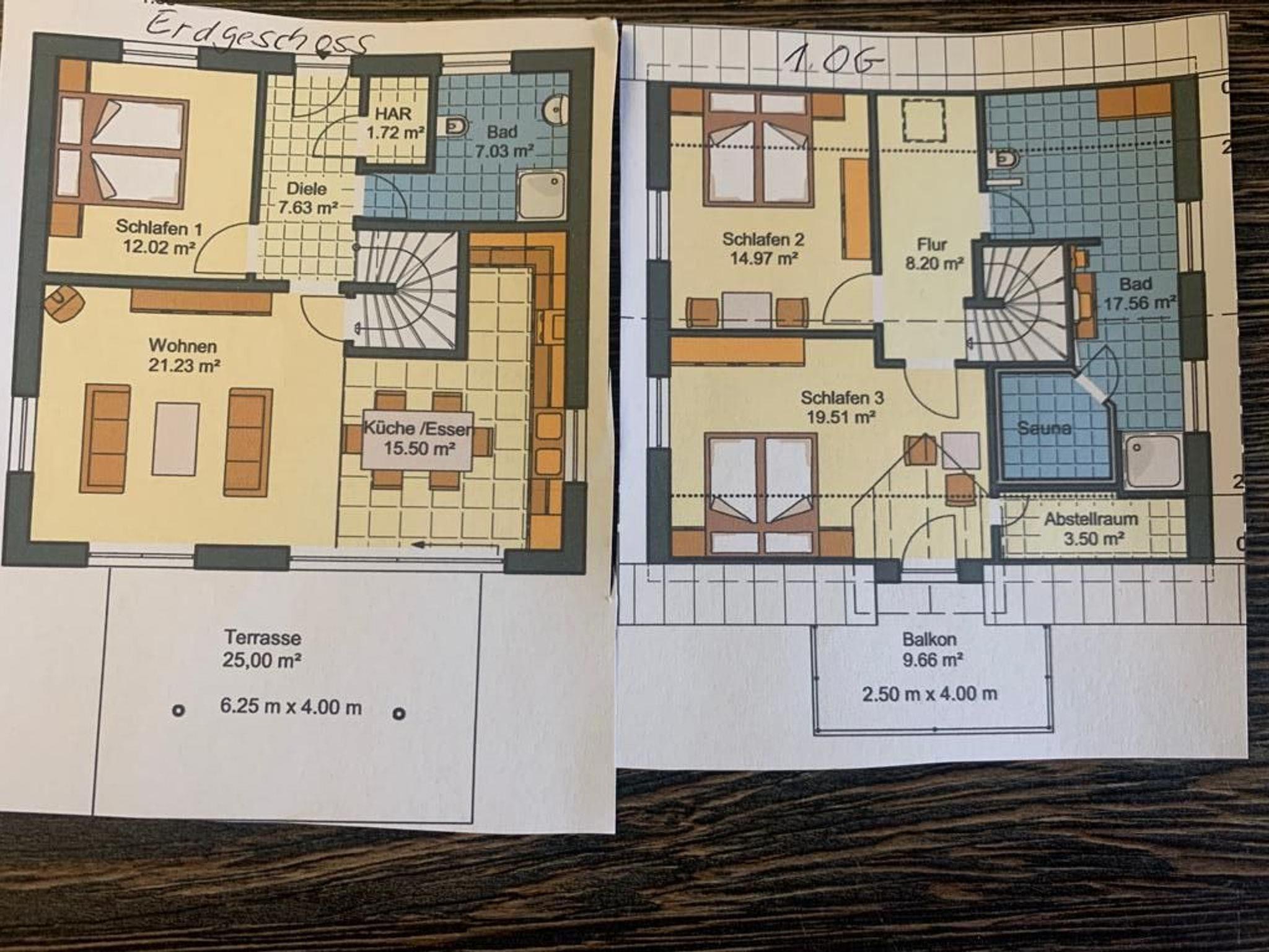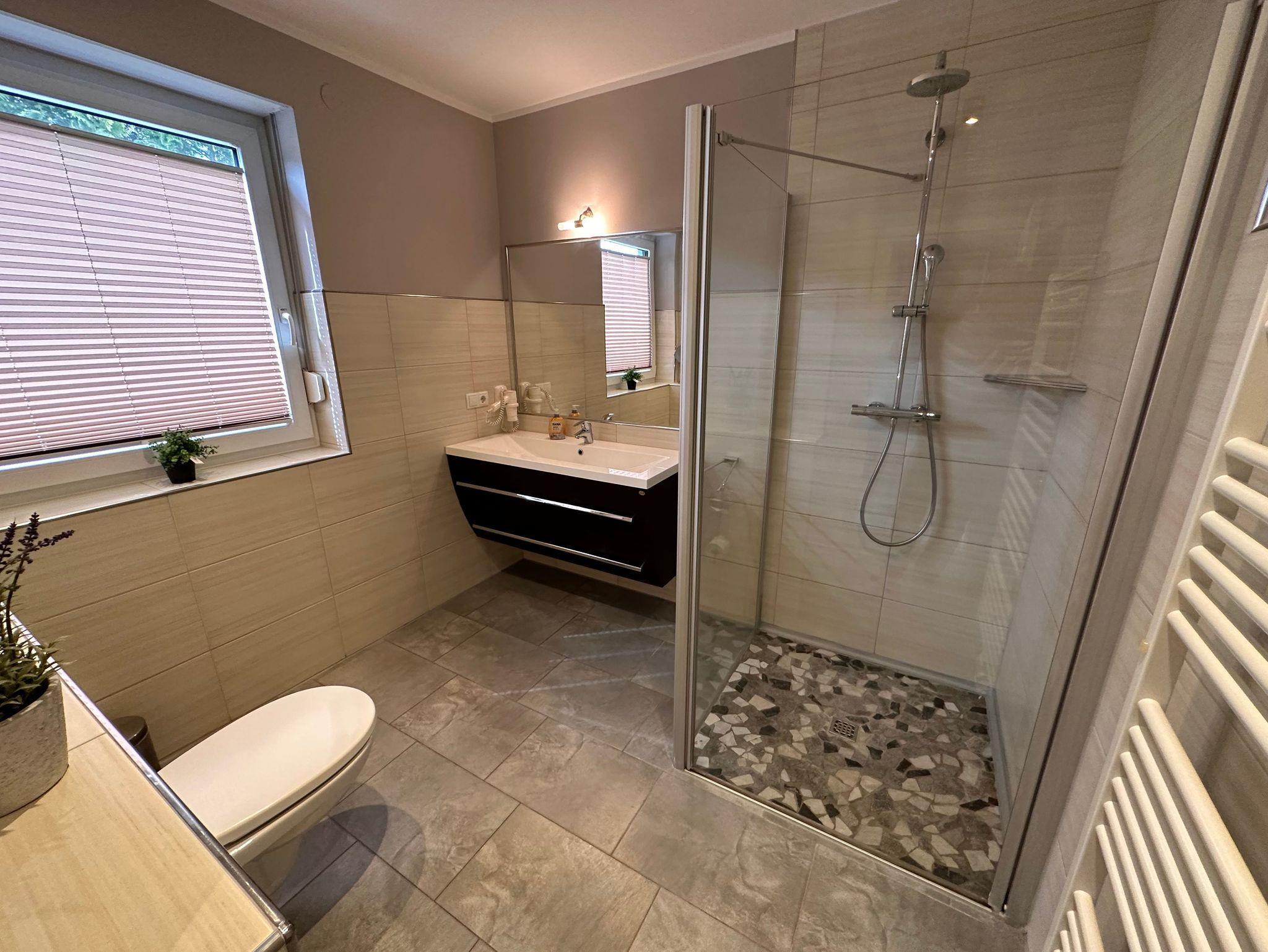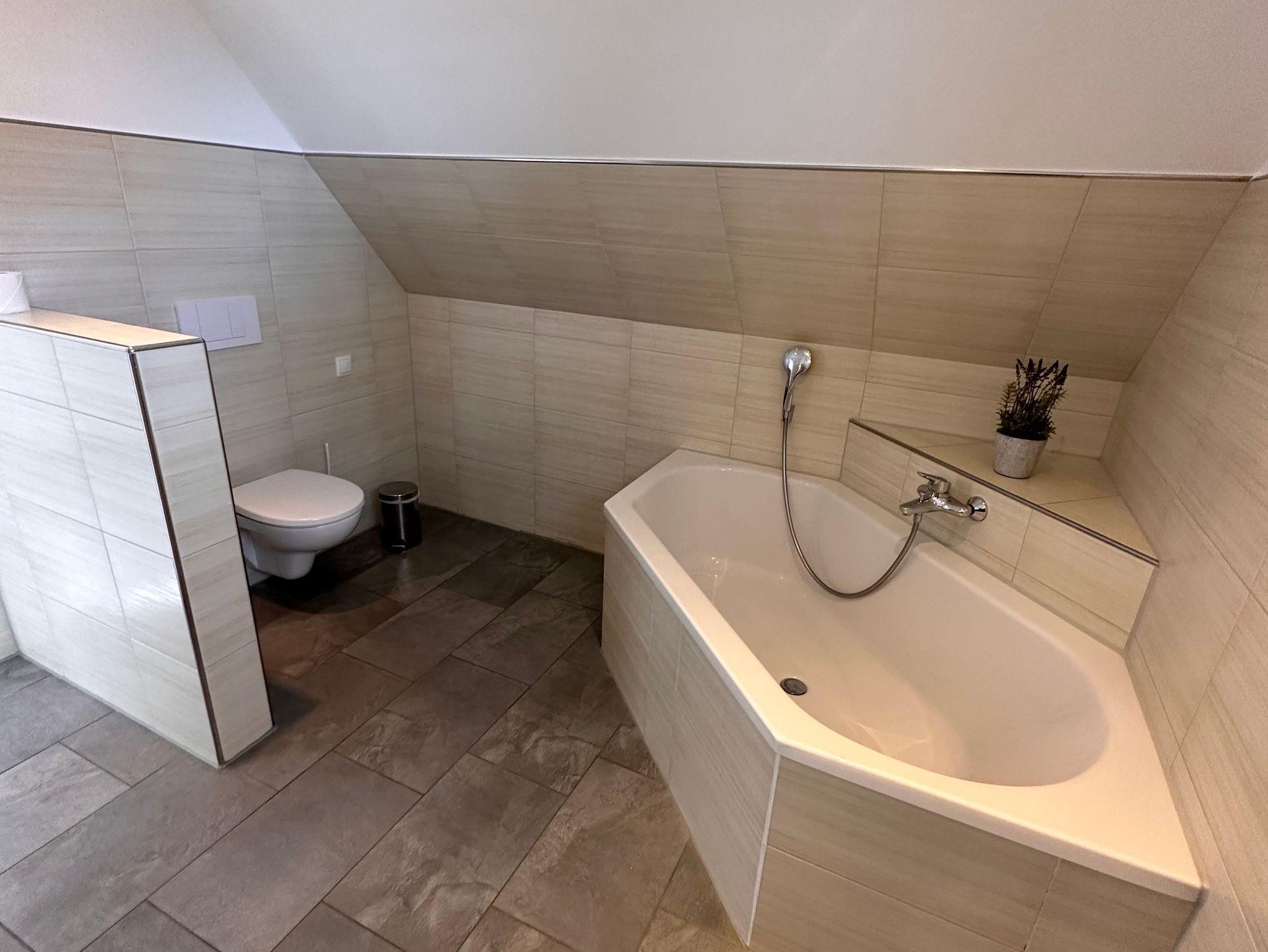 Die Bäder bieten moderne Waschtische und Raindanceduschen. Das große Bad verfügt zusätzlich über eine Badewanne und einer Sauna. Alle Räume werden über eine Fussbodenheizung beheizt..