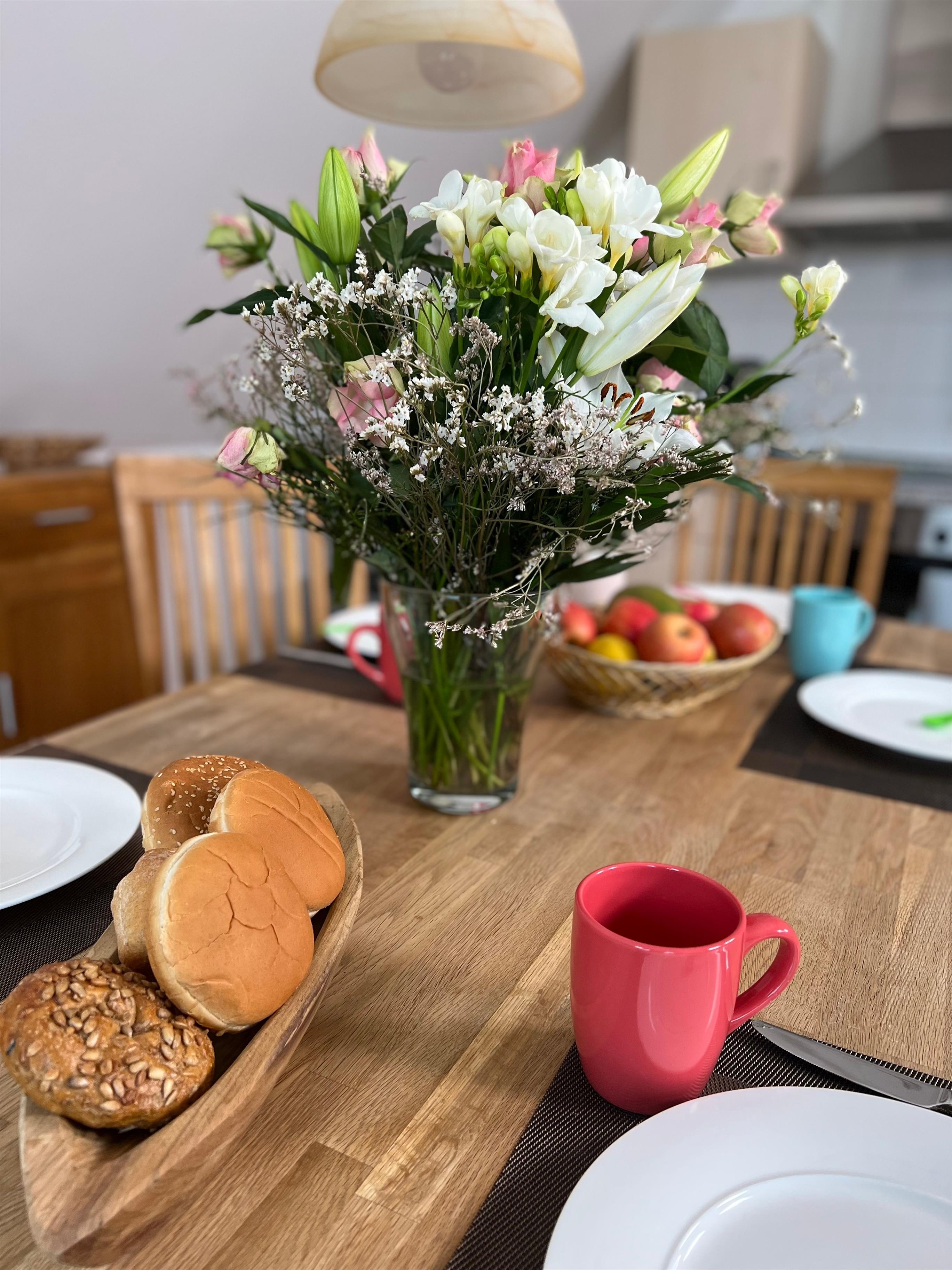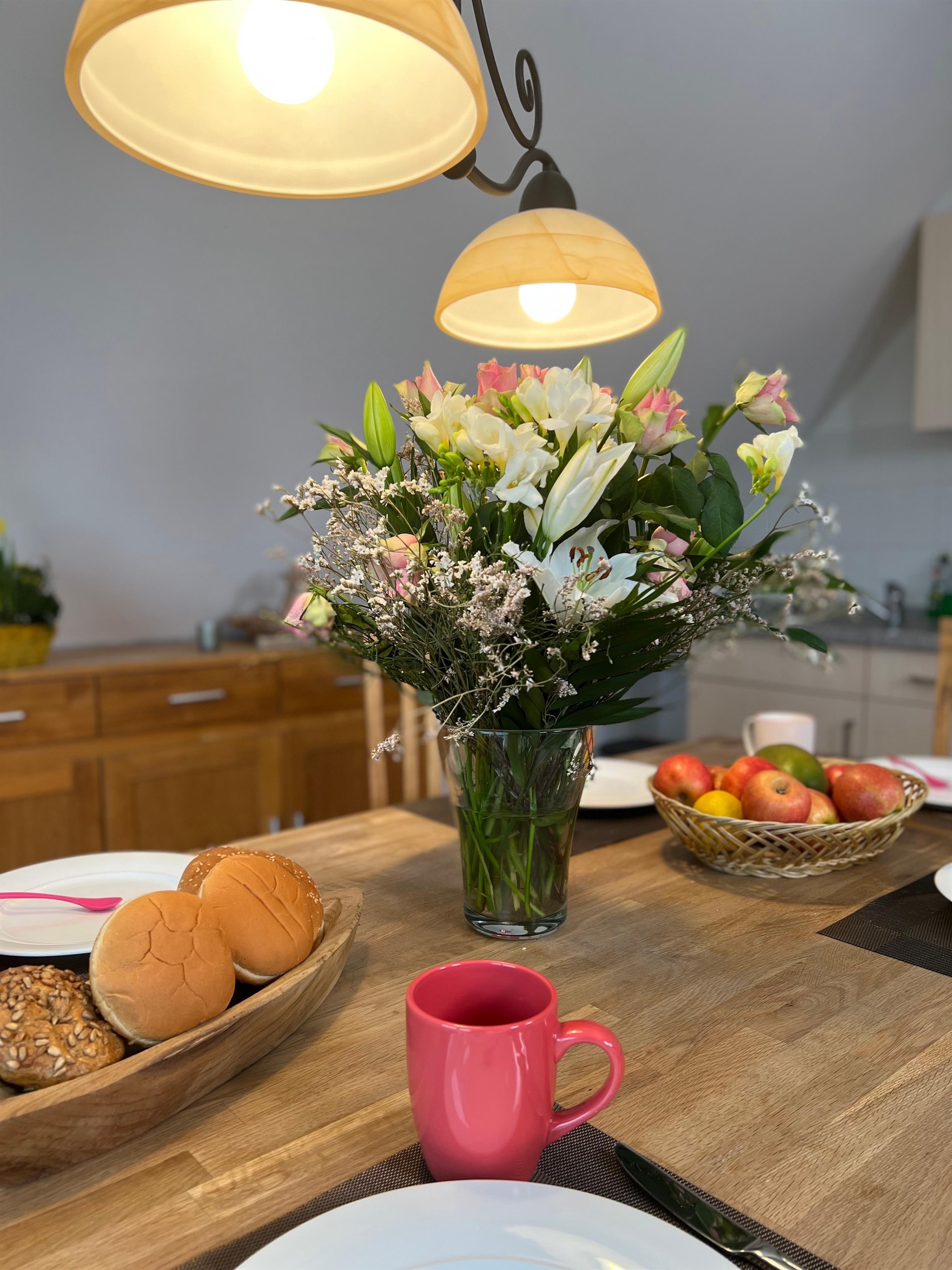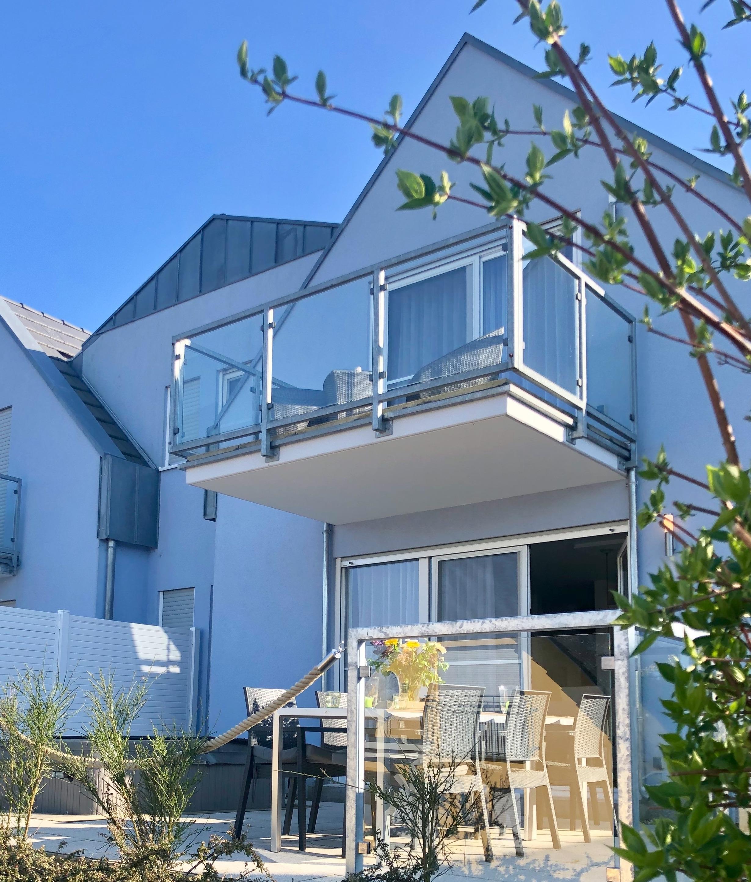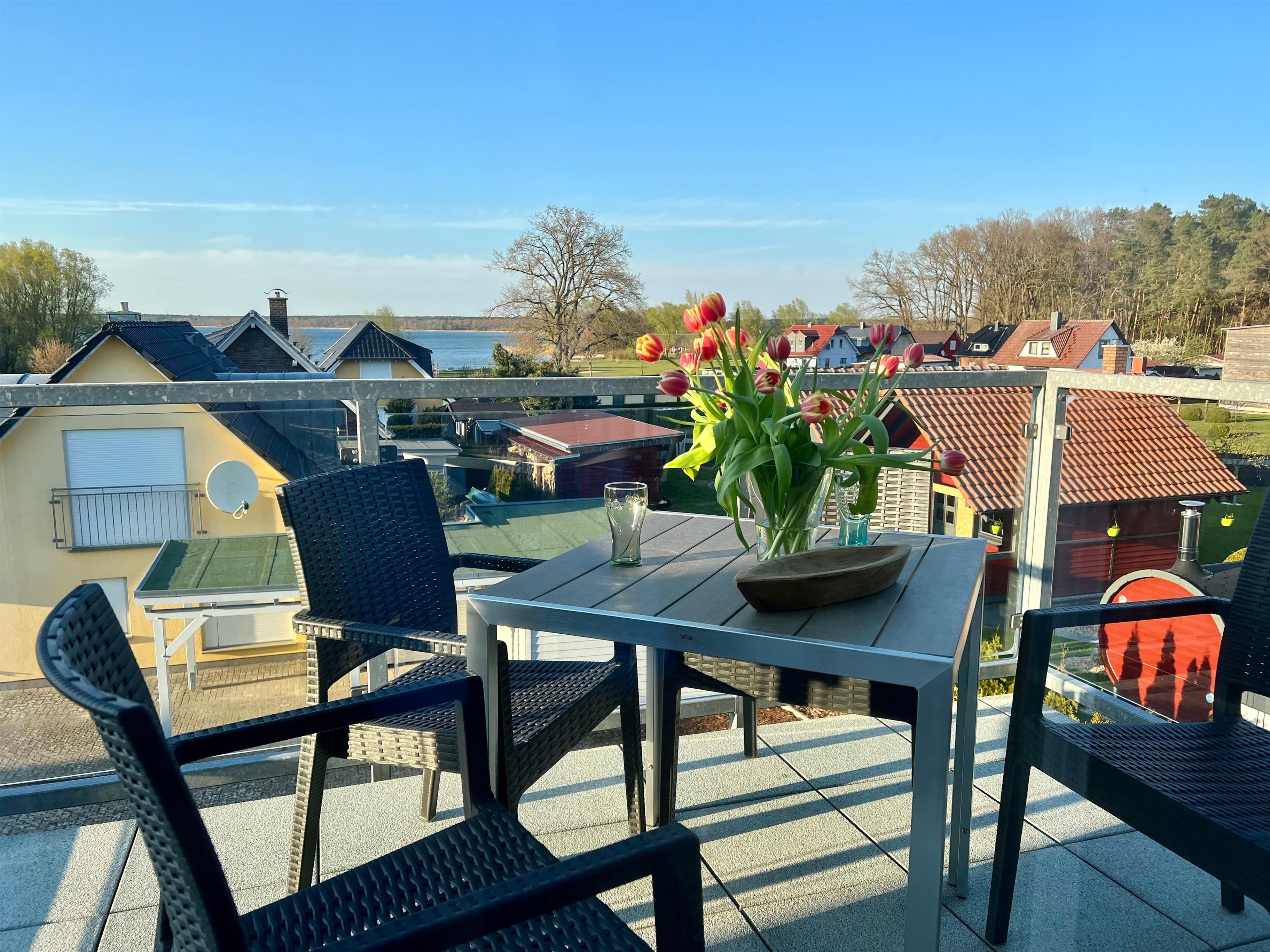 Du betrittst das Objekt über den Hauseingang und gehst durch den Hausflur auf die erste Etage. Wenn du die Ferienwohnung Kapitäns – Seeblick betrittst, kannst du von dem großzügigen Flur sternförmig alle Räume entdecken. Das Tageslicht Duschbad, die zwei gemütlichen Schlafzimmer und nicht zuletzt den großen Wohn – und Essbereich mit offener Küche. Von dort aus gelangst du auf den schönen Balkon der mit modernen Terrassenmöbel möbliert ist und genießt den Blick auf den See.