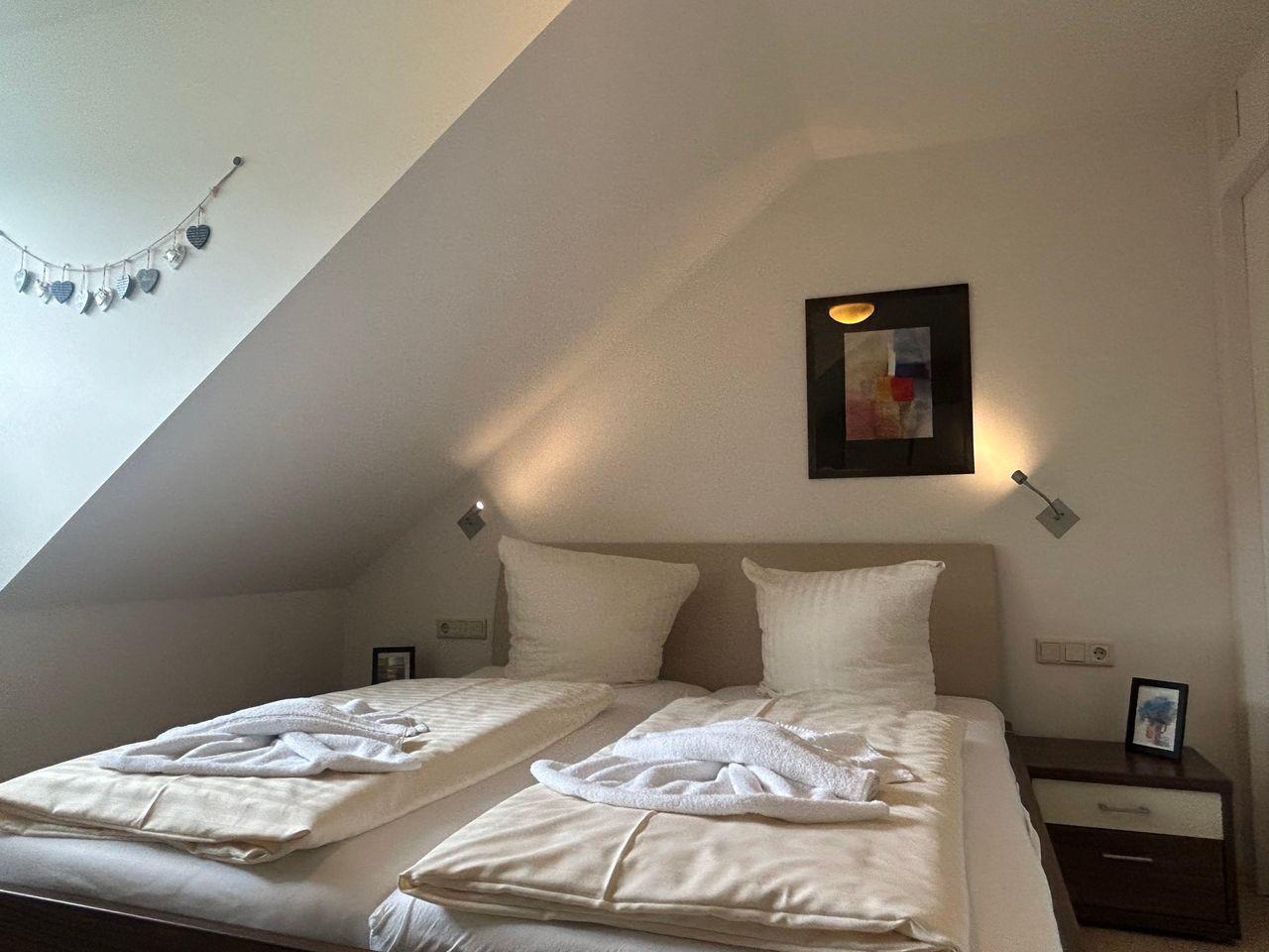 Das Schlafzimmer im Dachgeschoss ist mit 3 Einzelbetten ausgestattet, bei Bedarf können zwei davon auch zusammengestellt werden. Drei Nachttische, ein geräumiger Kleiderschrank, ein Sessel und ein Tisch sowie ein Beistellregal mit TV komplettieren die Einrichtung.