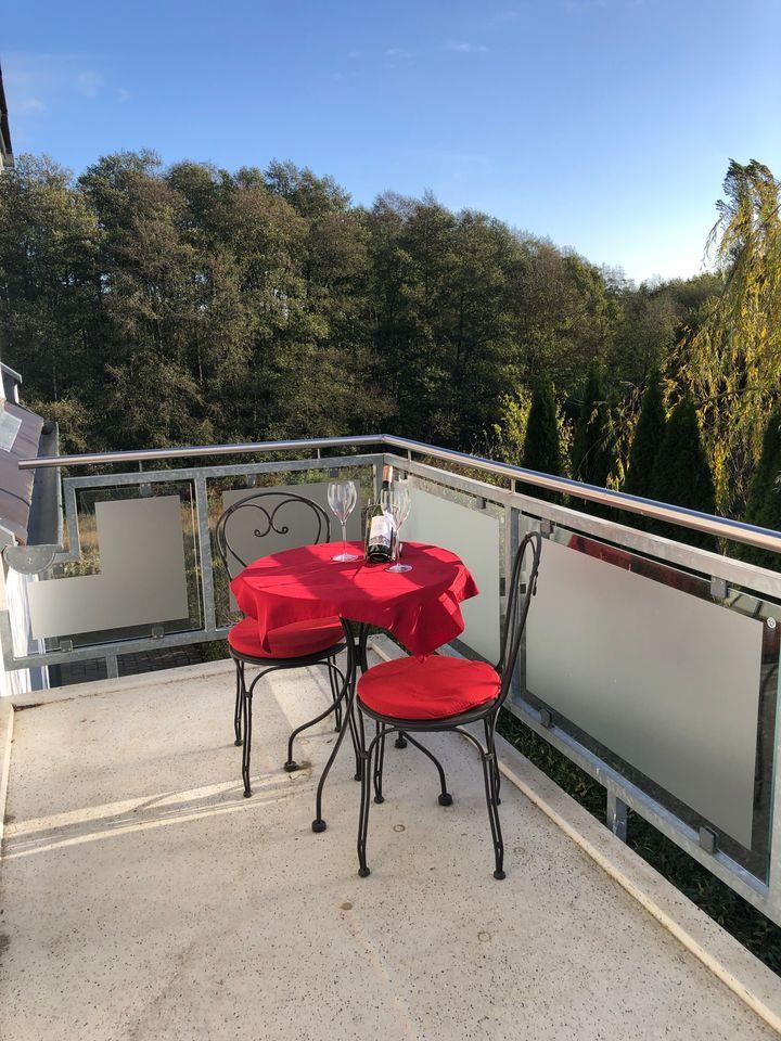 Ebenso lädt ein großzügiger Balkon, ausgestattet mit einem Tisch und 4 Stühlen sowie einem Sonnenschirm zum Verweilen ein.