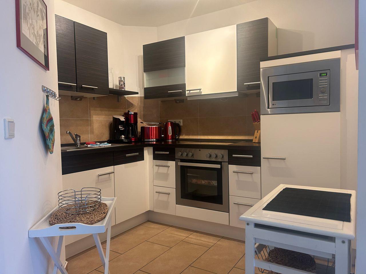 Die offene Einbauküche ist modern ausgestattet und lässt fast keine Wünsche offen.