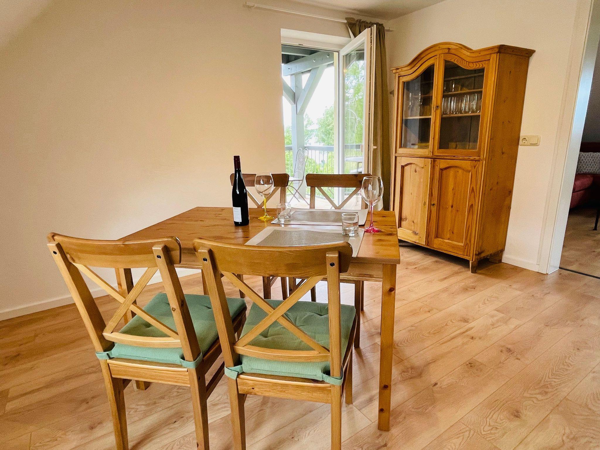 Herberge Seensucht Fewo Müritz OG mit SeeblickDie 3-Zimmer Ferienwohnung Müritz mit 65 m² und traumhaftem Seeblick und liegt im Obergeschoss (links) der Herberge Seensucht. Neben einem großen Schlafzimmer mit einem Doppelbett verfügt sie über ein geräumiges Wohnzimmer mit einer ausziehbaren Schlafcouch sowie einem Esszimmer mit kleiner Küchenzeile. Das Badezimmer ist mit einer Dusche ausgestattet.