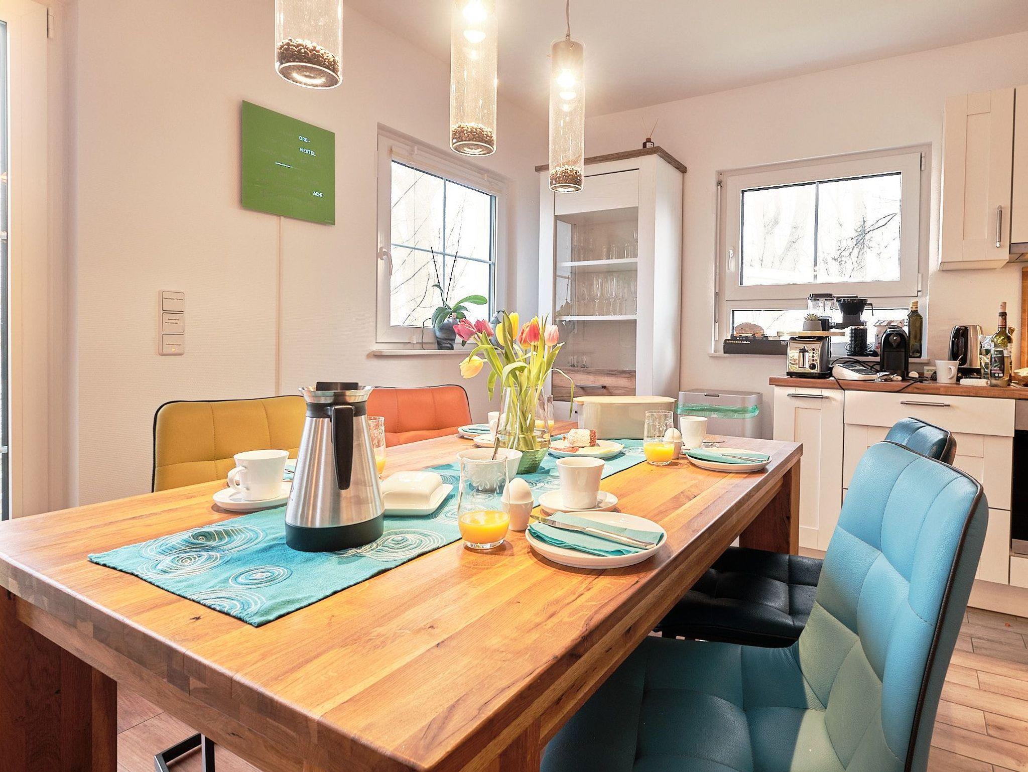 Der großzügige Wohnbereich im Erdgeschoss läd zum gemeinsamen Kochen, Essen und Entspannen ein. Unsere Küche ist vollausgestattet mit Ofen, Mikrowelle, KÜhl-Gefrierschrank und Geschirrspülmaschine, zwei hochwertigen Kaffeemaschinen, Wasserkocher, Eierkocher, Backzubehör und Kindergeschirr.