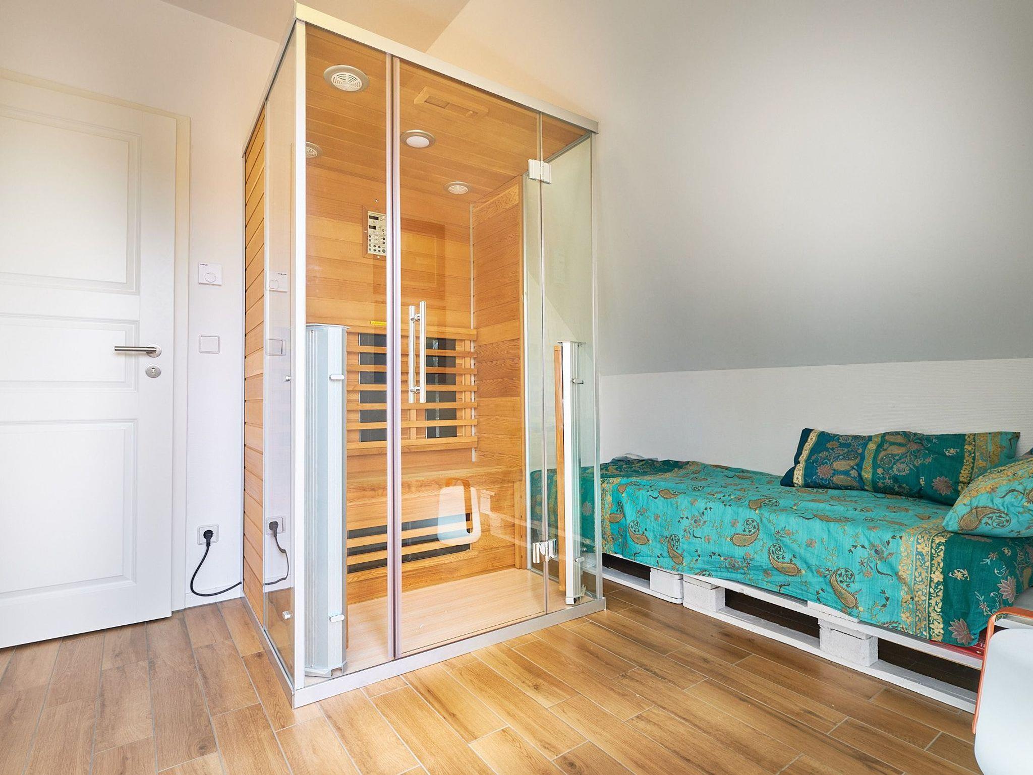 - 1x Schlafzimmer mit Einzelbett, Balkonzugang und Infrarotsauna, voll abdunkelbar mit Moskitoschutz