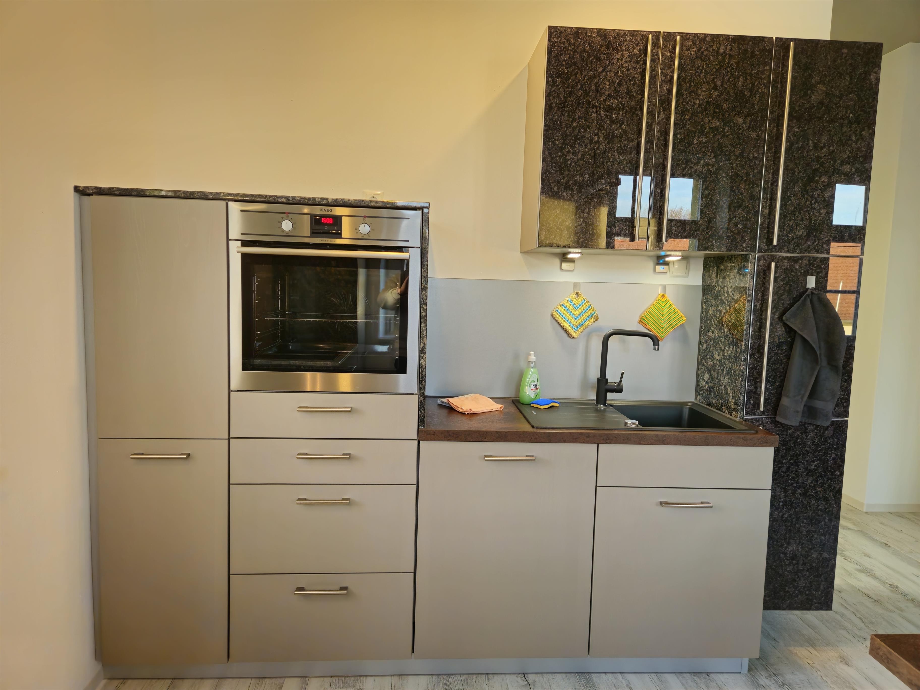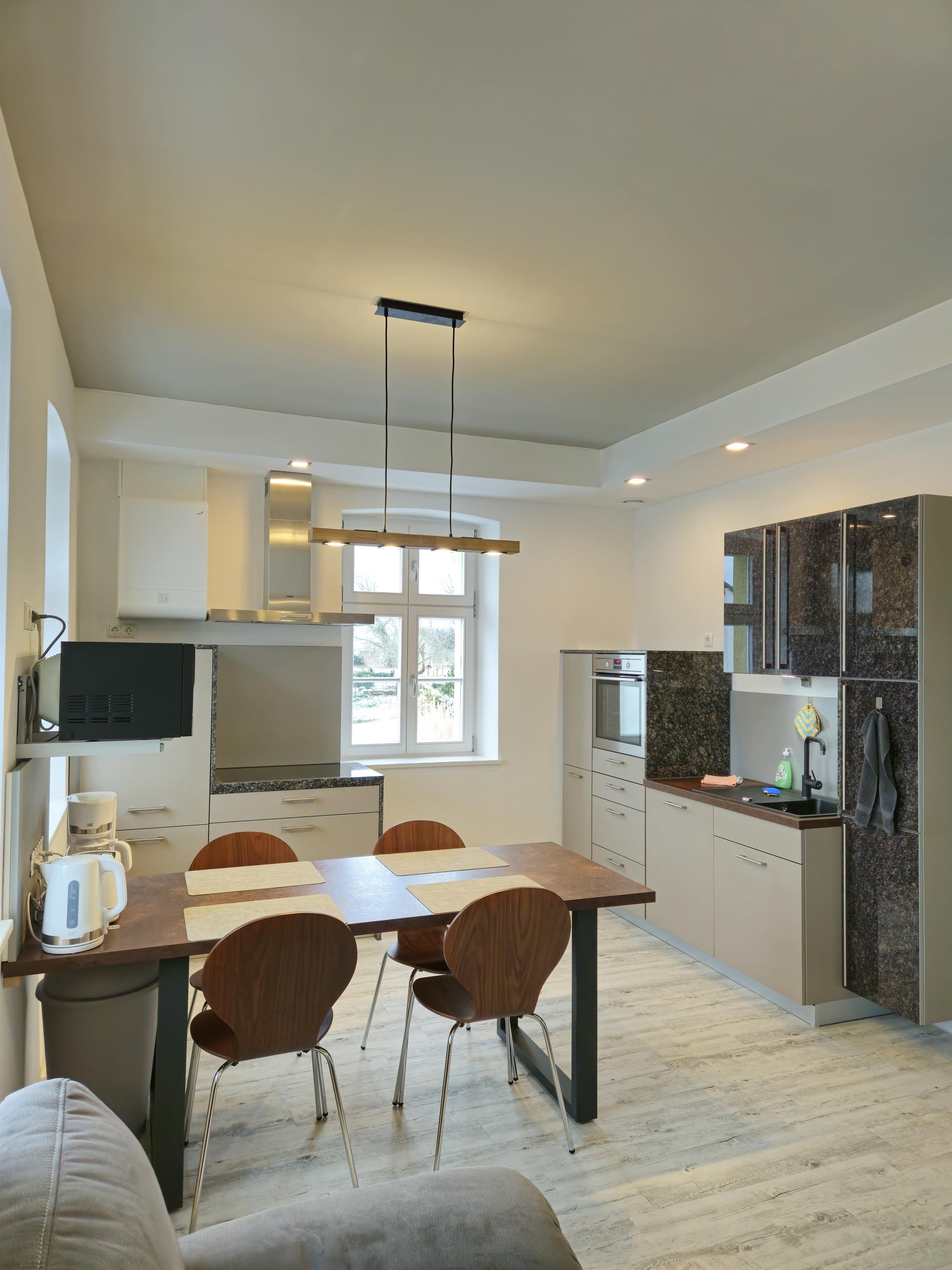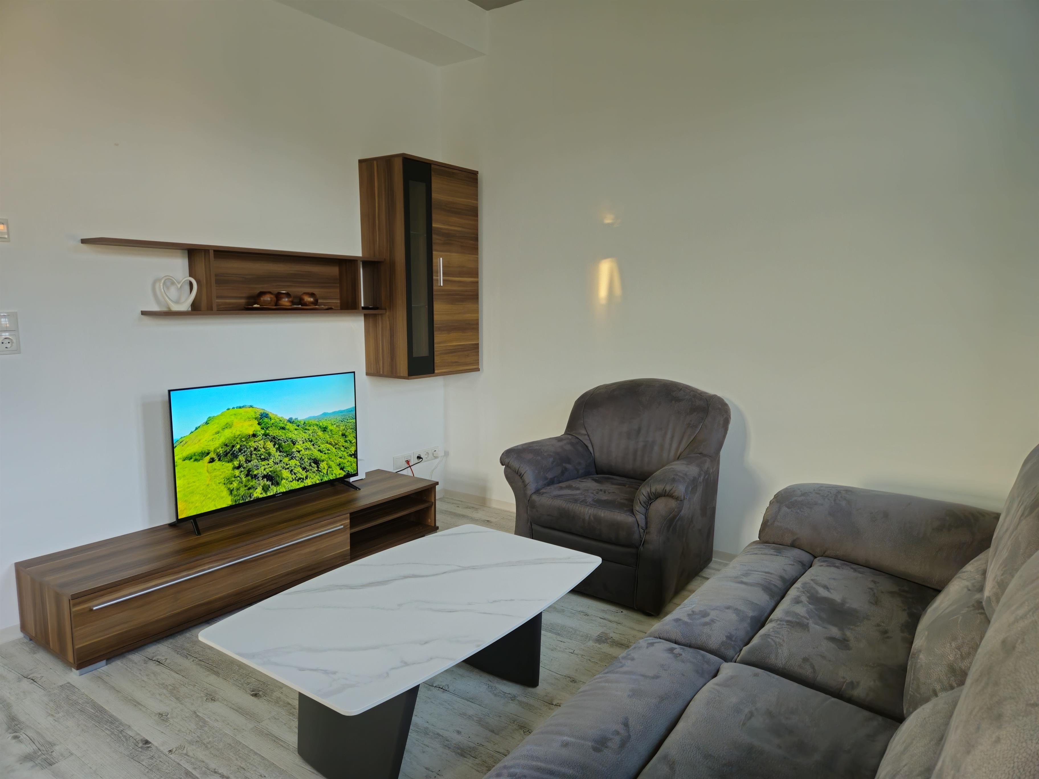 Die Wohnung hat ein großes Schlafzimmer mit einem 180x200 cm Boxspringbett, Schminktisch und Kofferablage. Das andere besitzt zwei 90x200 cm Einzelbetten aus Holz sowie 2 Schreibtische. Im offenen Wohnzimmer - Küche Bereich ist eine voll ausgestattete Küche mit Induktionskochfeld, Backofen, Mikrowelle, Geschirrspüler, Kühlschrank, Gefrierschrank, Wasserkocher, Toaster, Kaffeemaschine (Filter vorhanden), komplettes Geschirr und alles, was zum Kochen benötigt wird. Das Badezimmer ist mit einer ebenerdigen Dusche ausgestattet.