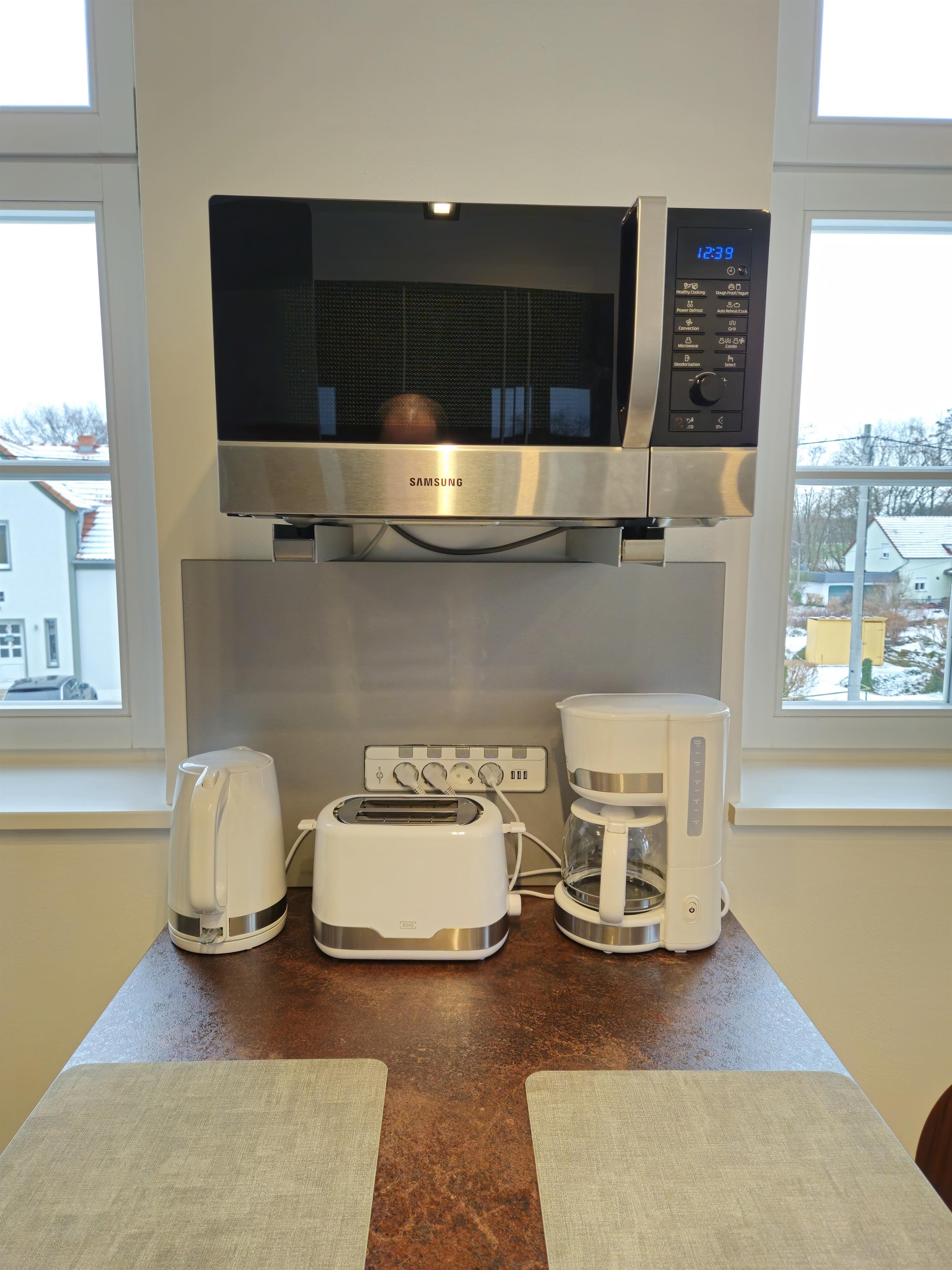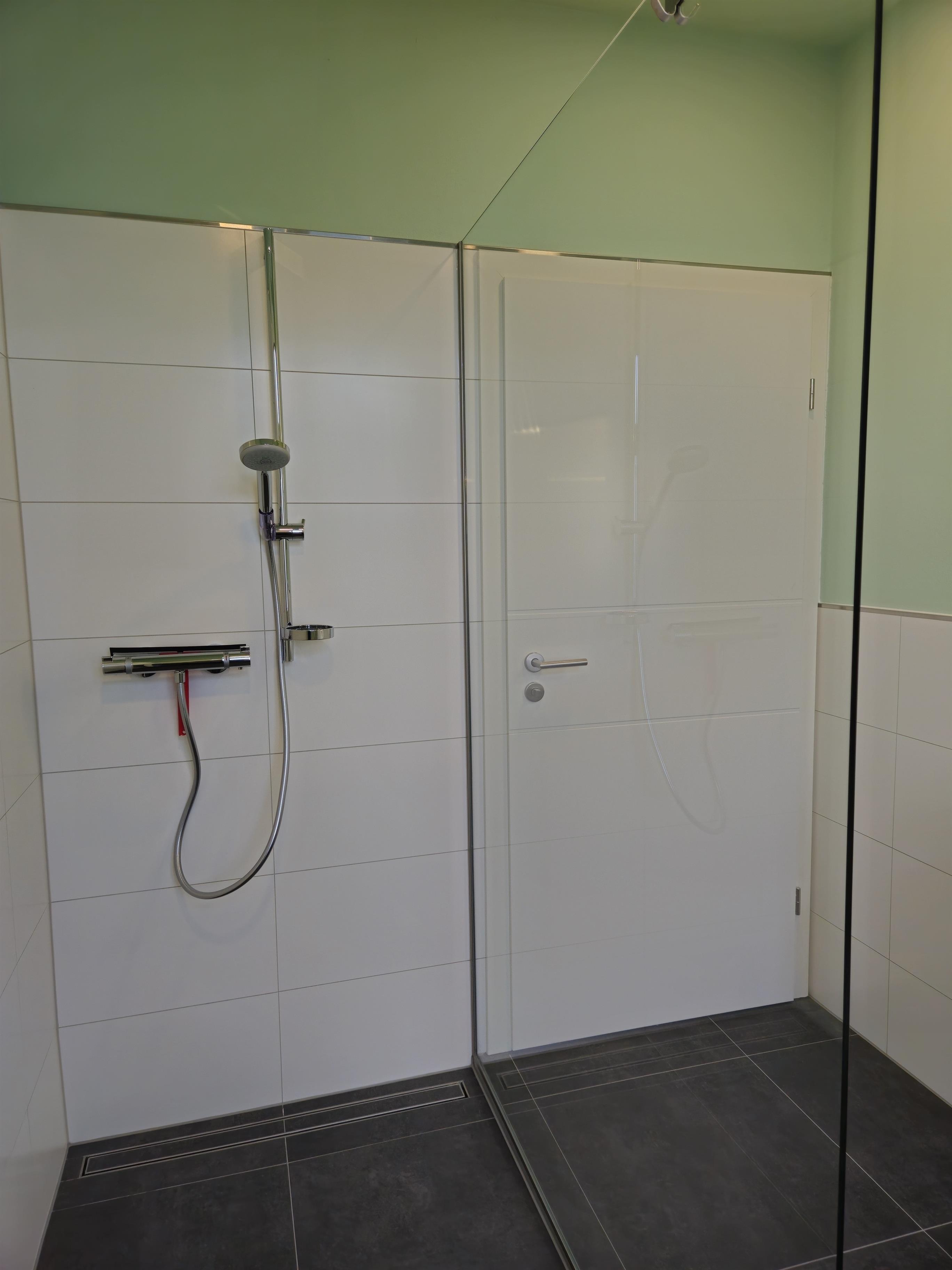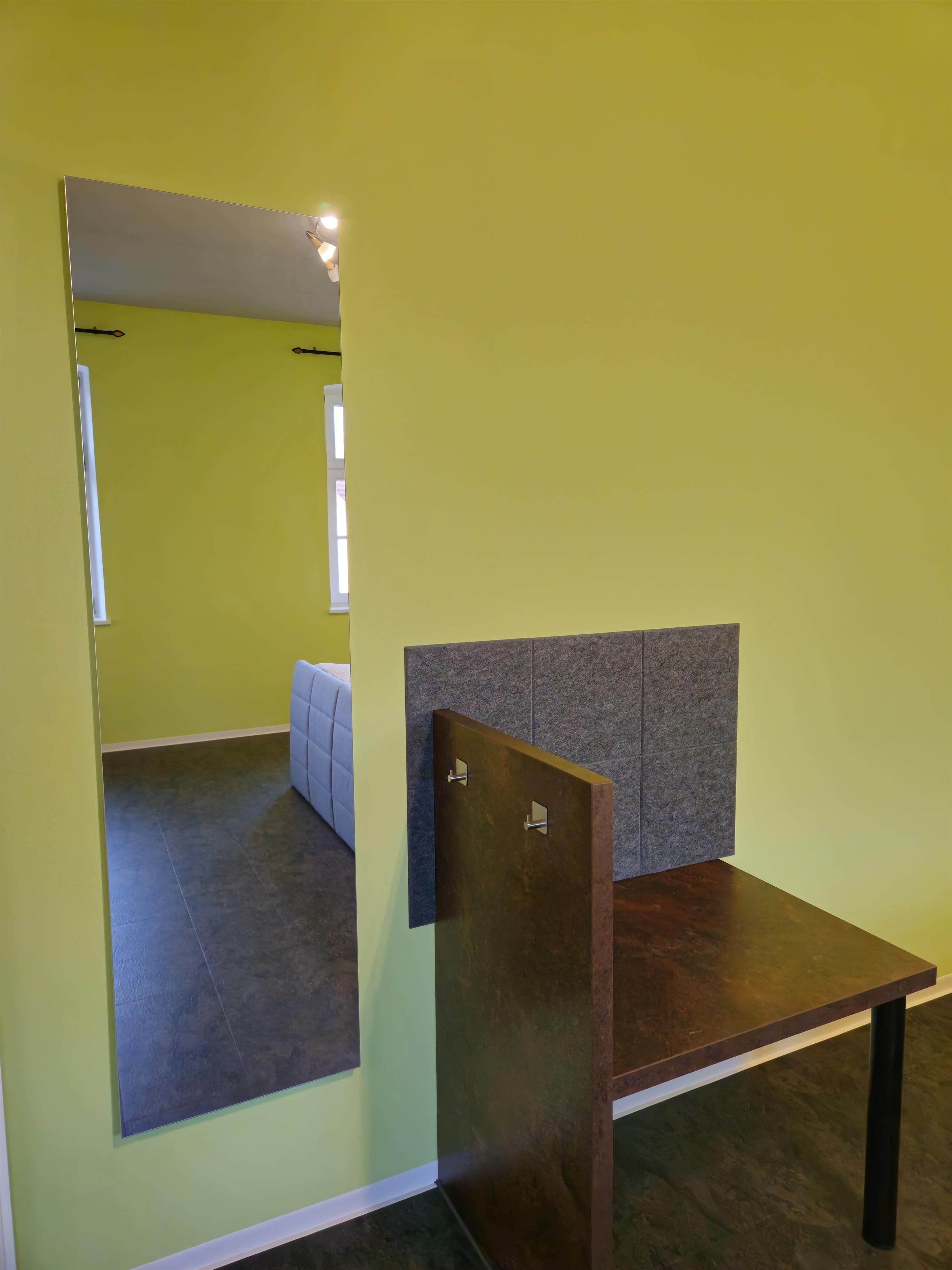 Die Wohnung hat ein großes Schlafzimmer mit einem 180x200 cm Boxspringbett, Schminktisch und Kofferablage. Das andere besitzt zwei 90x200 cm Einzelbetten aus Holz sowie 2 Schreibtische. Im offenen Wohnzimmer - Küche Bereich ist eine voll ausgestattete Küche mit Induktionskochfeld, Backofen, Mikrowelle, Geschirrspüler, Kühlschrank, Gefrierschrank, Wasserkocher, Toaster, Kaffeemaschine (Filter vorhanden), komplettes Geschirr und alles, was zum Kochen benötigt wird. Das Badezimmer ist mit einer ebenerdigen Dusche ausgestattet.
