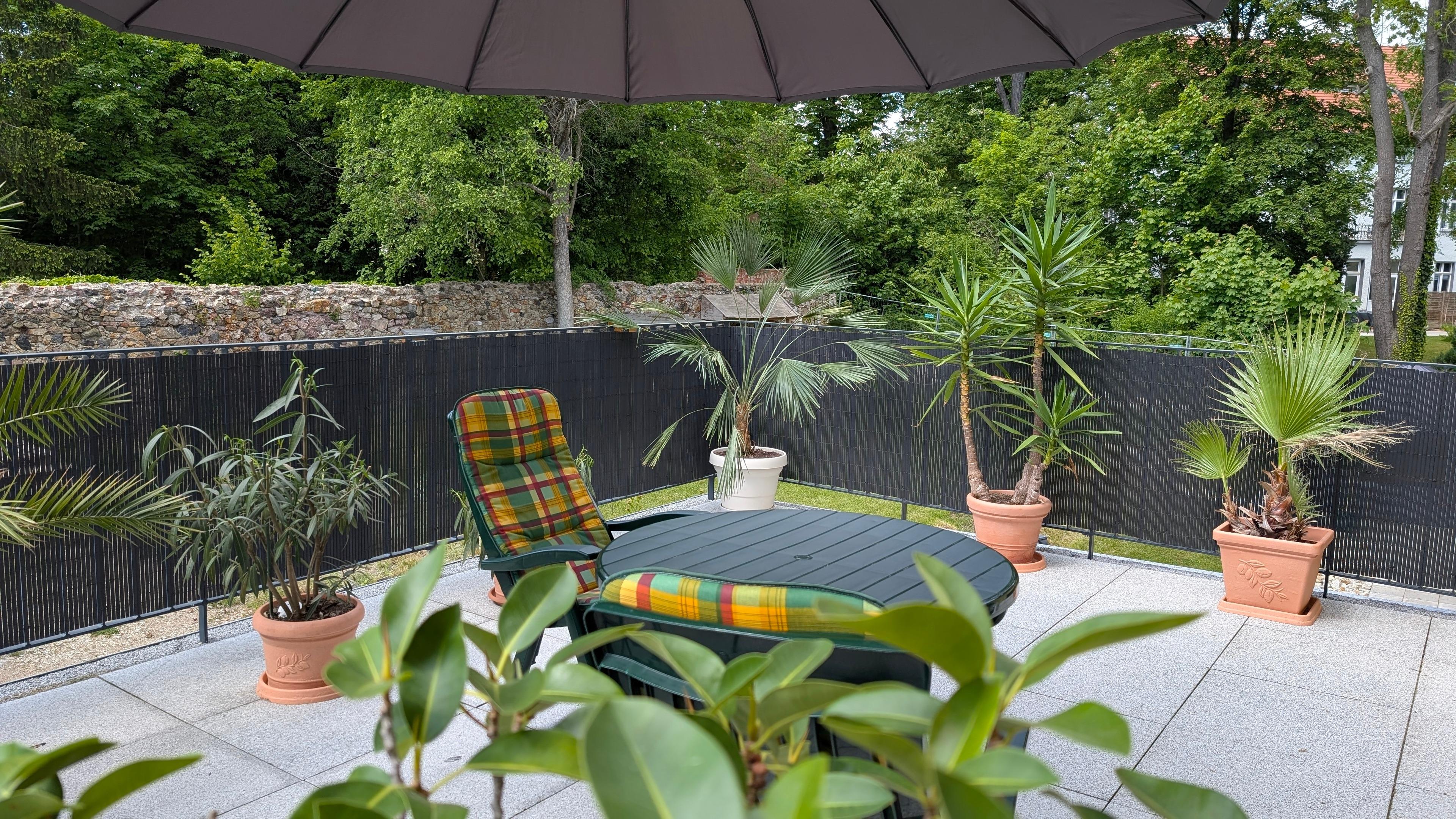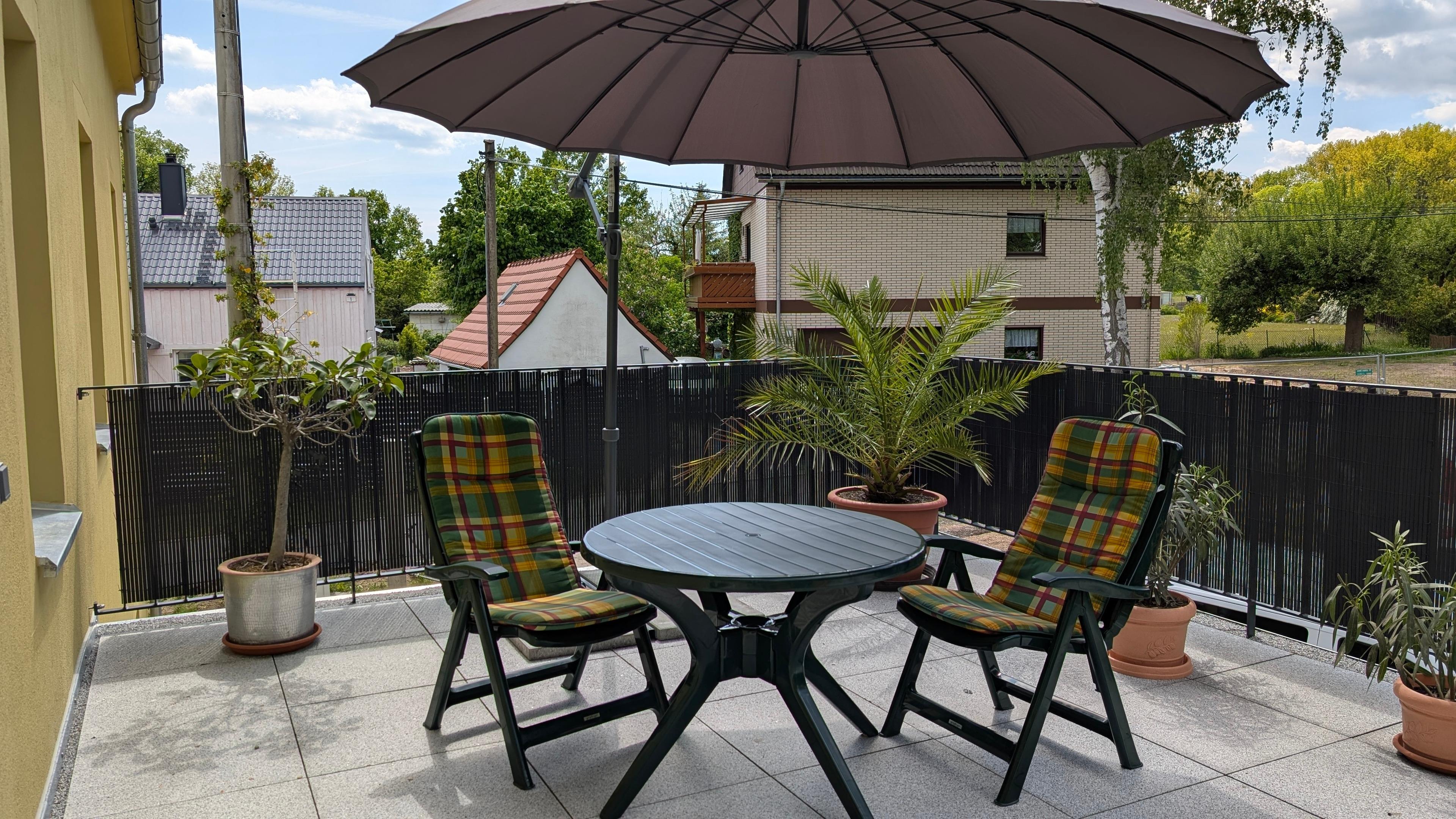 Die 23 m² große Terrasse mit Tisch und Stühlen lädt zum Aufenthalt im Freien ein. Sie wird ausschließlich durch die Gäste genutzt.
