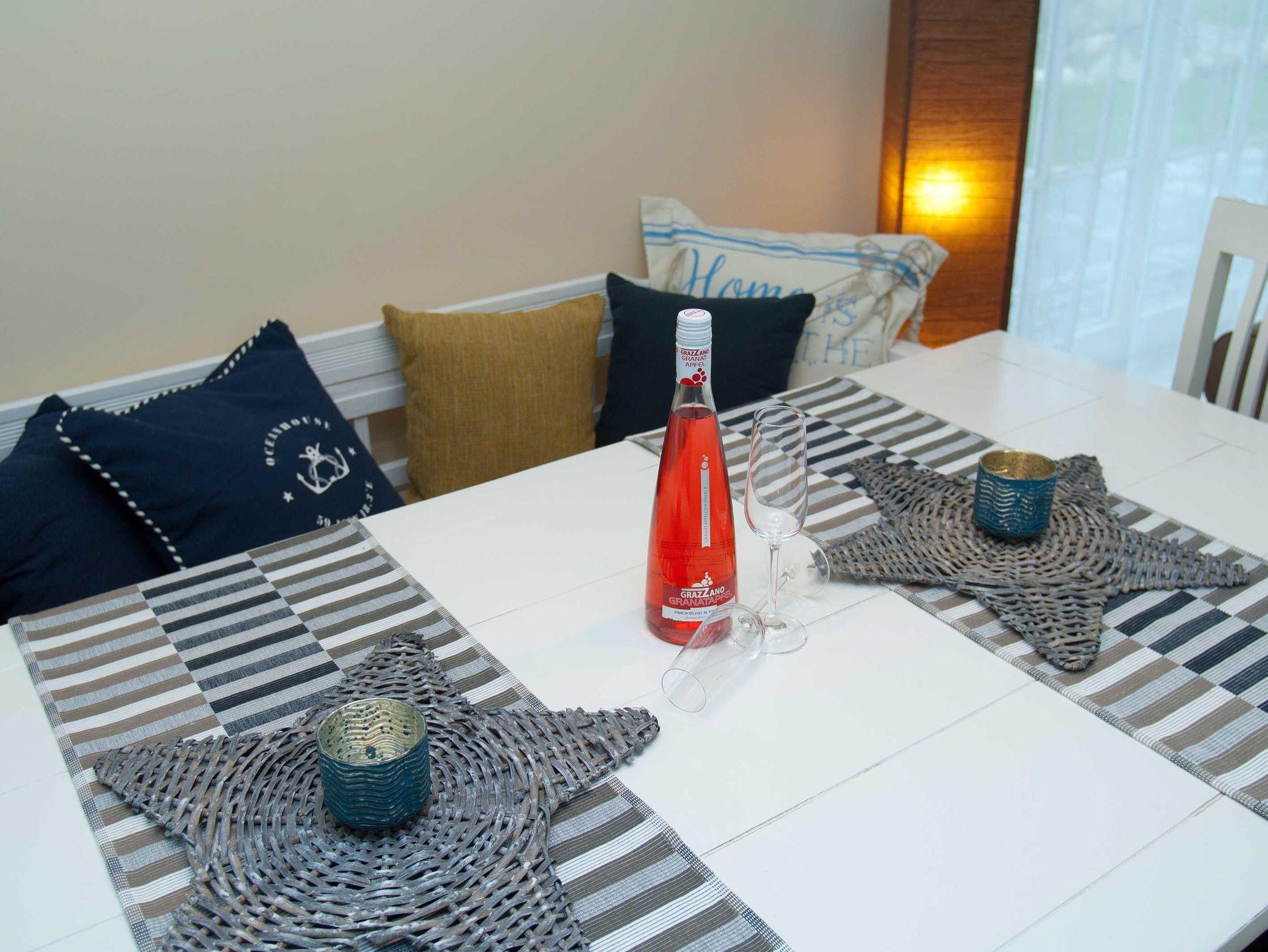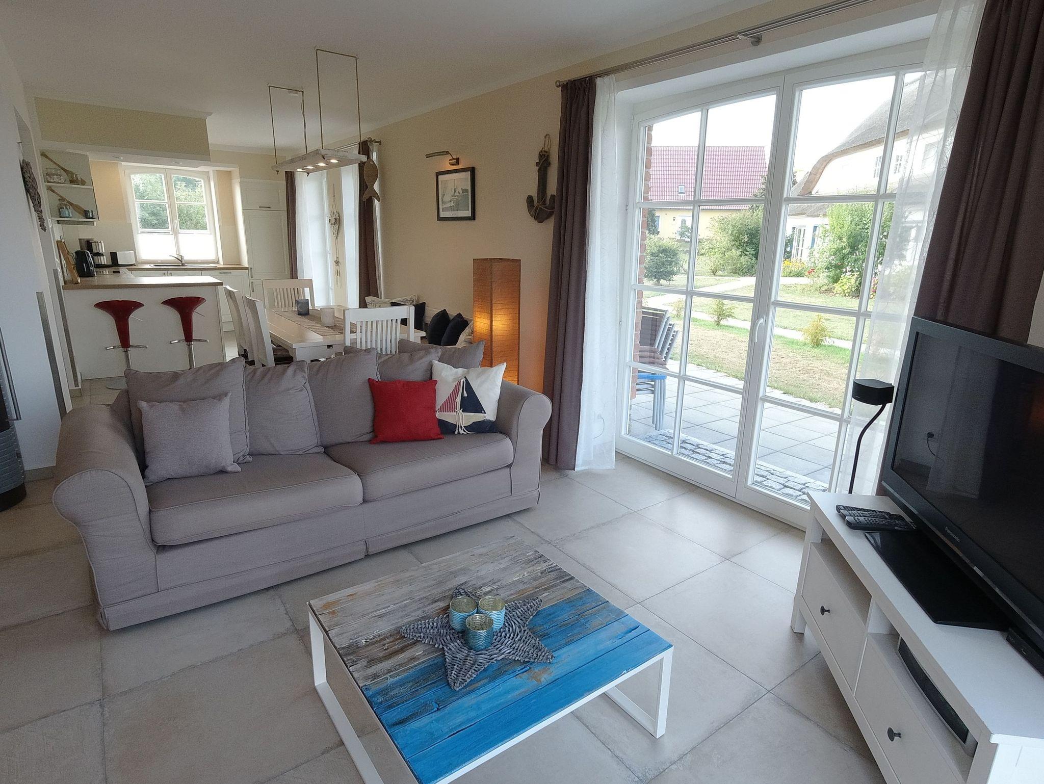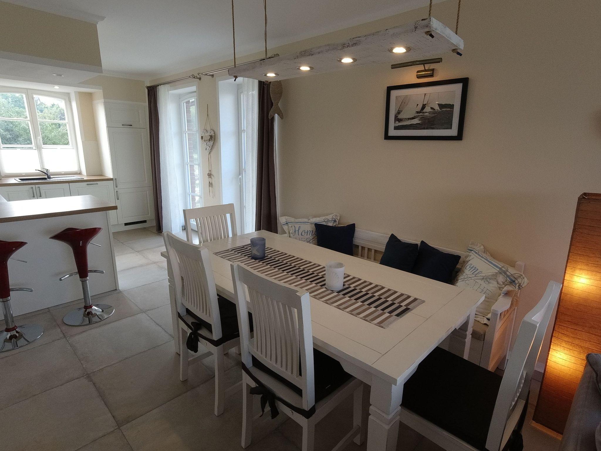 Die liebevoll eingerichtete Ferienwohnung Boddenblick (EG) verfügt über einen großzügigen Wohnbereich mit offener Küche und Esstisch für gemütliche Abende für bis zu vier Personen.