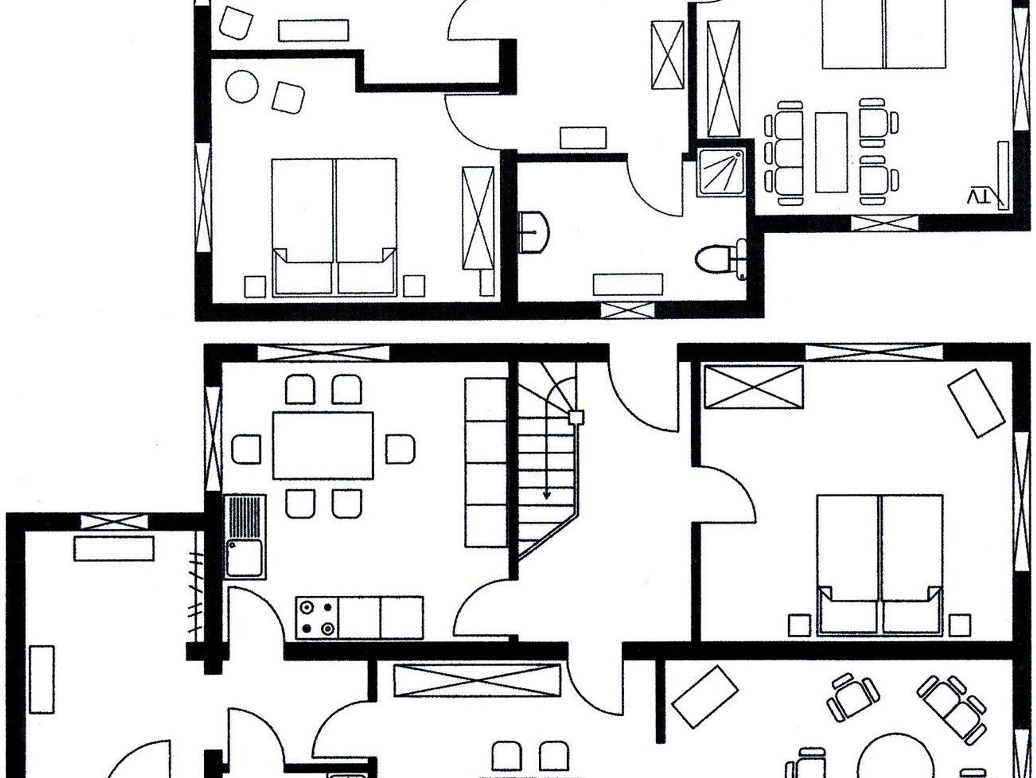 Die Unterkunft verfügt über insgesamt sechs Zimmer, darunter vier separate Schlafzimmer ( 4x Doppelbett mit 180er Breite) und zwei Badezimmer, im Erdgeschoss ein Wannenbad mit Dusche über der Wanne, im Obergeschoss ein Duschbad.