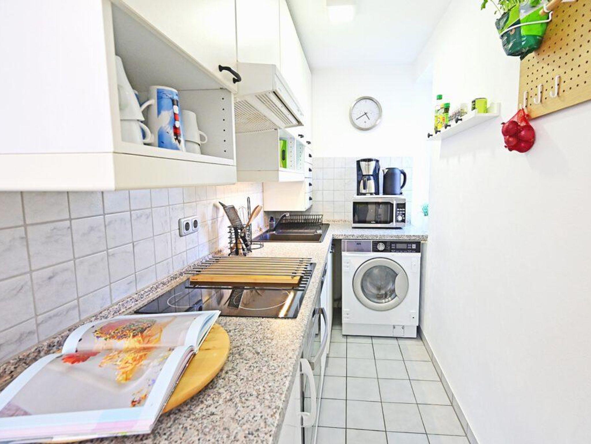 Offene kleine Küche mit Cerankochfeld, Geschirrspülmaschine, Wasch-Trockner, Backofen, Mikrowelle, Kaffeefiltermaschine, Wasserkocher und Toaster, Kühlschrank mit Gefrierfach.