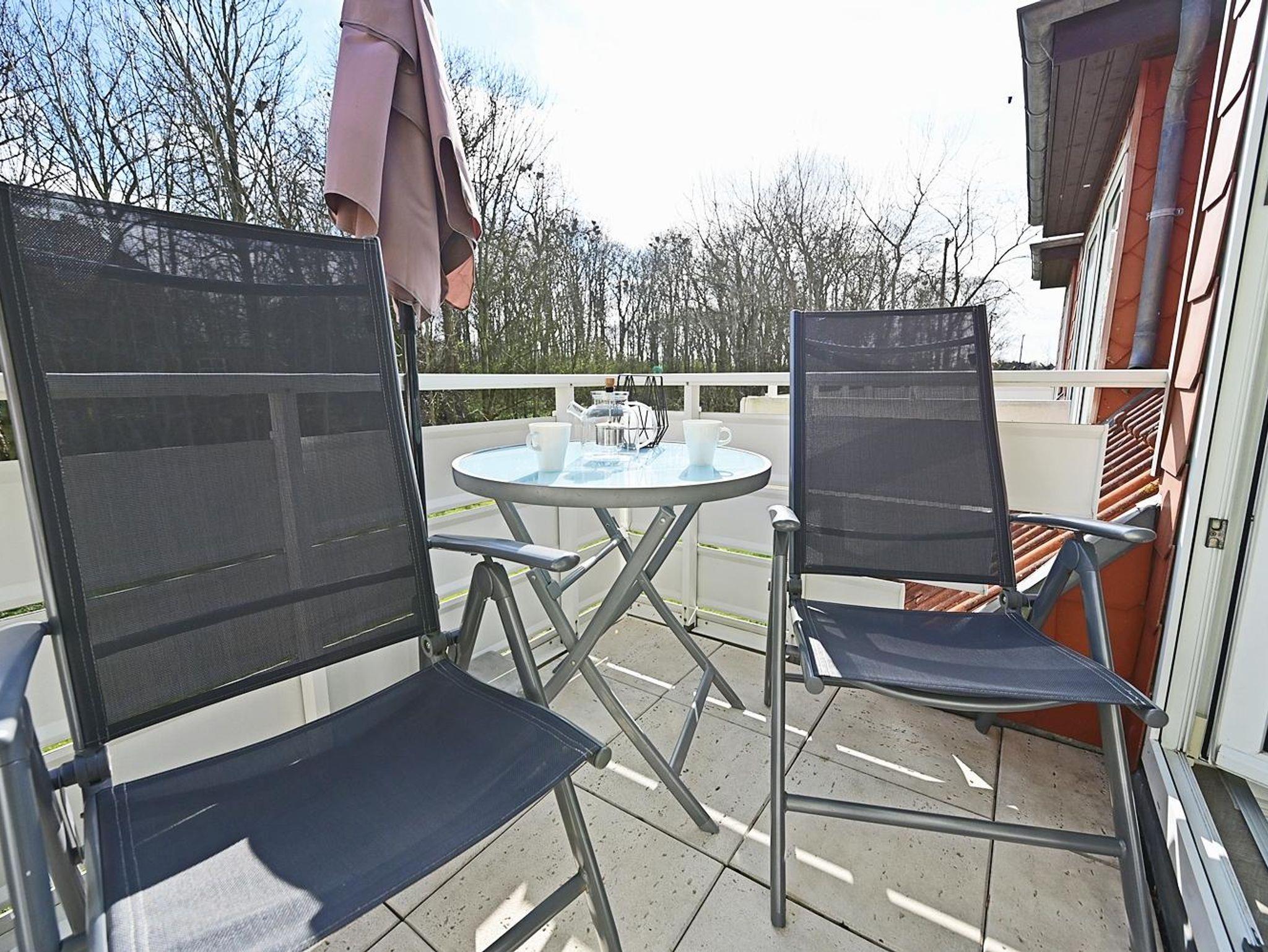 Balkon mit Gartenstühlen, Tisch und Sonnenschirm.