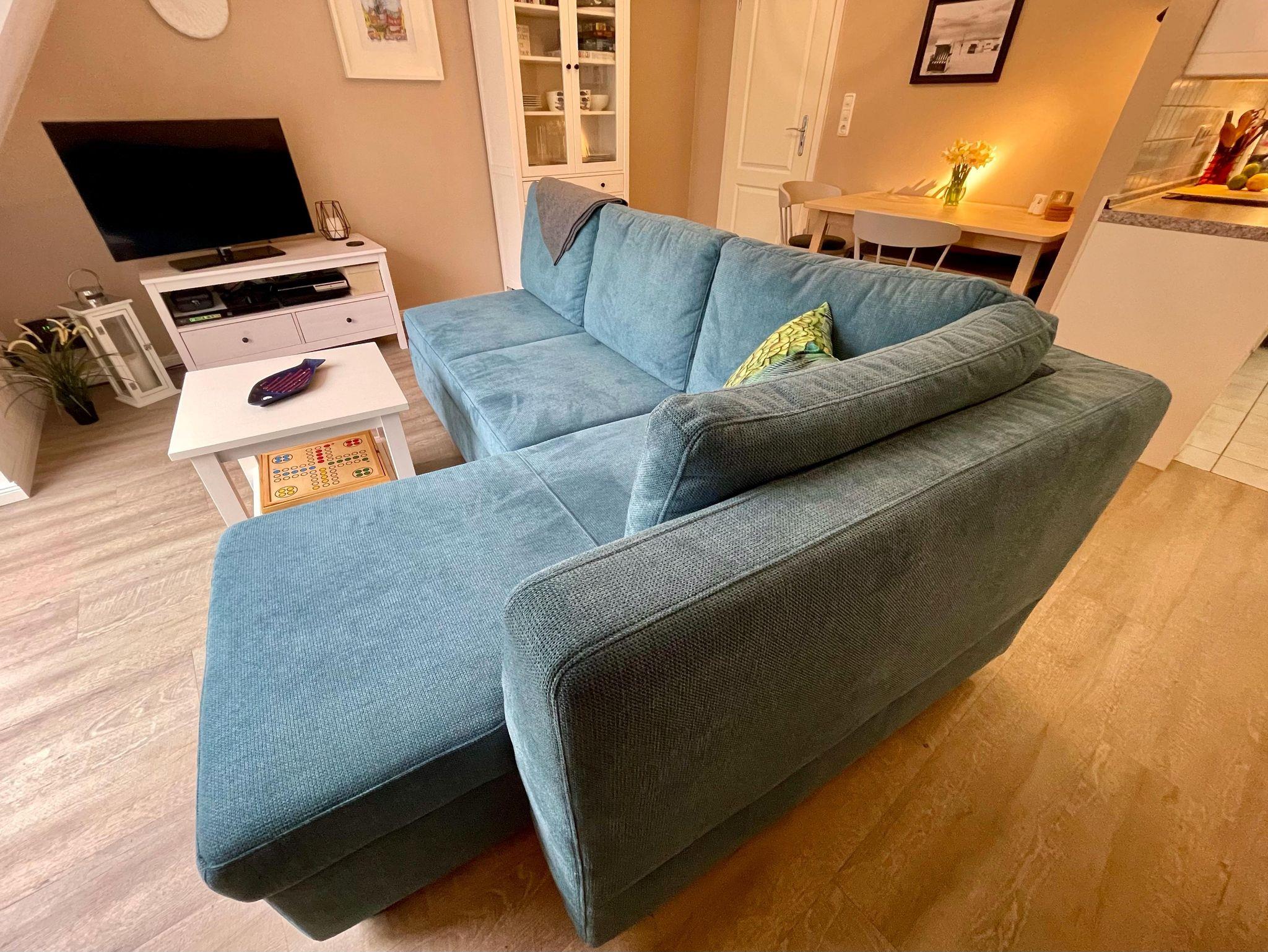 Wohn-Essraum mit Ecksofa, SAT-TV, Blue-Ray-DVD-Player, Playstation III, Spiele und Büchern.