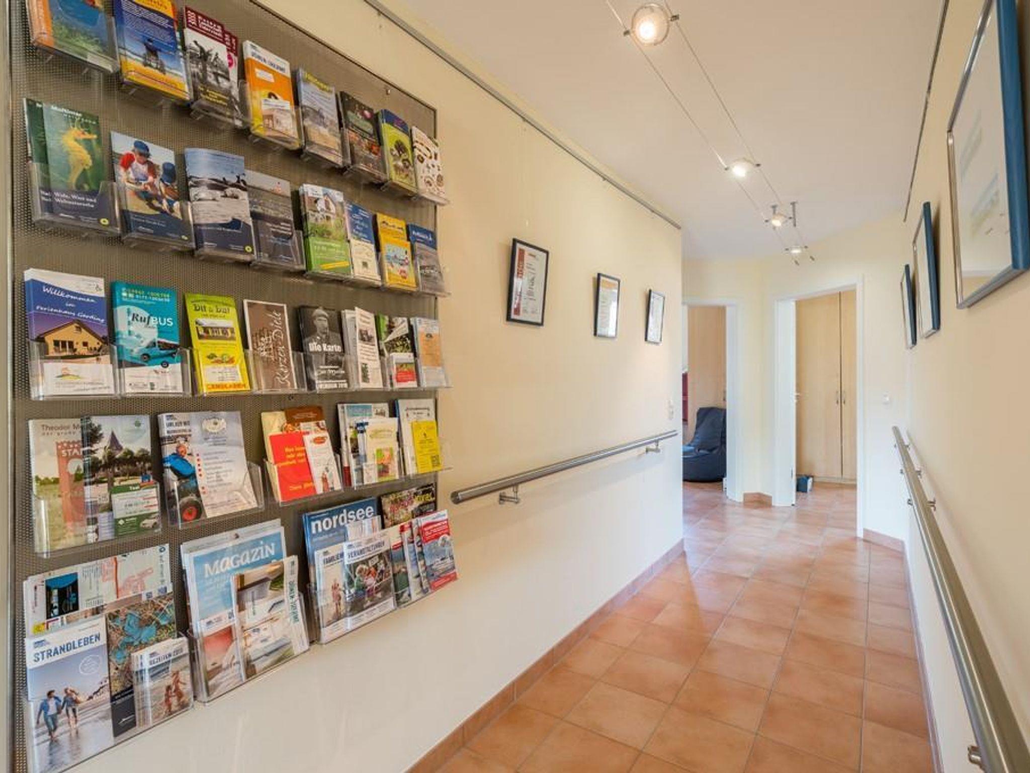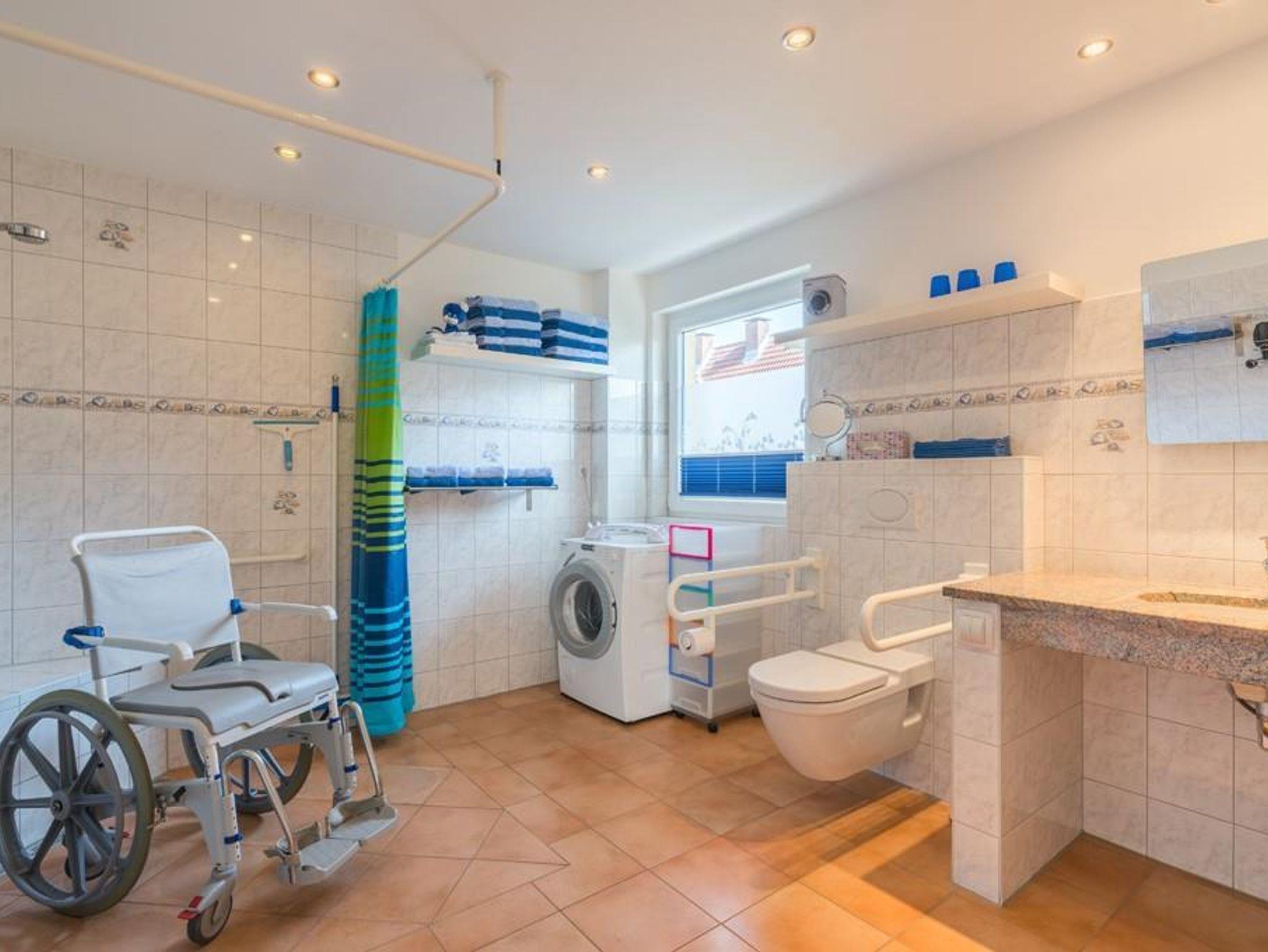 Willkommen im Erholungsort Garding in unserem Ferienhaus. ~ 4-Sterne Wohnen; Kinderplus und Rolliplus zertifiziert~ Es enthält eine moderne und komplett ausgestattete Einbauküche die offen zum großen, sonnendurchfluteten Wohnzimmer ist. Der Esstisch kann bei Bedarf erhöht werden und ist dann auch für E Rollis unterfahrbar. Höhenverstellbare Kinderstühle stehen auf Wunsch kostenfrei zur Verfügung. Die große Südterrasse ist schwellenfrei zu erreichen und komplett möbliert. Sie inspiriert zu einem Frühstück im Sonnenschein und zu einem gemütlichen Abend im Licht der untergehenden Sonne. Die Küche ist ausgestattet für bis zu 12 Personen und bietet einen Geschirrspüler sowie diverse andere Haushaltsgeräte. Die Tür zum großen Bad öffnet sich auf Wunsch automatisch. Dort gibt es eine bodengleiche Dusche (150 x 150 cm) mit einer 52 cm hohen Bank. Das WC ist 50 cm hoch und hat Stützgriffe. Der Waschtisch ist unterfahrbar, der Spiegel ist kippbar. Flexibel einsetzbare Haltegriffe unterstützen Sie. Ein Duschstuhl oder ein Duschrollstuhl stehen auf Wunsch kostenfrei zur Verfügung. Zusätzlich ist ein Gäste WC vorhanden. LAN Anschluss und SAT TV Anschluss sind in jedem Zimmer vorhanden. Zwei Schlafzimmer sind mit Doppelbetten ausgestattet. Die Höhe von 50 cm ermöglicht einen bequemen Aus- und Einstieg. Die Lattenroste sind elektrisch höhenverstellbar. Fliegengitter schützen vor ungebetenen Besuchern, verdunkelnde Plissees ermöglichen Schlafen zu jeder Zeit. Im Kinderzimmer steht ein Kojenbett, es enthält im Auszug ein weiteres Bett. In diesem Zimmer befinden sich zahlreiche Spiele für alle Altersklassen. Auch hier schützen Fliegengitter und verdunkelnde Plissees. Kinderbetten stehen auf Wunsch kostenfrei zur Verfügung. Ein Spielplatz mit Rutsche und drei Schaukeln auf der Rückseite des Hauses, eine Liegewiese und eine weitere Terrasse ermöglichen schöne Stunden. Im Gartenhaus stehen den Gästen drei Frühstücksfahrräder und viele weitere Fahrzeuge zur Verfügung. Die Unterbringung von mitgebrachten Fahrrädern ist auch möglich. Ebenfalls gehören zum Haus zwei großzügige Parkplätze.